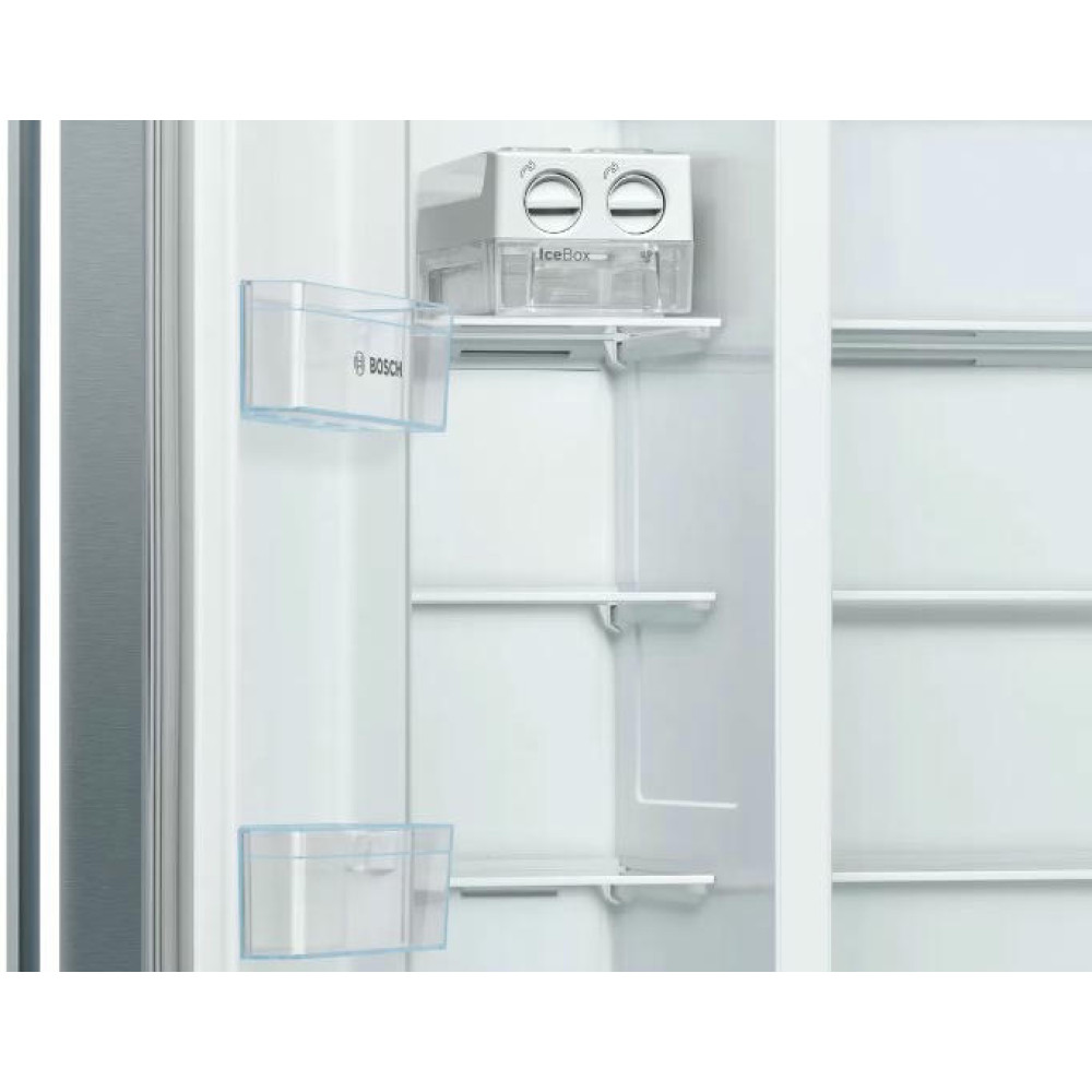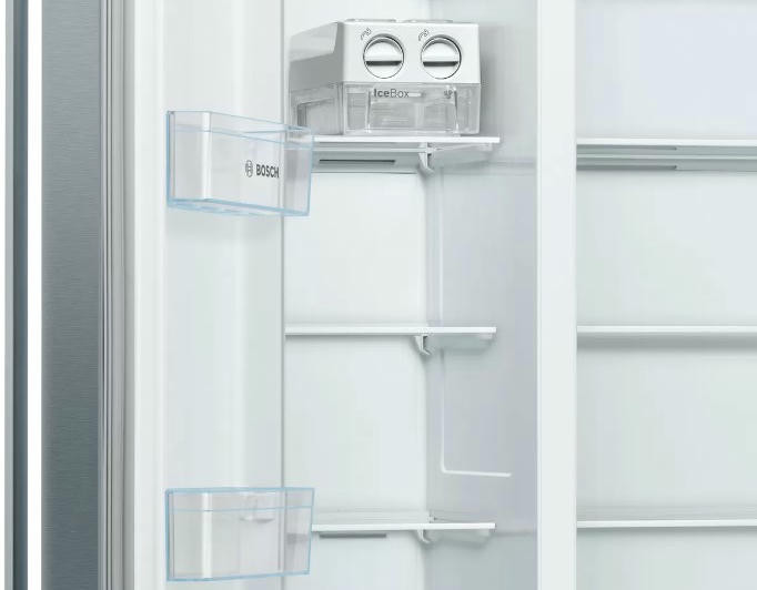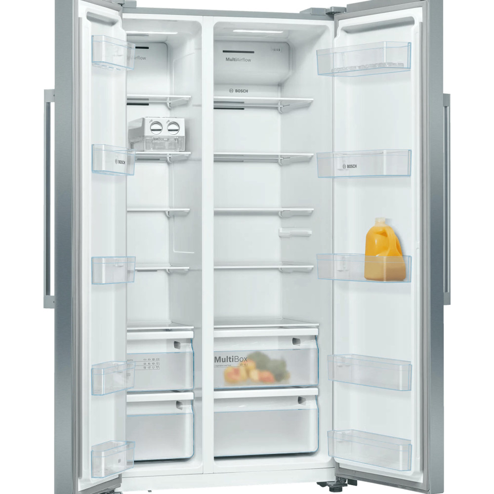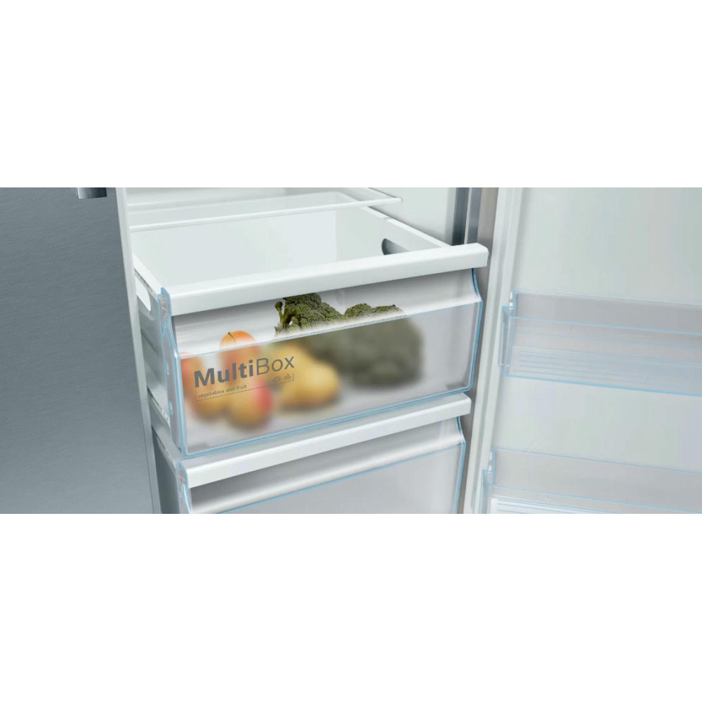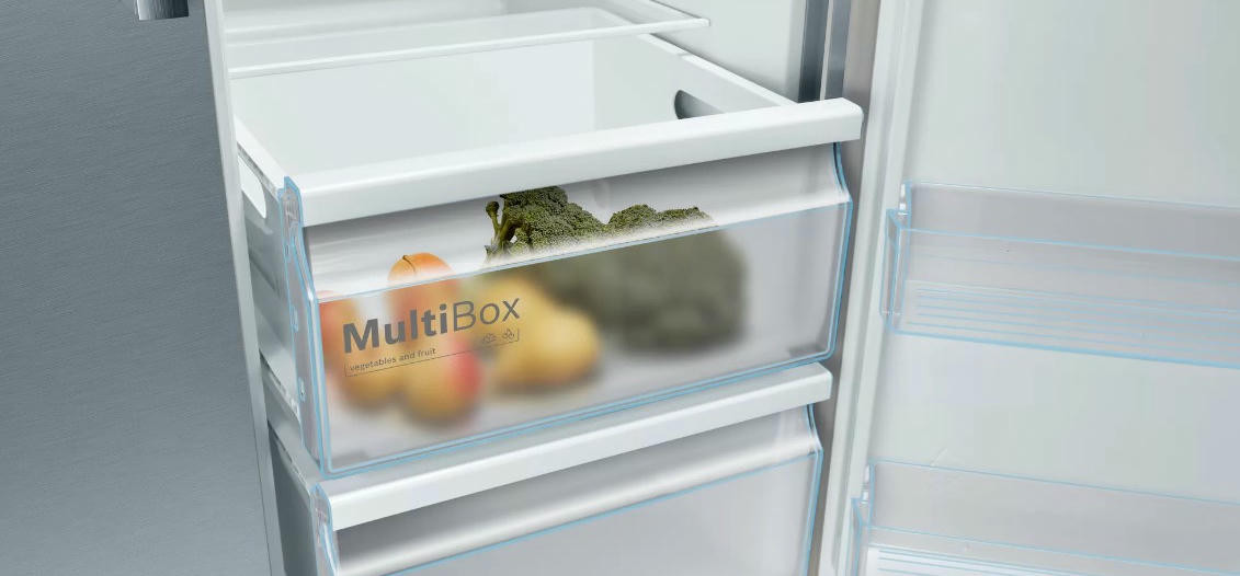 Отдельностоящий холодильник Bosch KAN93VL30R оснащен большой морозильной камерой с полками: заготавливайте больше продуктов! Side-by-Side означает, что холодильное и морозильное отделение находятся бок о бок друг с другом. Система MultiBox — это прозрачный ящик с волнистым дном, который сохраняет свежесть фруктов и овощей, и легко моется.