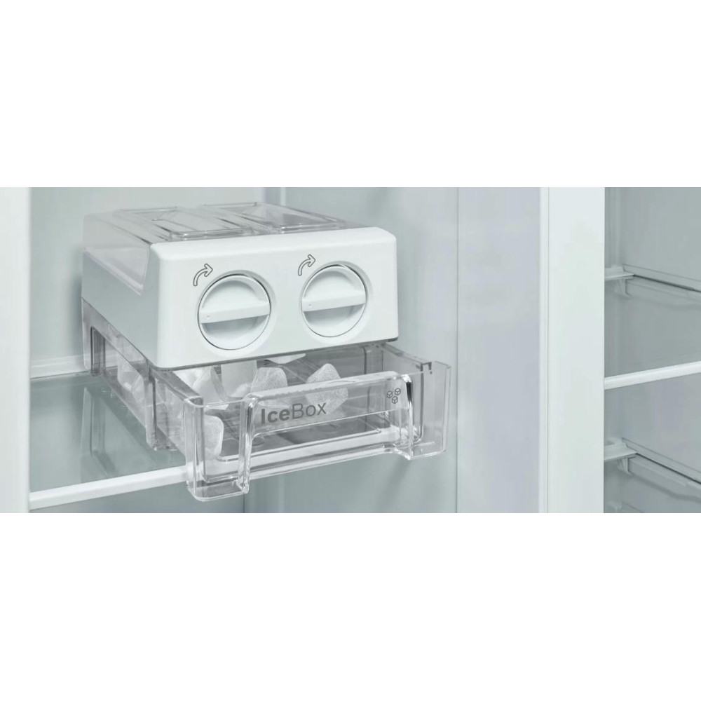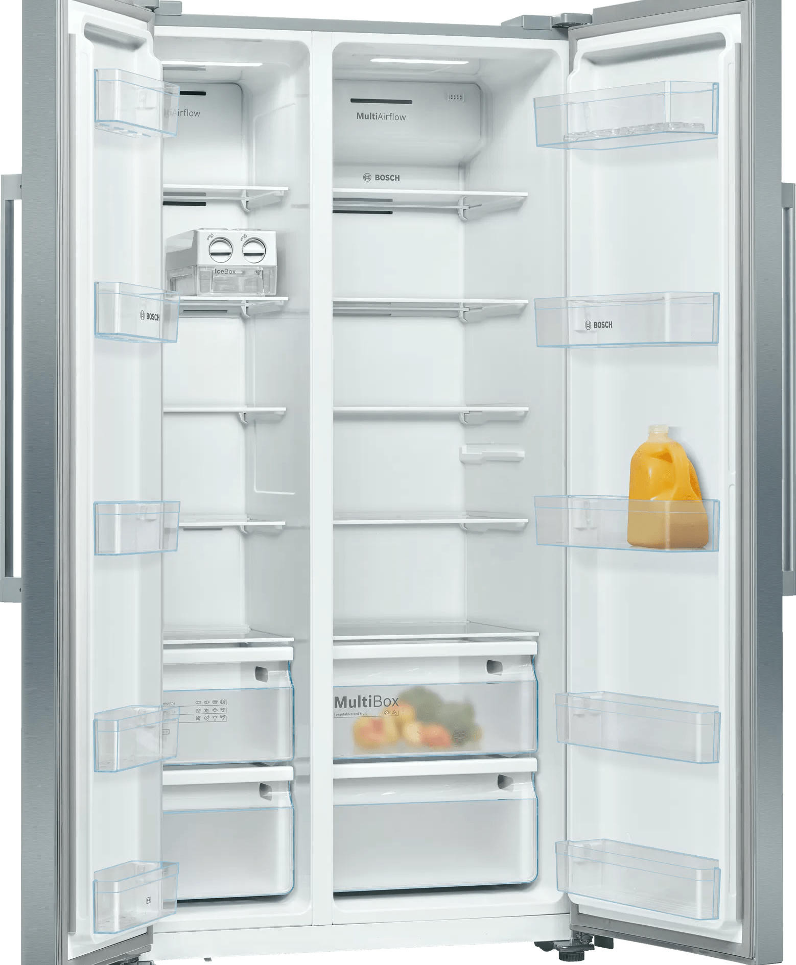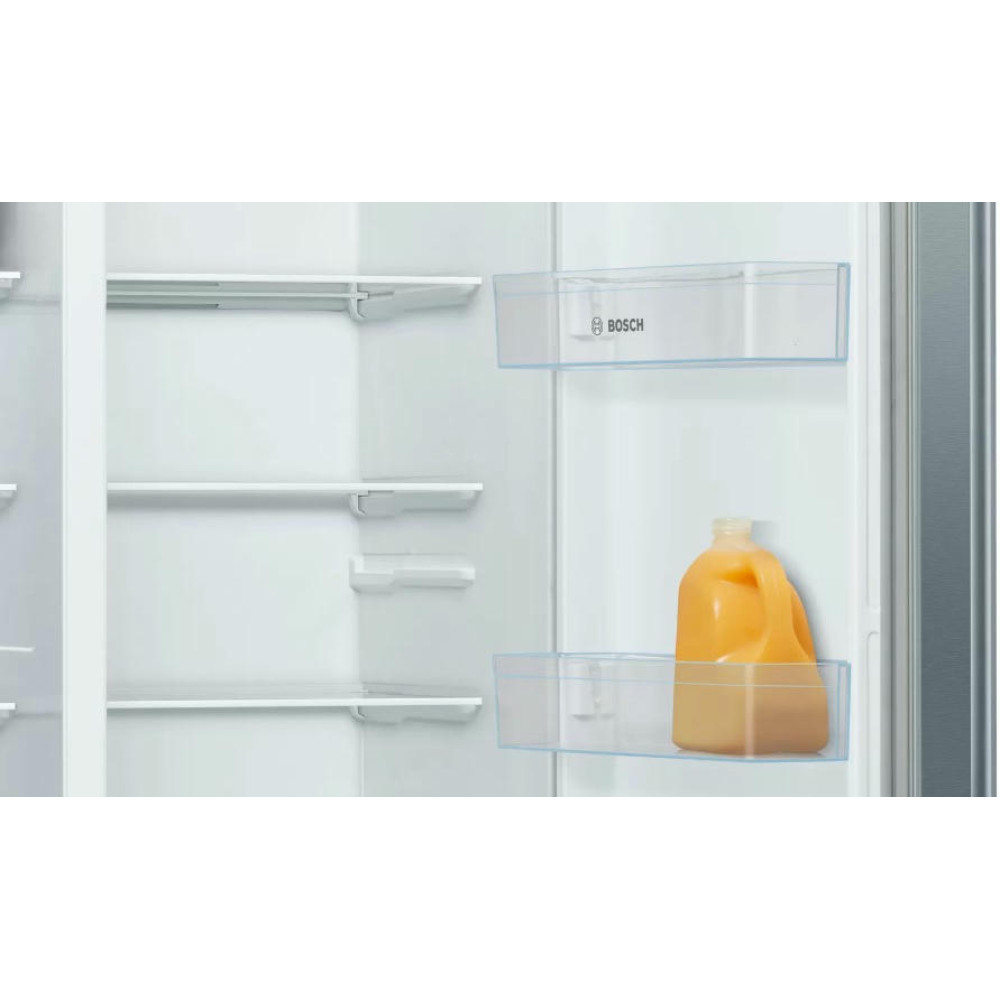 Отдельностоящий холодильник Bosch KAN93VL30R оснащен большой морозильной камерой с полками: заготавливайте больше продуктов! Side-by-Side означает, что холодильное и морозильное отделение находятся бок о бок друг с другом. Система MultiBox — это прозрачный ящик с волнистым дном, который сохраняет свежесть фруктов и овощей, и легко моется.