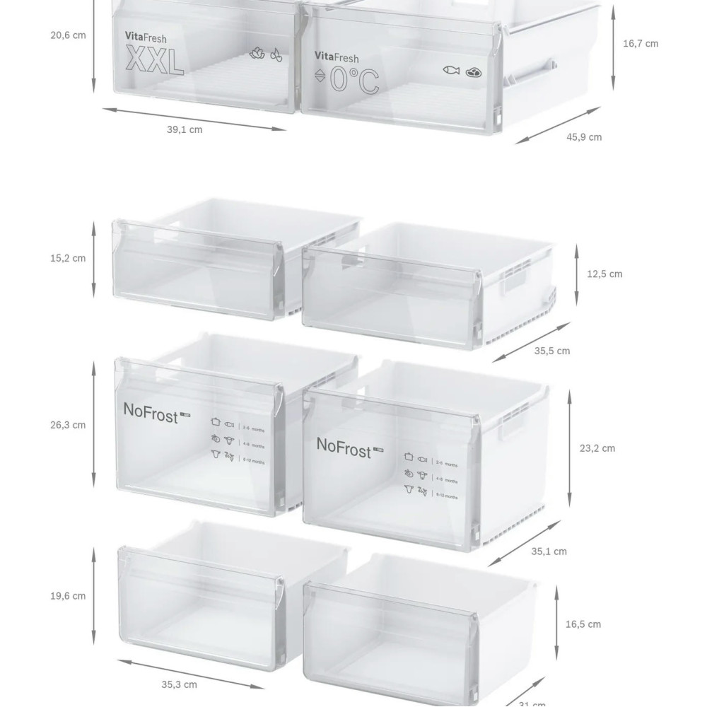 Встроенная функция "Отпуск" позволяет снизить энергопотребление, когда холодильник не используется в течение длительного времени. Система охлаждения No Frost и автоматическая система размораживания холодильной камеры обеспечивают стабильную температуру и предотвращают образование инея. Система MultiAirflow обеспечивает равномерное распределение холодного воздуха, а функция суперохлаждения позволяет быстро охладить свежие продукты. В холодильной камере есть три полки, из которых две регулируемые, и одна фиксированная, пять полок на дверце и подставка для яиц. Все полки изготовлены из высокопрочного стекла, что обеспечивает их долговечность и удобство в использовании. Морозильная камера также оснащена системой NoFrost и автоматической системой размораживания, а также функцией суперзамораживания SuperFreezing для быстрого замораживания продуктов. В морозильной камере есть шесть ящиков, включая большой ящик BigBox для хранения крупногабаритных продуктов. Он работает на стандартном напряжении 220-240 В и частоте тока 50-60 Гц. Уровень шума составляет всего 38 дБ, что делает его практически бесшумным.