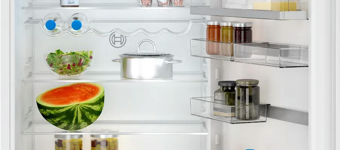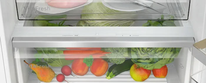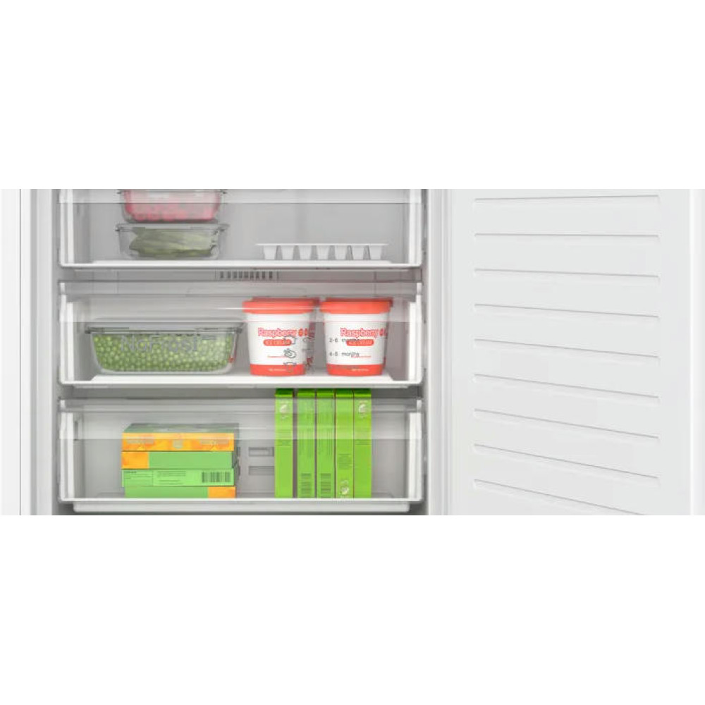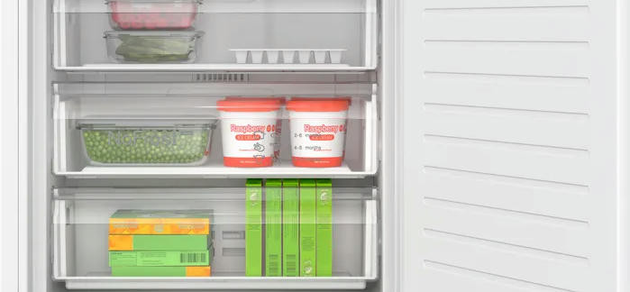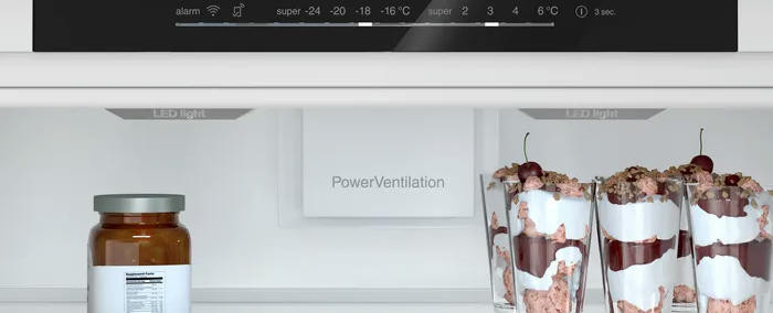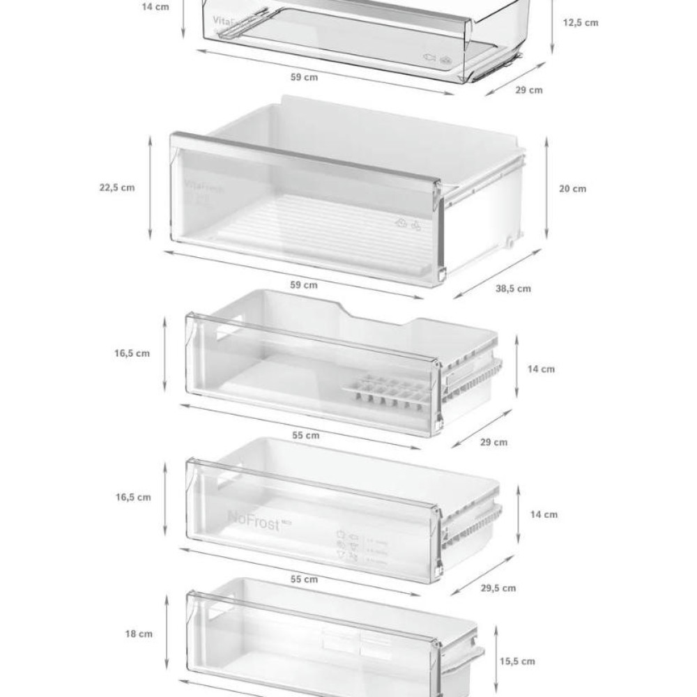 Внутреннее освещение холодильной камеры выполнено на светодиодах, что обеспечивает яркое и равномерное освещение. В морозильной камере предусмотрено три ящика, а также ванночка для льда. Система охлаждения NoFrost предотвращает образование инея, а автоматическая система размораживания облегчает уход за холодильником.