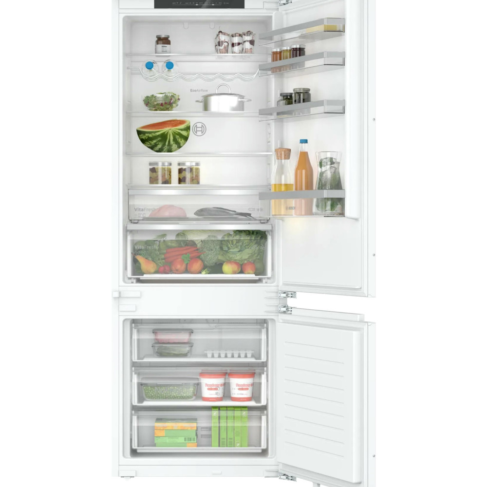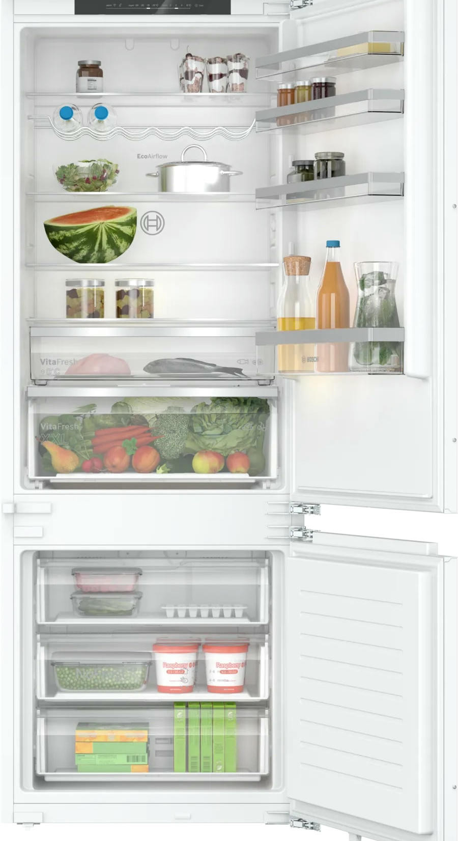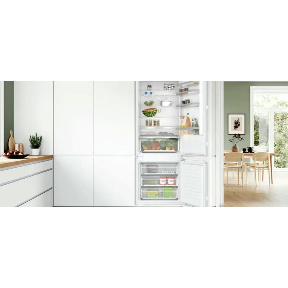 Встраиваемый двухкамерный холодильник Bosch KBN96VFE0 идеально впишется в современную кухонную мебель благодаря продуманной конструкции для встраивания: ниша 193.5–194.3 х 71 х 56 см позволяет смонтировать прибор почти без зазоров, а монтаж плоских шарниров обеспечивает аккуратную интеграцию и ровную линию дверного фаса.