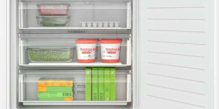 Морозильная камера реализована по технологии NoFrost, полностью исключающей образование инея внутри, и также оснащен автоматической системой размораживания. Функция SuperFreezing (суперзамораживание) оперативно снижает температуру при загрузке свежих продуктов, а мощность замораживания 9.5 кг/24 ч обеспечивает быстрое превращение продуктов в безопасные для длительного хранения порции. При отключении питания автономное сохранение холода достигает 13 часов, что даёт дополнительную защиту содержимого.