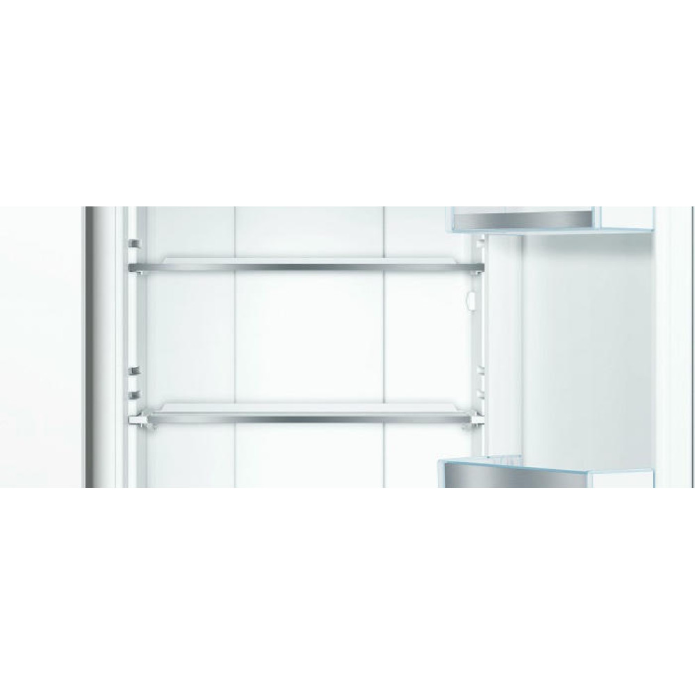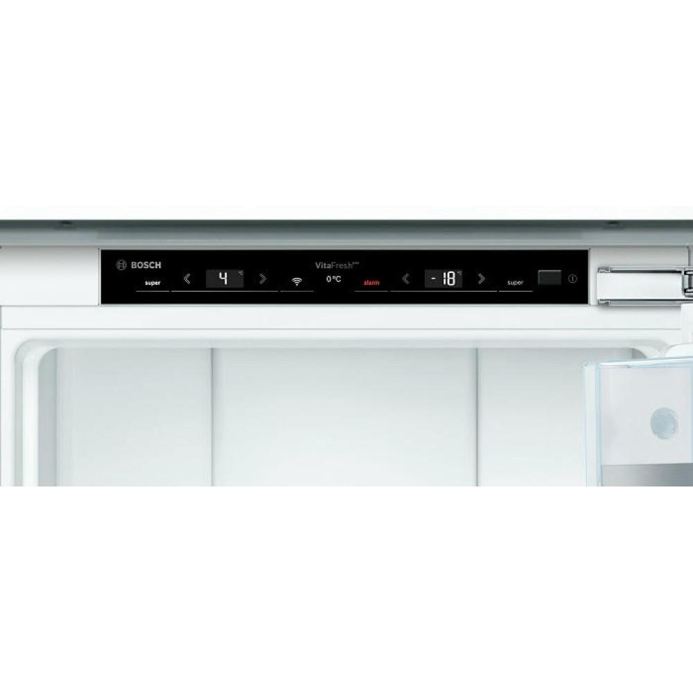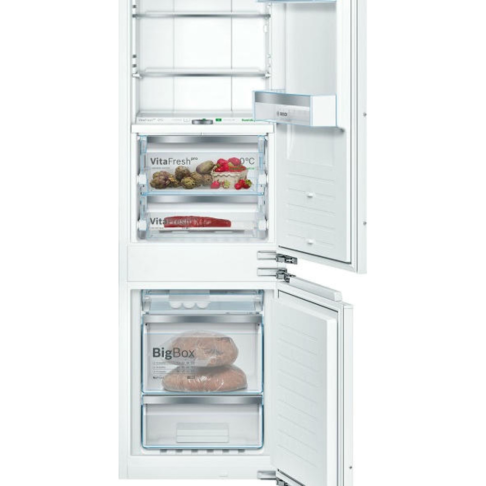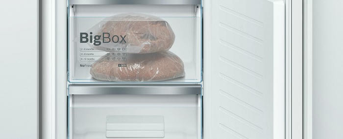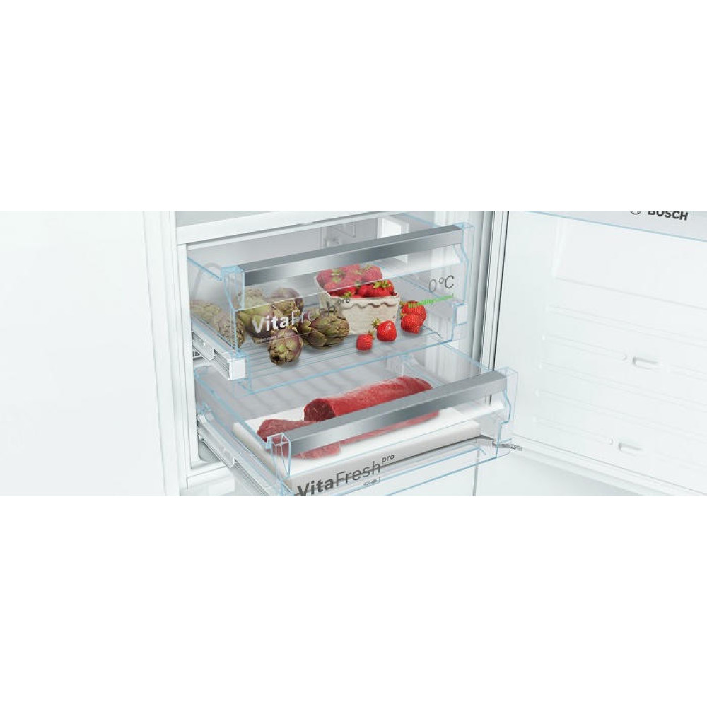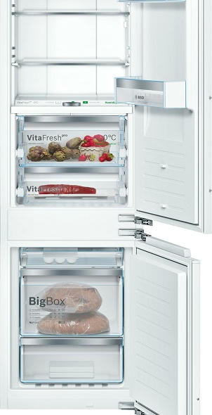 Двухкамерный холодильник Bosch KIF86HD20R — встраиваемая модель с зоной свежести с VitaFresh pro и системой охлаждения NoFrost. Морозильная камера расположена снизу, оснащена 3 ящиками для хранения продуктов, включая BigBox. Холодильное отделение укомплектовано 3 полками из закаленного стекла, 2 из которых можно переставлять по высоте, а также 2 зонами свежести VitaFreshPro и VitaFreshPro 0°C. Управление осуществляется непосредственно с помощью функции TouchControl и синхронизации с приложением Home Connect.