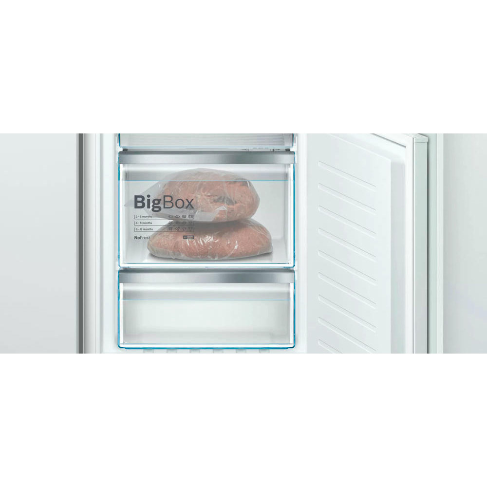 Ящик для замороженных продуктов BigBox в морозилке подходит для крупных упаковок. Выдвижная стеклянная полка EasyAccess удобна для загрузки и выгрузки продуктов. Контейнер зоны свежести предназначен для продления срока хранения овощей и фруктов.