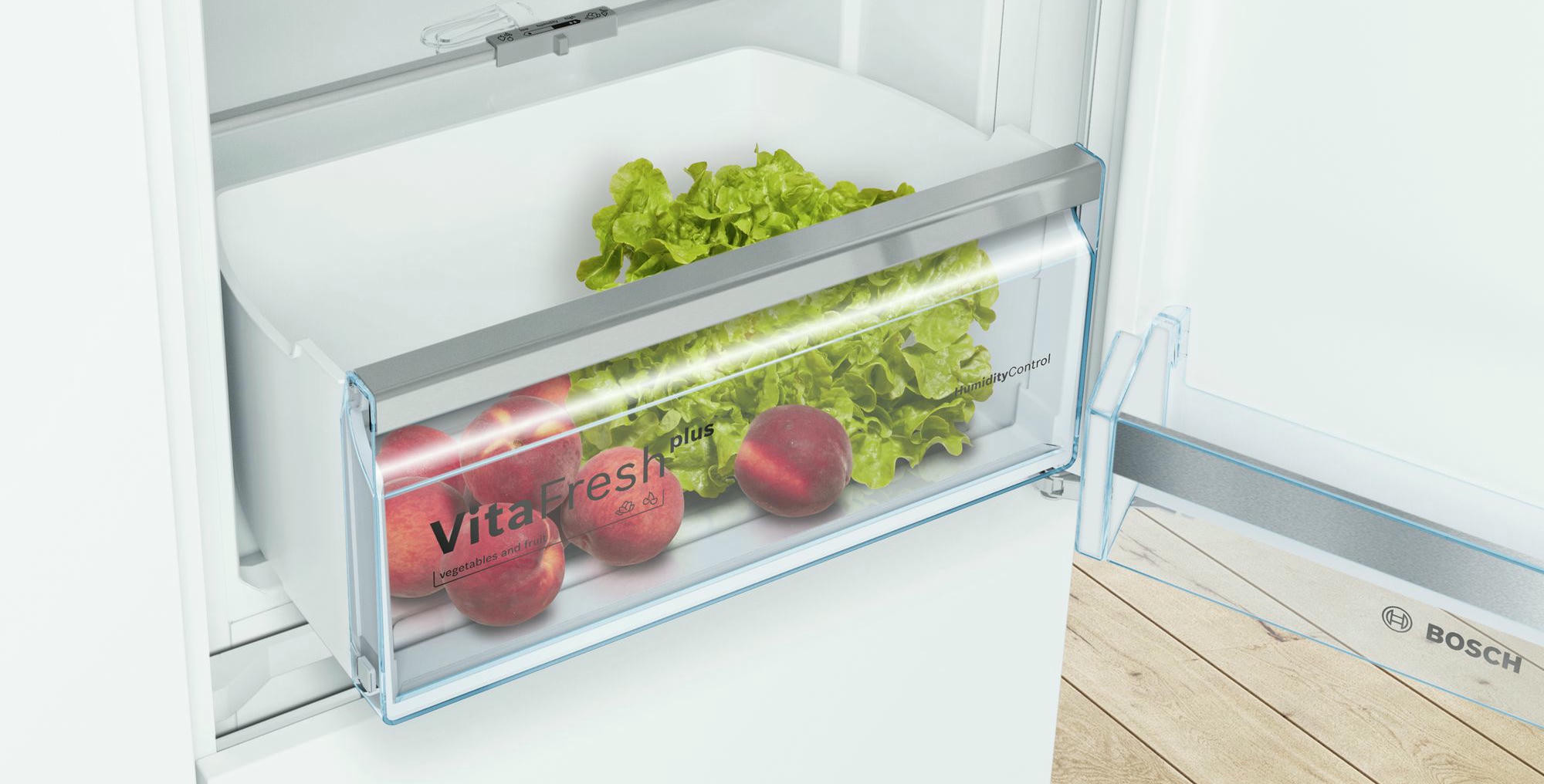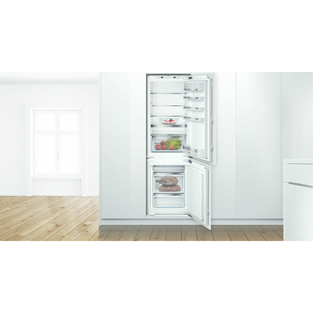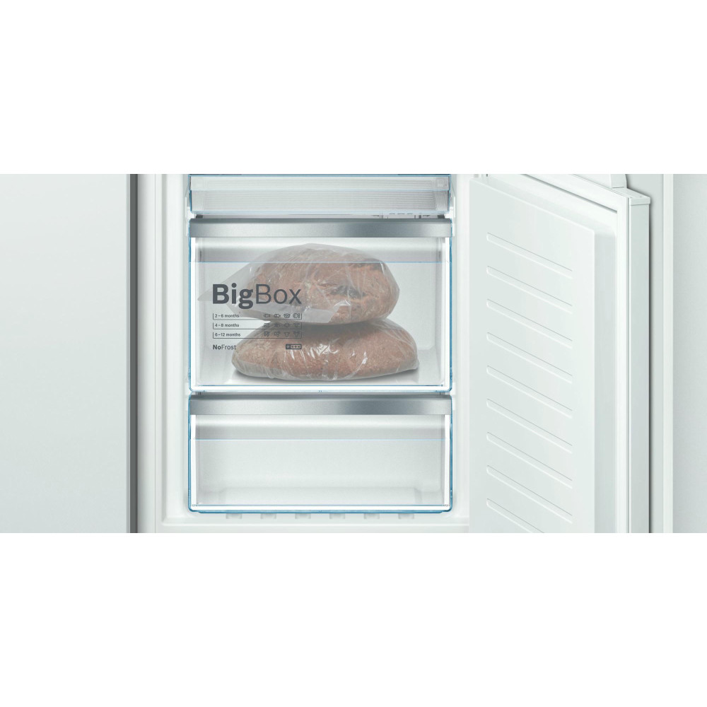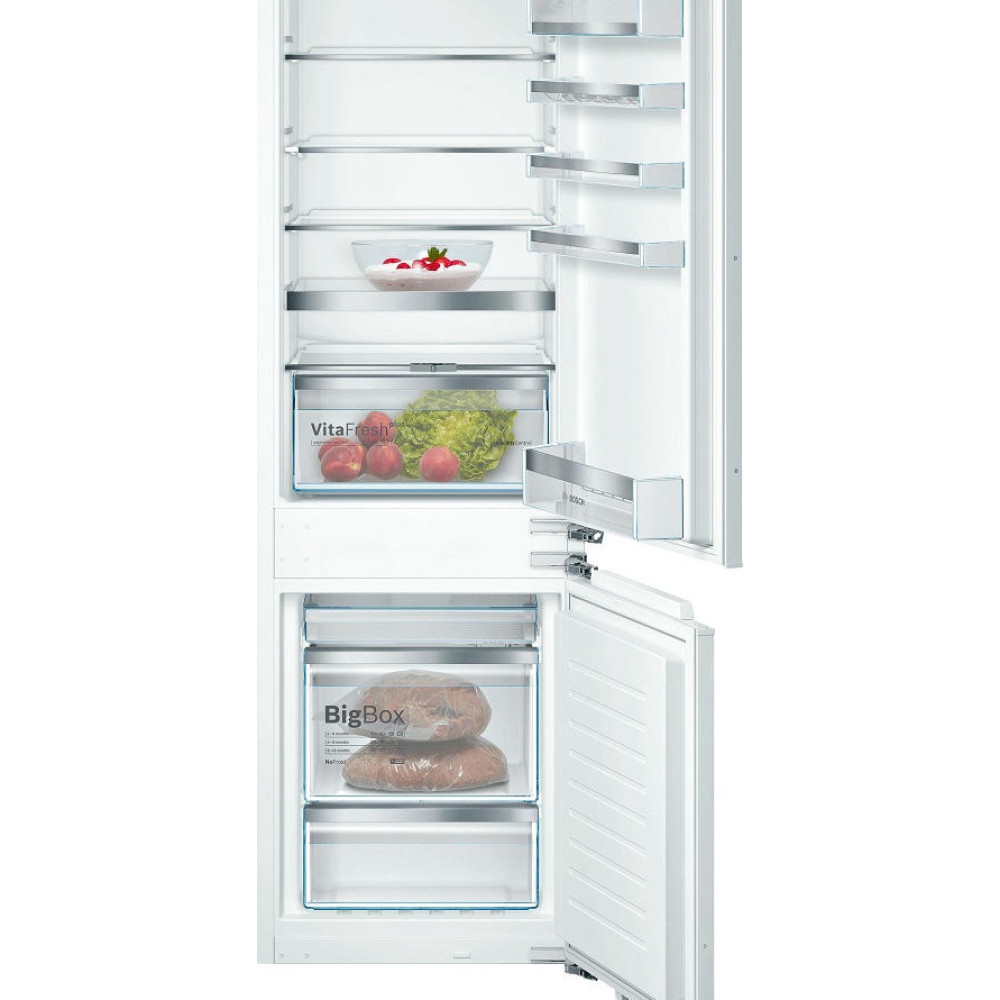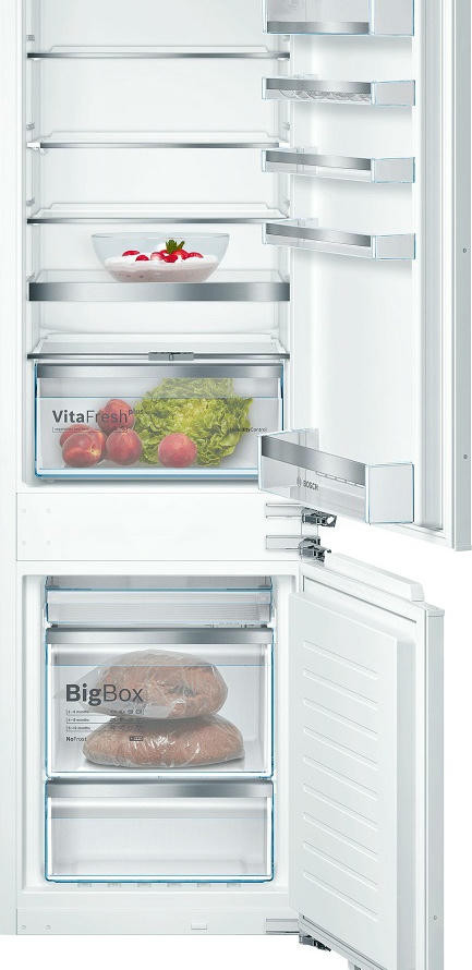 Двухкамерный холодильник Bosch KIN86HD20R — встраиваемая модель с зоной свежести VitaFresh plus. Светодиодная подсветка ярко и равномерно освещает холодильную камеру холодильника. Благодаря системе NoFrost нет необходимости в размораживании прибора. В морозильной камере расположен большой ящик для замороженных продуктов BigBox.