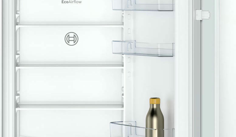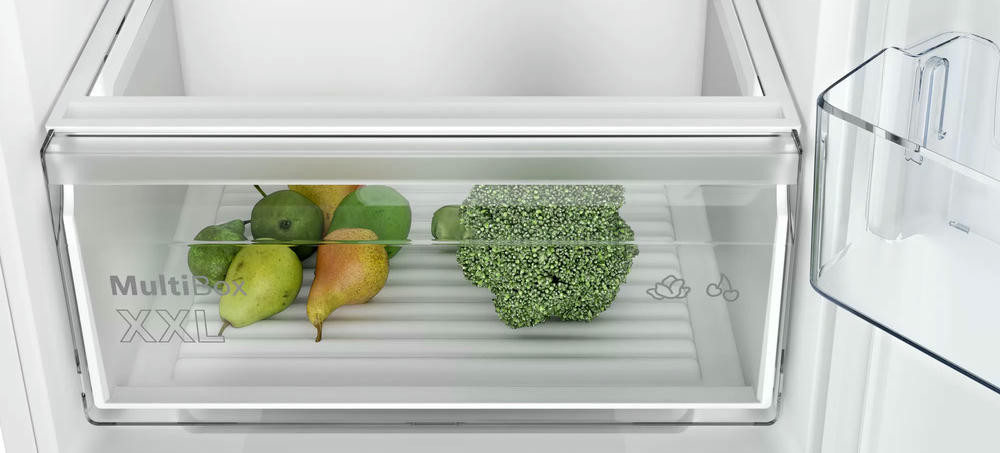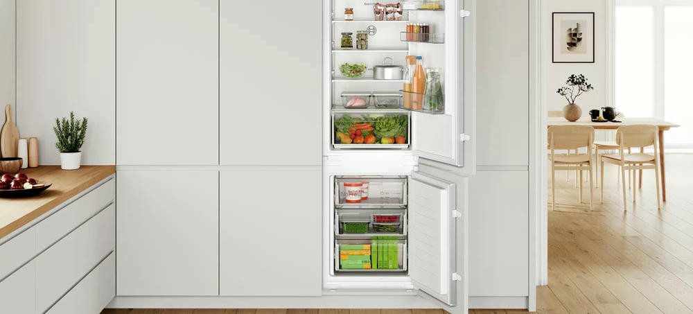 Встраиваемый двухкамерный холодильник Bosch KIN86NSF0 оснащен светодиодным освещением, не создает бликов, а также не требует постоянного замена. Контейнер Multi Box XXL позволяет вмести целый арбуз. Технология FreshSense сохраняет приятный климат для продуктов, не делая их слишком мягким или твёрдыми.