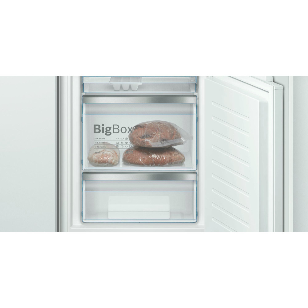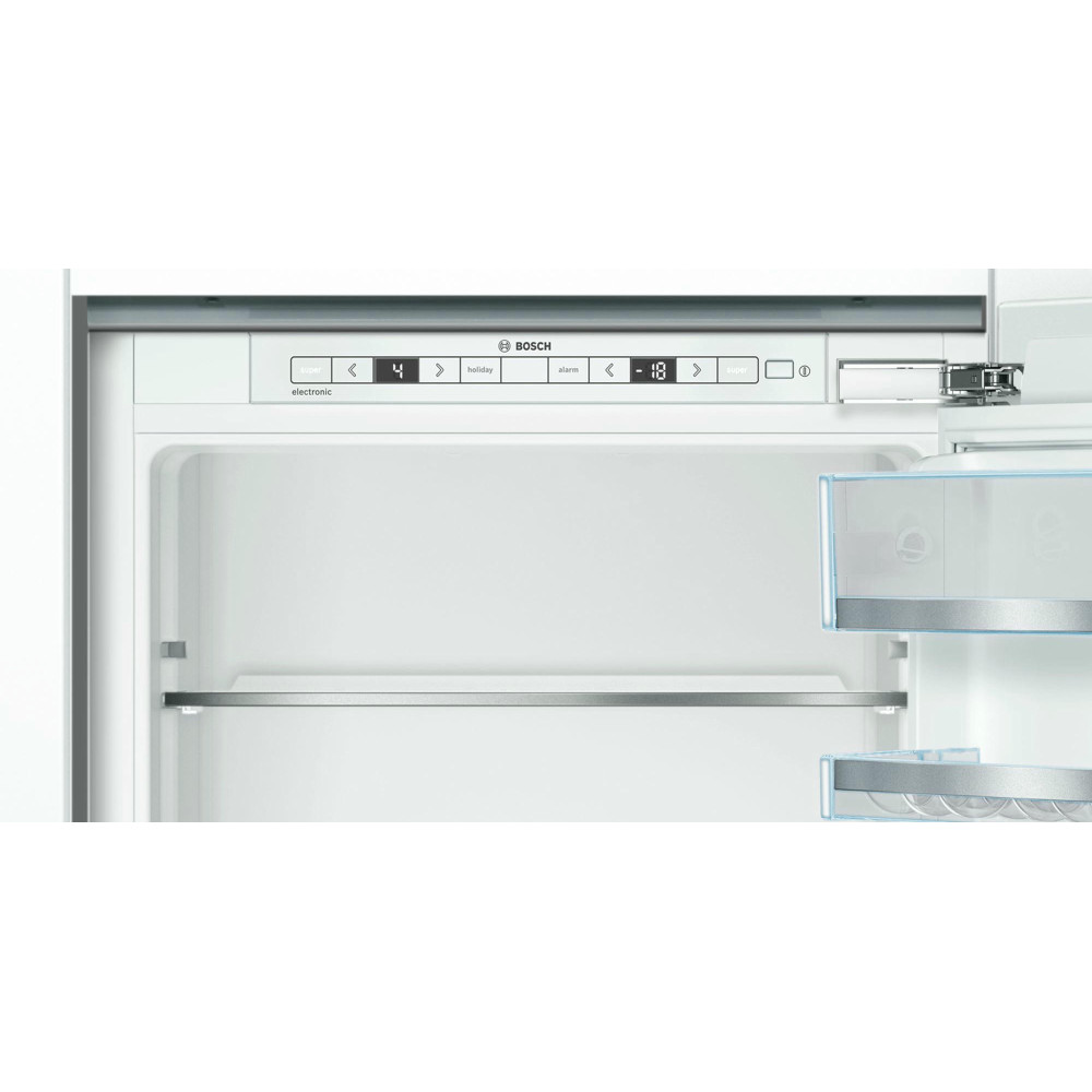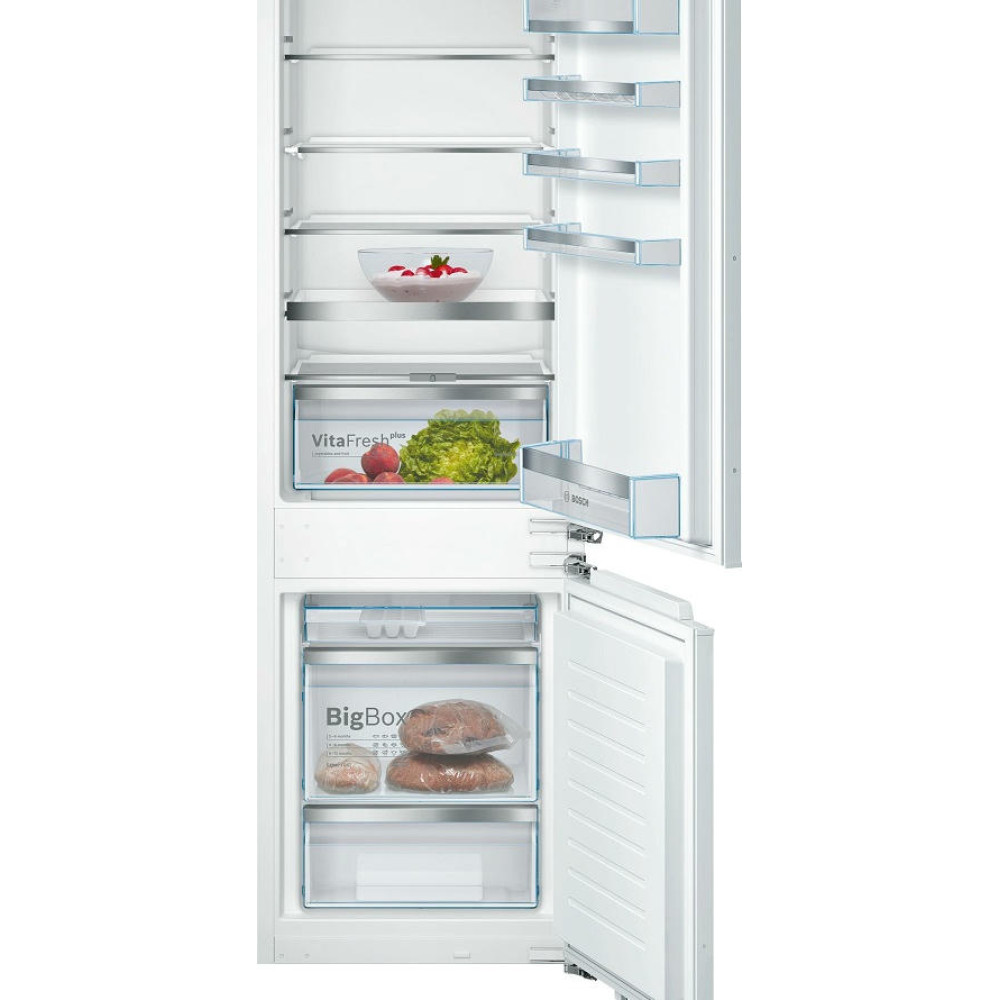Двухкамерный холодильник Bosch KIS86AF20R — это встраиваемая модель с нижней морозильной камерой и зоной VitaFresh. Продуманный и компактный прибор имеет большую вместимость 265 л, из которых на морозильник приходится 74 л. Этого более чем достаточно для того, чтобы разместить продуктовые запасы на семью из 4-5 человек.