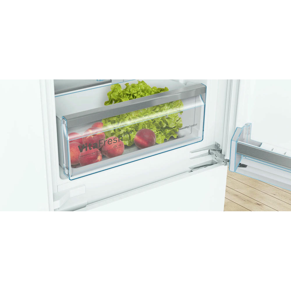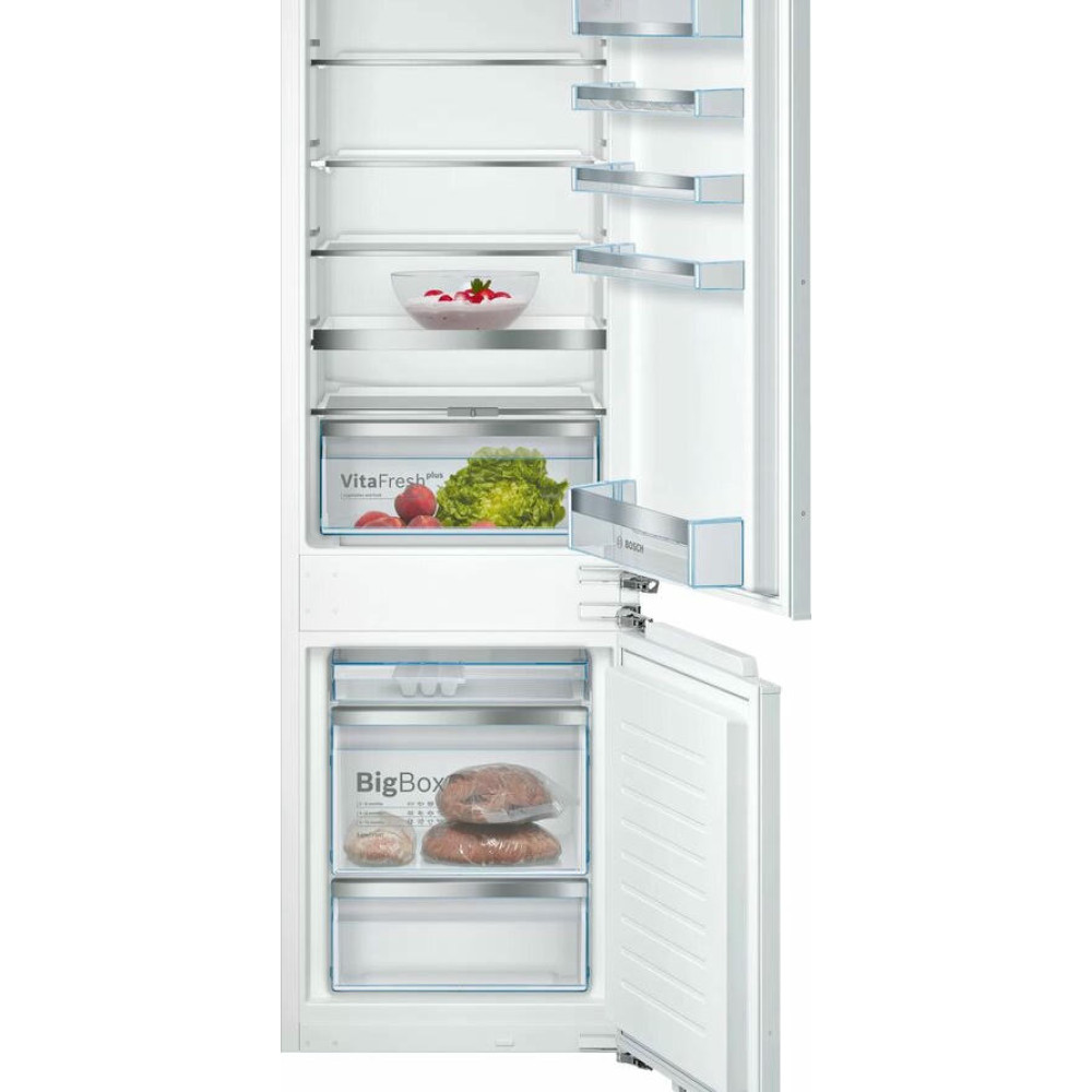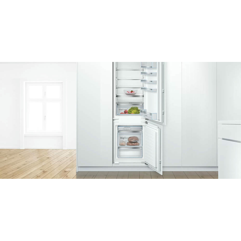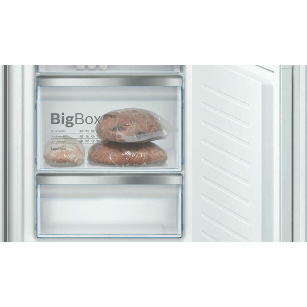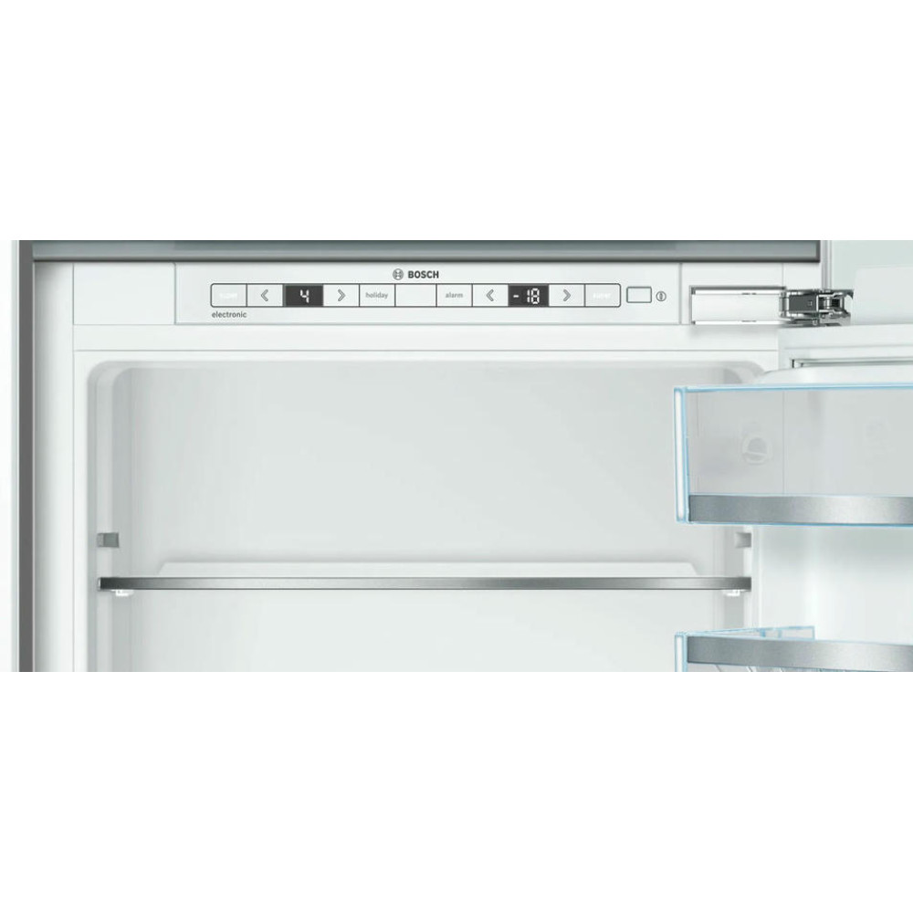 Встраиваемый двухкамерный холодильник Bosch KIS86AFE0 имеет классический форм-фактор. Морозильная камера на 74 литра расположена снизу, холодильная, объемом 192 литра, в верхней части прибора. Удобная контрольная панель с LCD-дисплеем обеспечивает контроль и регулировку температуры, а технология плоских шарниров обеспечивает мягкое и бесшумное закрывание дверей. При отключении электроэнергии, данный холодильник способен поддерживать свежесть продуктов на протяжении 32 часов. Есть функция «Отпуск» — техника продолжает работать, чтобы воздух внутри не застаивался, но потребляет минимум мощности.