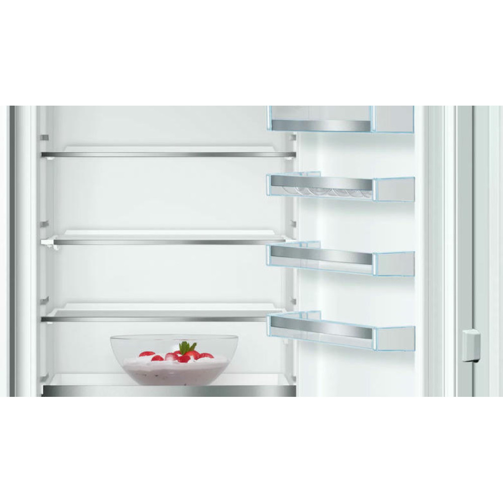 Общее количество полок в холодильной камере Бош KIS86AFE0 — пять, из которых 4 регулируются по высоте. На дверце расположено 5 полок, также имеется 2 подставки для яиц. Внутреннее освещение холодильной камеры светодиодное. В холодильнике предусмотрена зона свежести типа VitaFresh.