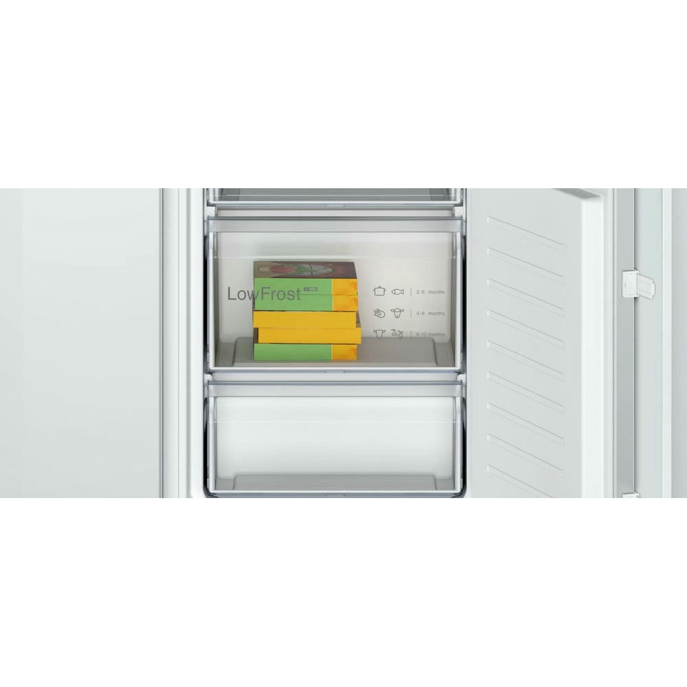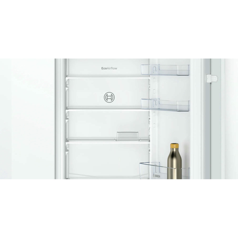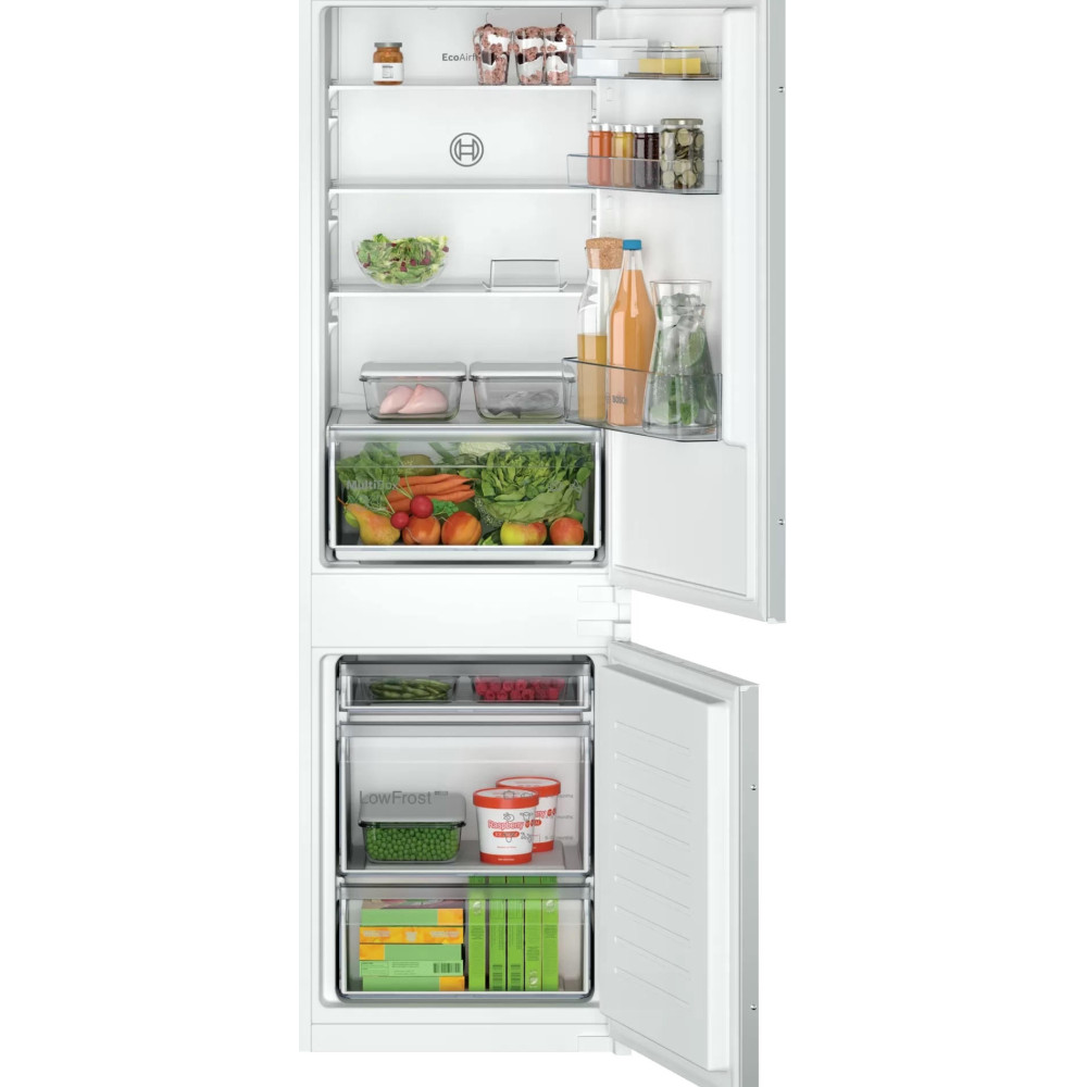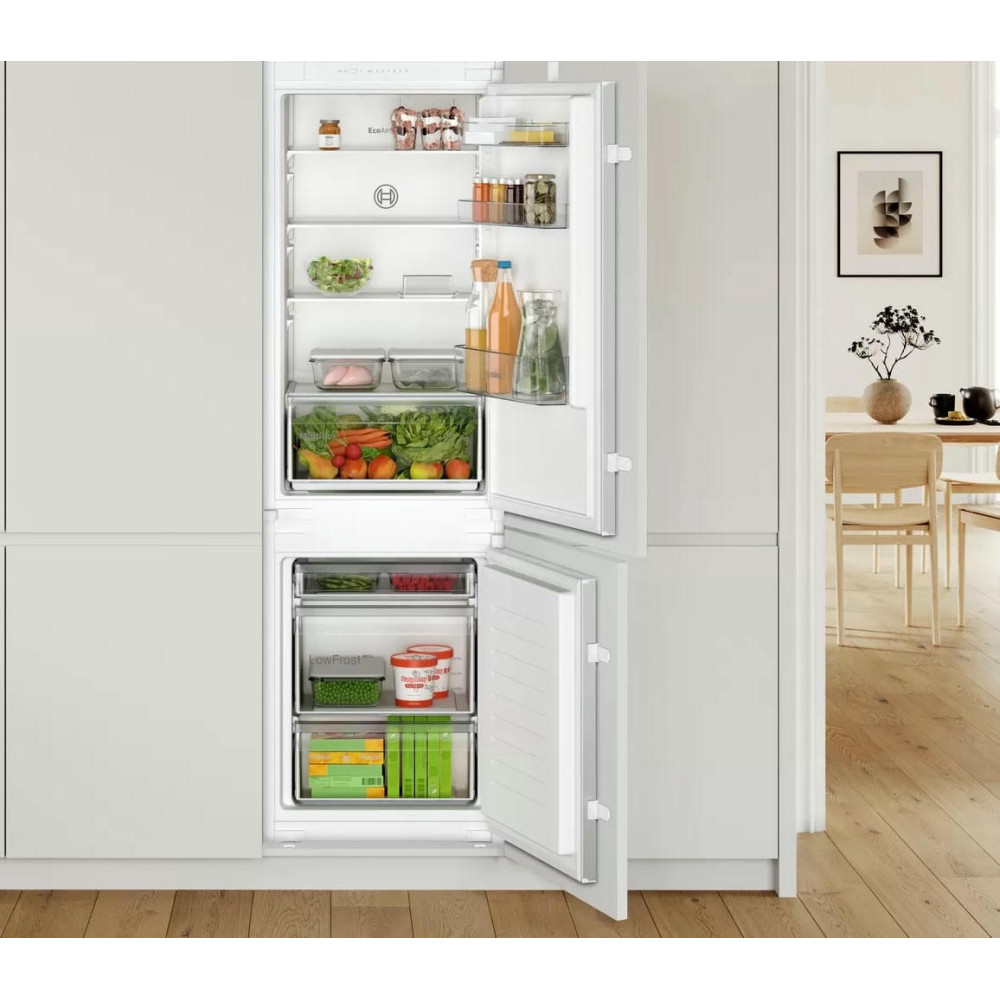 Двухкамерный холодильник Bosch KIV 865 SF0 - встраиваемая модель с ящиком для овощей и фруктов MultiBox. Благодаря циркуляции EcoAirflow поддерживается постоянная температура по всей холодильной камере. Система охлаждения LowFrost уменьшает обледенение морозильной камеры, излишняя влага отводится наружу через специальное отверстие.