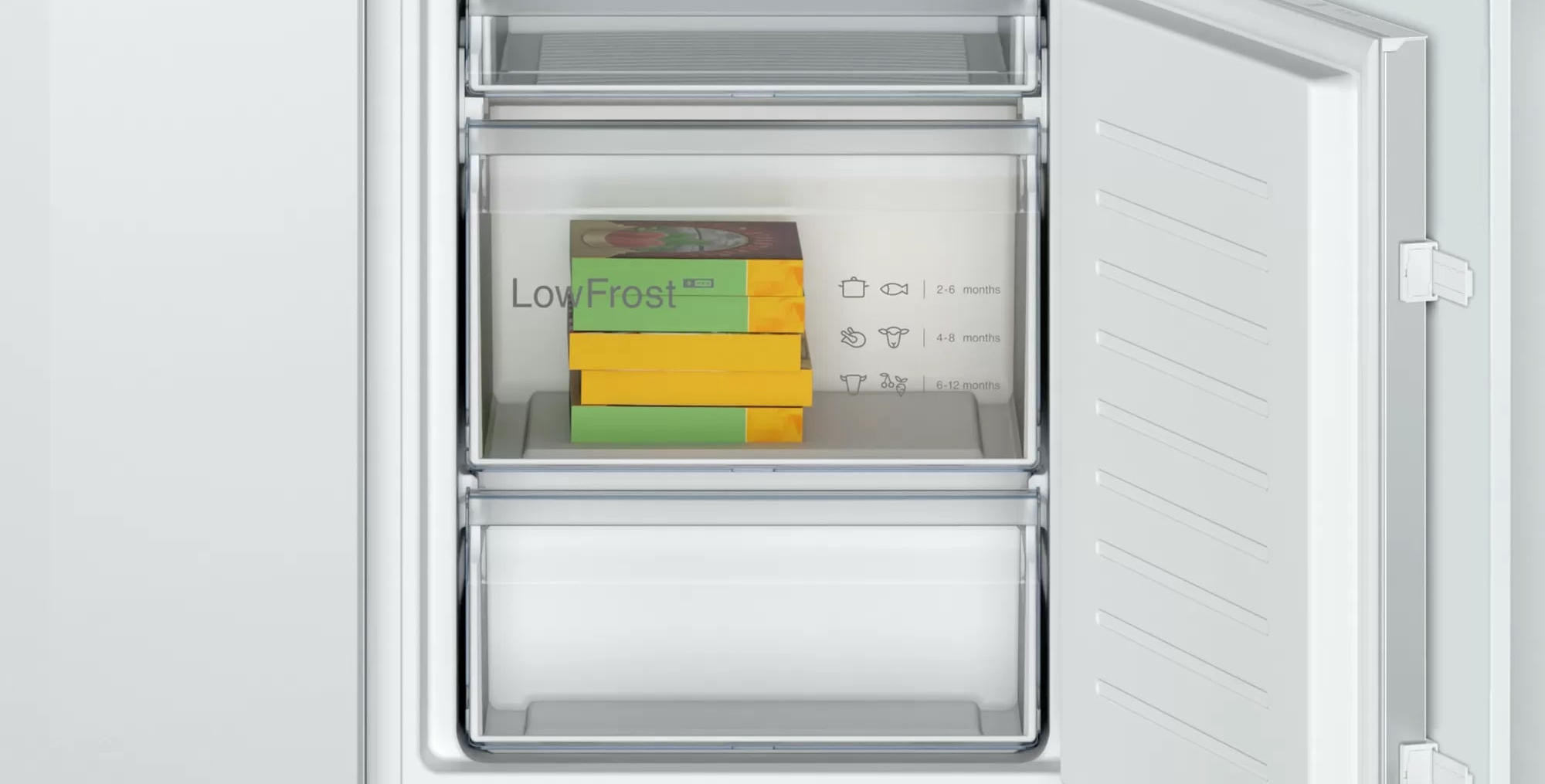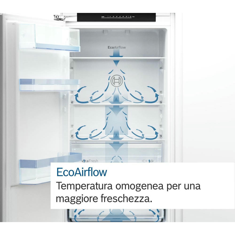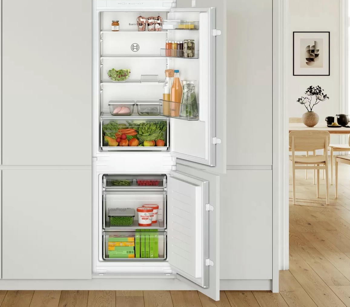 Двухкамерный холодильник Bosch KIV 865 SF0 - встраиваемая модель с ящиком для овощей и фруктов MultiBox. Благодаря циркуляции EcoAirflow поддерживается постоянная температура по всей холодильной камере. Система охлаждения LowFrost уменьшает обледенение морозильной камеры, излишняя влага отводится наружу через специальное отверстие.