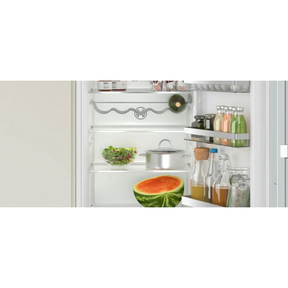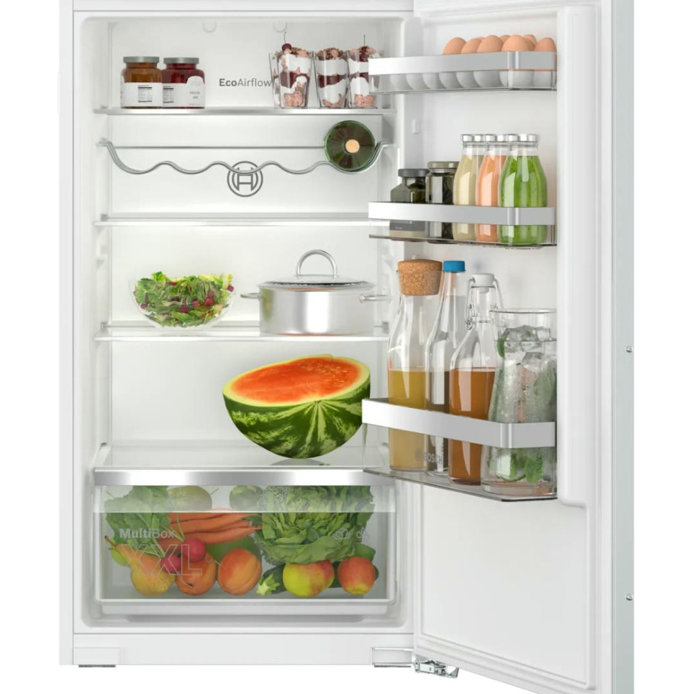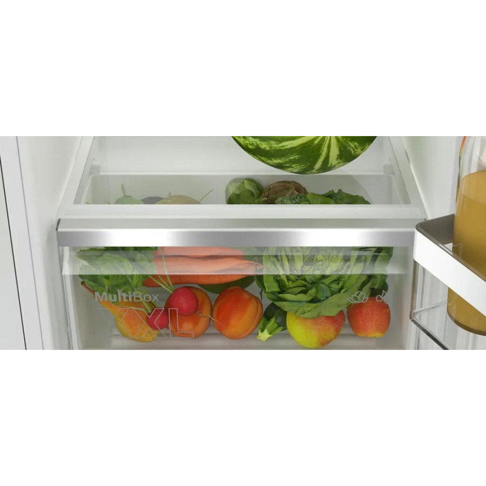 Встраиваемый однокамерный холодильник Bosch KIR31VFE0 имеет объём 165 л, где размещены четыре надёжные полки из высокопрочного стекла, из которых три регулируемые и одна фиксированная, что даёт свободу расположения и помогает оптимизировать размещение посуды и упаковок различной высоты. Выдвижной контейнер MultiBox с прозрачными стенками создан для хранения овощей и фруктов с комфортным доступом, а отдельная полка для бутылок и три отделения на дверце обеспечивают порядок и удобство при хранении контейнированных напитков и соусов. Светодиодное освещение эффективно освещает пространство, снижая нагрузку на глаза и облегчая поиск нужного продукта.