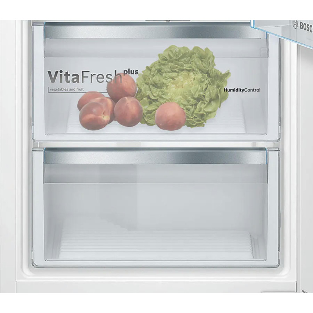 Внутреннее светодиодное освещение обеспечивает хорошую видимость содержимого. Особенностью является наличие зоны свежести VitaFresh plus, которая помогает сохранять продукты свежими на протяжении длительного времени. Холодильник оборудован одним стандартным компрессором и имеет класс энергопотребления E (старое обозначение A++), что гарантирует его энергоэффективность. В случае открытия двери или других ситуаций, предусмотрена звуковая сигнализация.