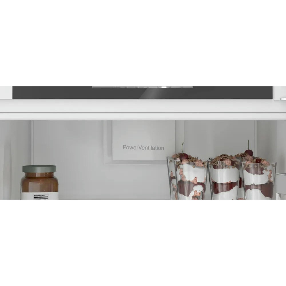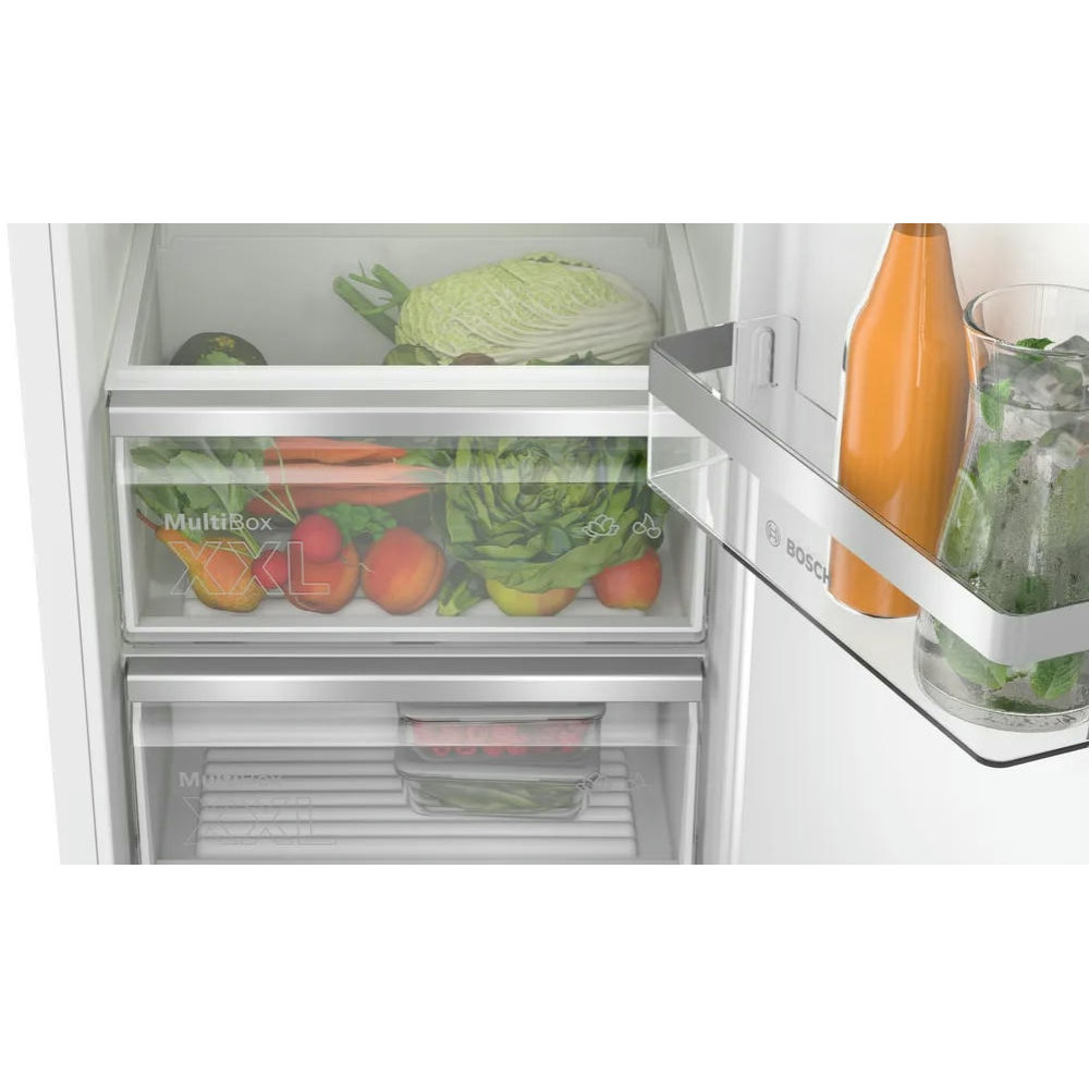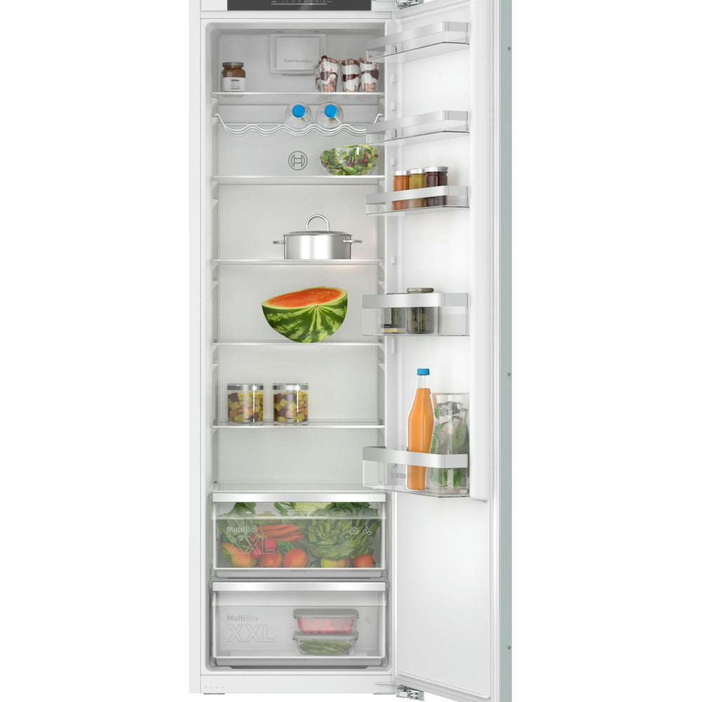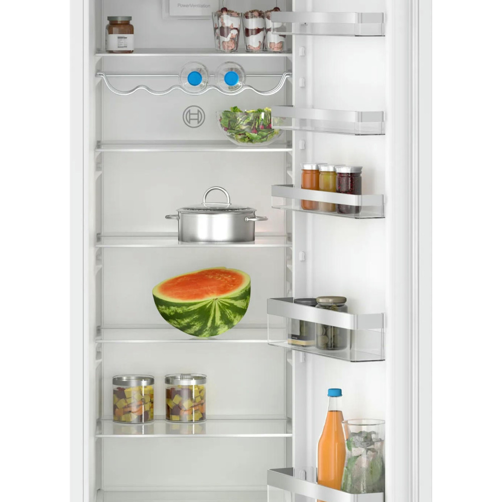 Встраиваемый однокамерный холодильник Bosch KIR81VFE0 оснащен объёмом 310 л для удобного использования : одна полноценная камера без морозильного отделения предоставляет ровные температурные условия для хранения продуктов, напитков и заготовок. Шесть полок в основной зоне, включая пять регулируемых и одну фиксированную, изготовлены из высокопрочного стекла и выдерживают повседневные нагрузки, а отдельная полка для бутылок позволяет компактно разместить ёмкости различной высоты. На дверце расположены пять полок, что увеличивает полезную площадь для мелкой тары и соусов, а продуманная внутренняя компоновка делает загрузку и извлечение предметов удобным и быстрым процессом.
