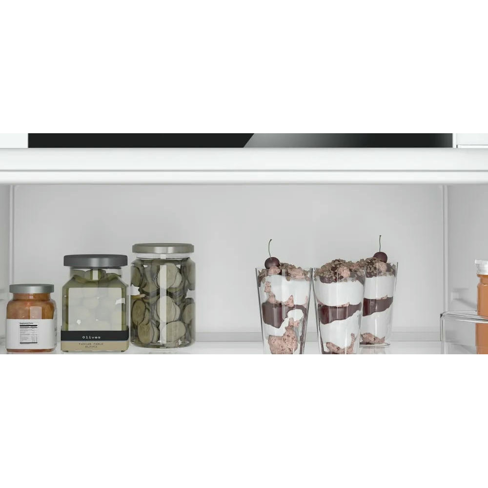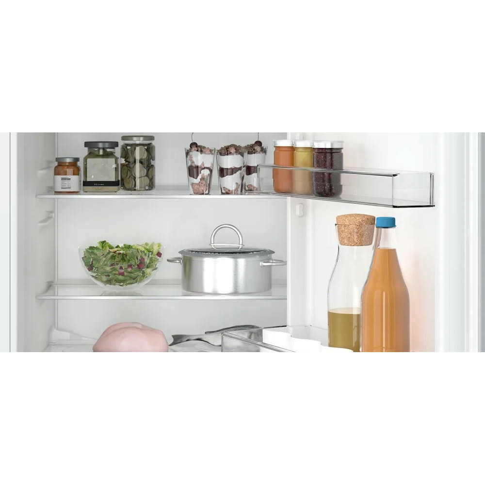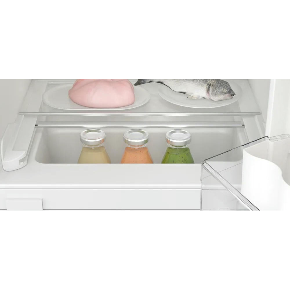 Встраиваемый однокамерный холодильник Bosch KUR21VFE0 выполнен в строгом белом цвете, который легко вписывается в современную кухонную мебель и обеспечивает визуальную чистоту рабочей зоны. Компактные габариты (высота 82 см, ширина 59.8 см, глубина 54.8 см) и точные размеры ниши для монтажа (82–90 x 60 x 55 см) делают прибор удобным для интеграции в ограниченное пространство, а возможность перенавешивания двери добавляет гибкости при планировке интерьера и позволяет адаптировать направление открывания к расположению корпуса. Правый дверной упор поставляется по умолчанию, но при необходимости его легко изменить, что расширяет варианты установки в шкафу. Невысокая масса нетто 28.6 кг облегчает транспортировку и монтаж, а длина сетевого кабеля 1.6 м обеспечивает удобное подключение в стандартных условиях.