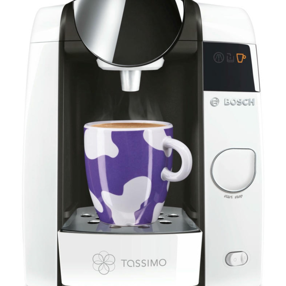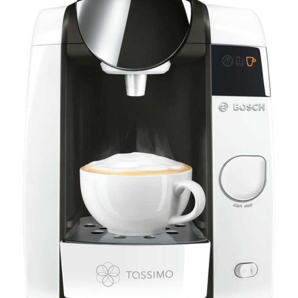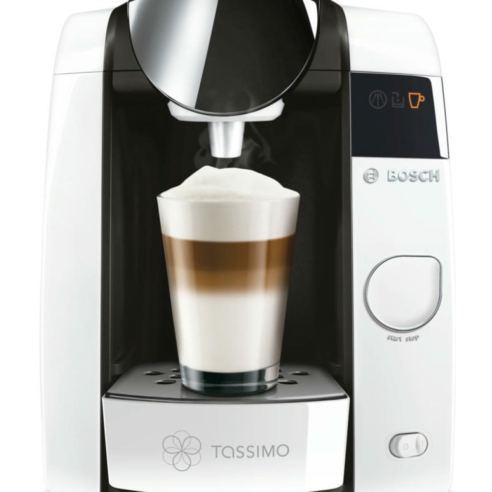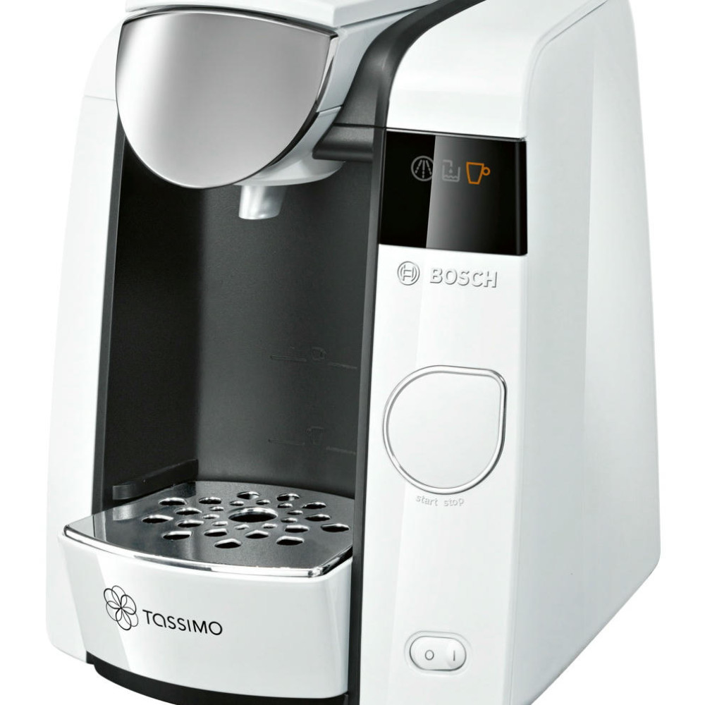Кофемашина Bosch TAS 4504 белого цвета из серии TASSIMO JOY — прибор для приготовления напитков из T-дисков. Особенность данной модели — увеличенный съемный контейнер для воды объемом 1.4 литра и возможность использовать жидкое молоко. Процесс заваривания происходит внутри капсулы, поэтому каждый напиток свежий, а отработанные капсулы легко удаляются, не оставляя капель.