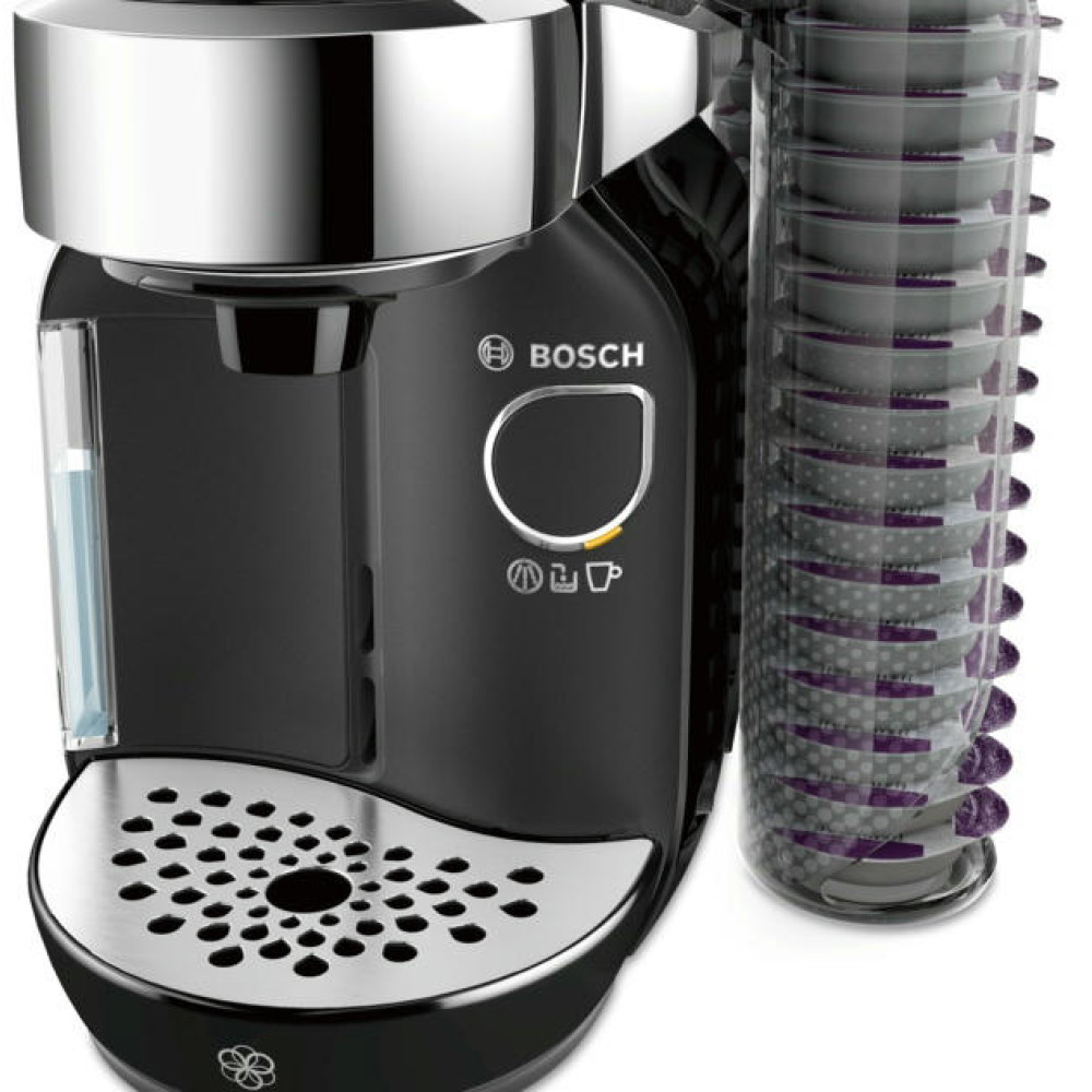 Кофемашина Bosch TAS 7002 черного цвета из серии TASSIMO CADDY — прибор для приготовления напитков из T-дисков. К данной модели прилагаются два интегрированных держателя, каждый из которых рассчитан на 16 капсул. Всего вокруг кофемашины можно разместить 8 держателей (128 капсул), что удобно для офисов, презентаций. Предоставляет большой выбор напитков и позволяет поддерживать чистоту стола, на скатерти не останется пятен от пакетиков или просыпанного кофе. Умная система считывает штрих-код и готовит эспрессо, кафе крема, капучино, латте макиато, горячий шоколад, фруктовый, зеленый и латте чай. Вы можете вручную отрегулировать крепость напитка и размер чашки. О процессе работы извещает световая индикация.