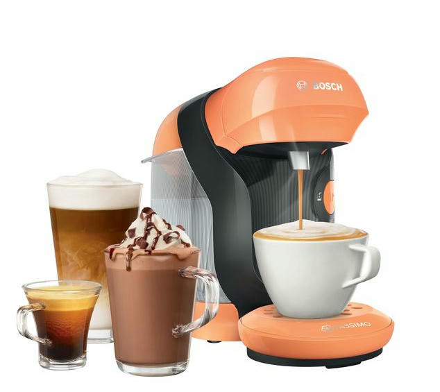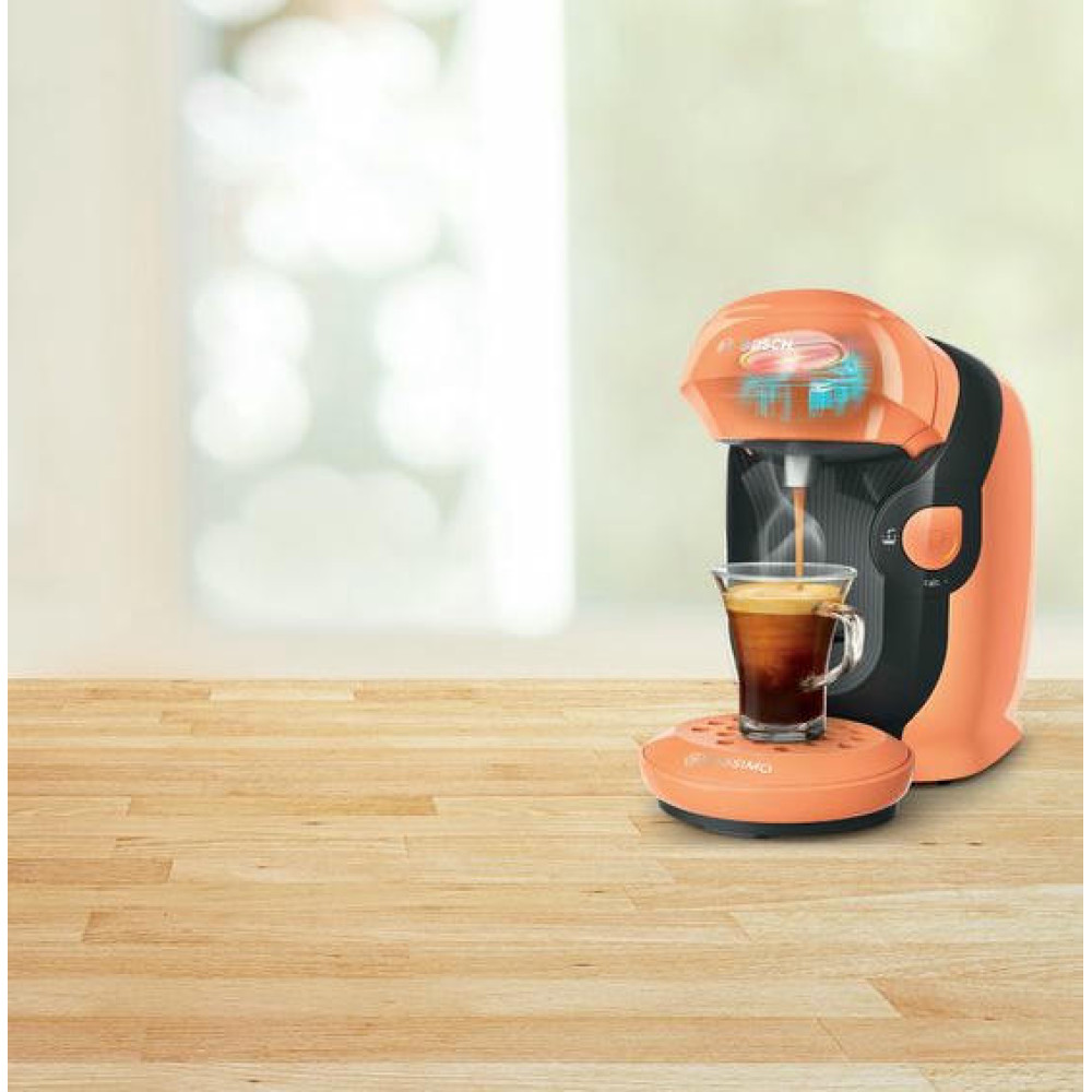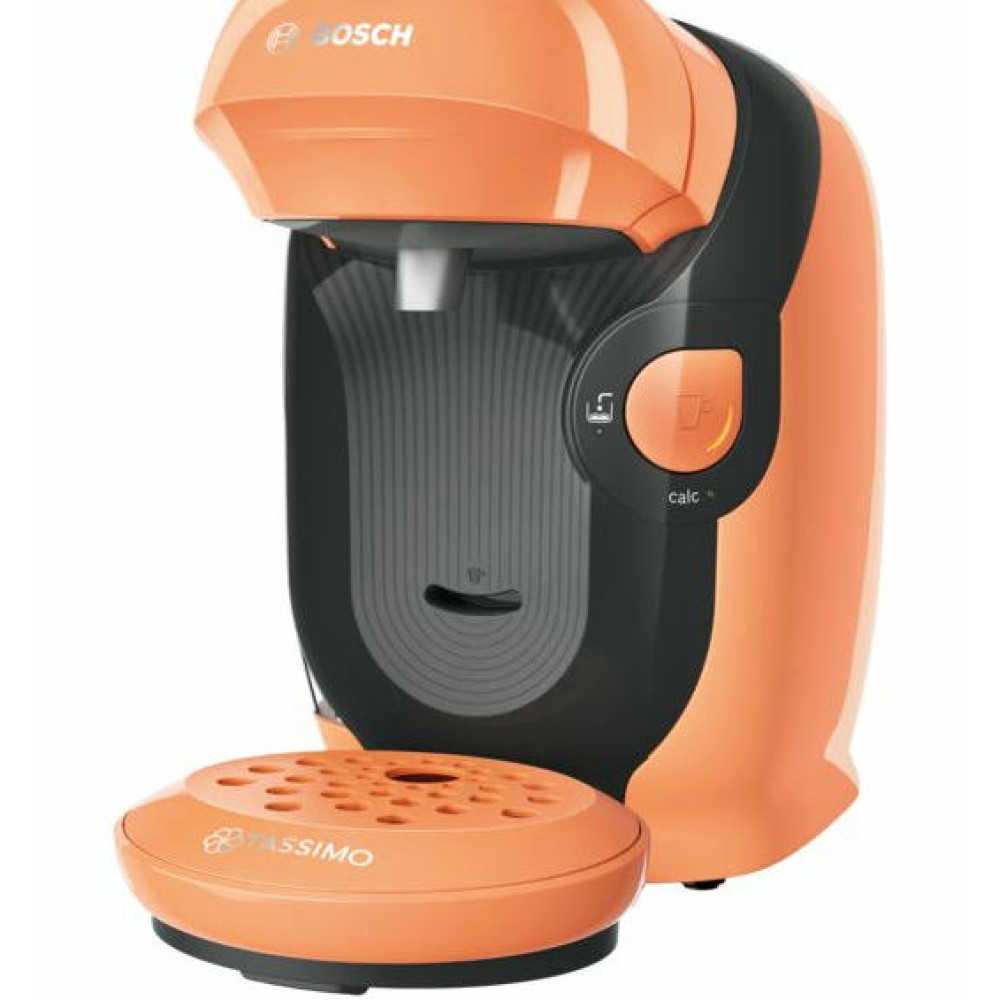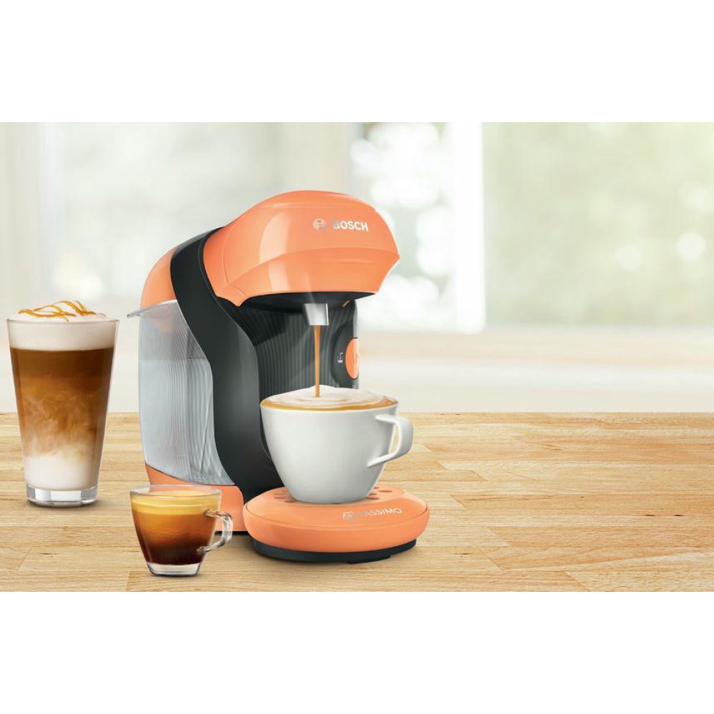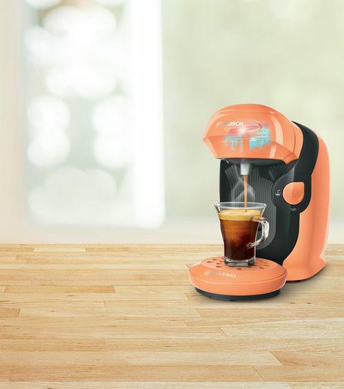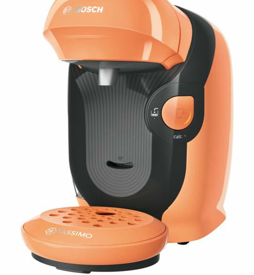 Кофемашина Bosch TAS1106 Tassimo современный дизайн в оранжевом цвете. Модель компактного размера подойдет для любой кухни. Прибор может приготовить множество натуральных и вкусных напитков. Подставка для чашек регулируется по высоте, поэтому можно использовать любую посуду по объему.