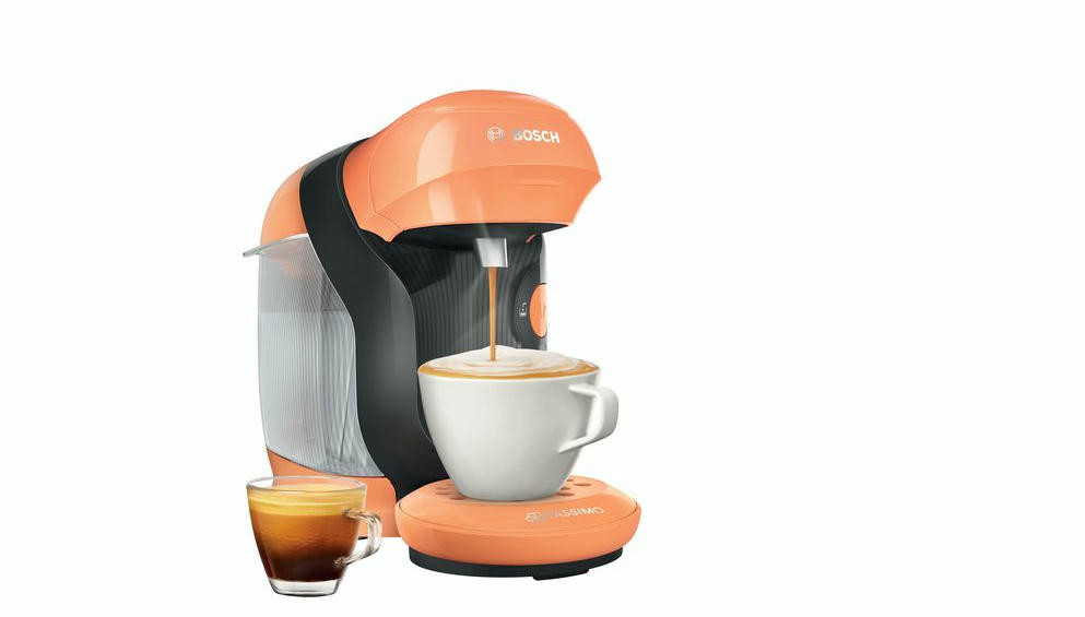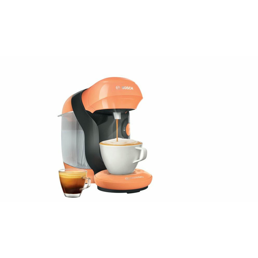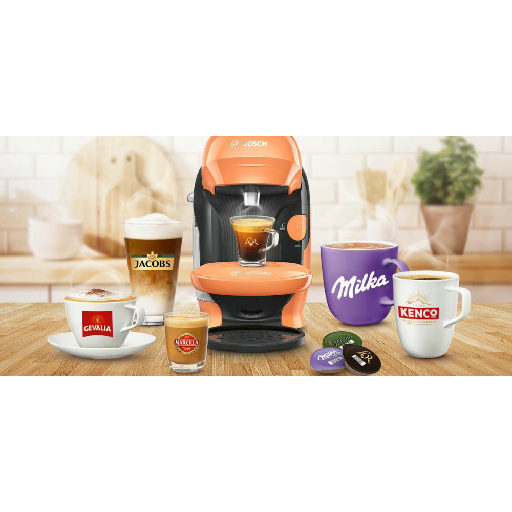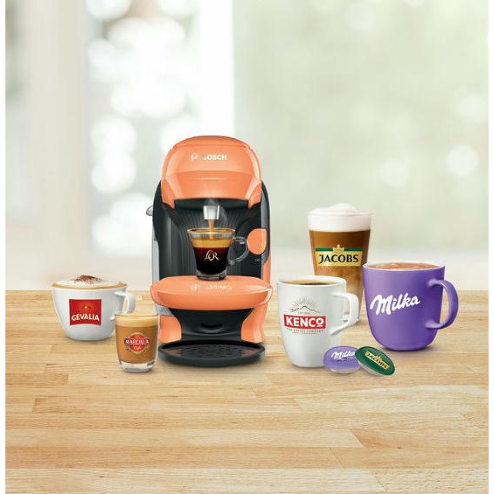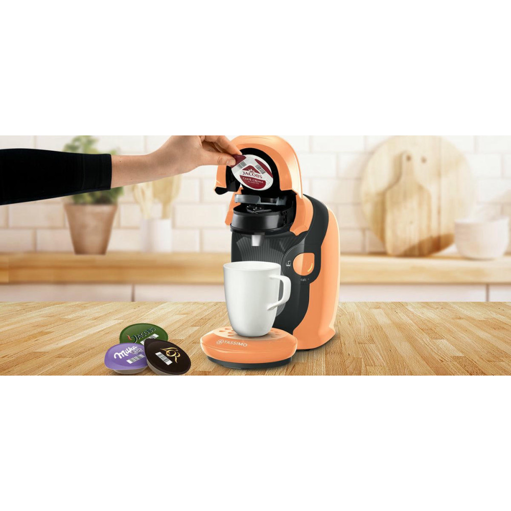 Кофемашина Bosch TAS1106 Tassimo современный дизайн в оранжевом цвете. Модель компактного размера подойдет для любой кухни. Прибор может приготовить множество натуральных и вкусных напитков. Подставка для чашек регулируется по высоте, поэтому можно использовать любую посуду по объему.