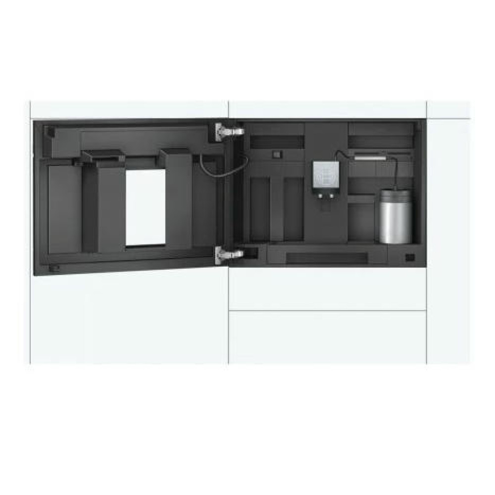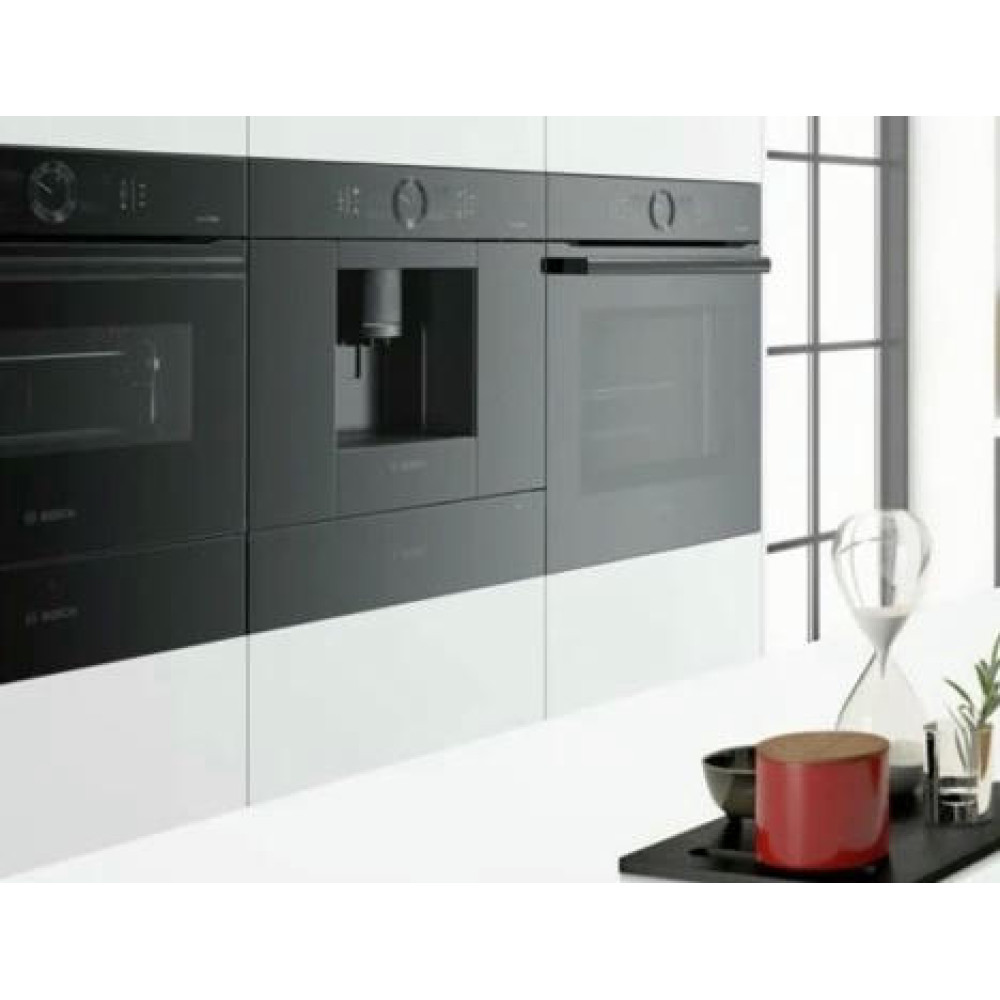Встраиваемая кофемашина Bosch CTL836EC6 из серии Serie | 8 – воплощение современных технологий, стиля и функциональности для истинных ценителей свежемолотого кофе. Элегантный корпус выполнен из высококачественного пластика в насыщенном черном цвете, гармонично вписывается в любой интерьер кухни и подчеркивает премиальный статус техники. Компактные размеры (высота 45.5 см, ширина 59.4 см, глубина 37.5 см) и универсальные габариты ниши для встраивания позволяют интегрировать устройство в кухонный гарнитур, обеспечивая безупречный внешний вид и экономию пространства. Продуманная эргономика и сенсорные переключатели делают управление интуитивно понятным, а современный дисплей с возможностью выбора языка сообщений и наличием часов обеспечивает полный контроль над процессом приготовления напитков.