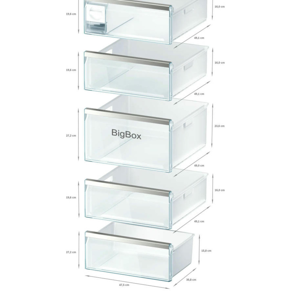 Отдельностоящий морозильник Bosch GSN 54AWDV оснащён системой No frost, которая обеспечит равномерную подачу сухого холодного воздуха внутри камеры, что предотвратит образование на стенках устройства льда. FreshSense — благодаря оптимальному климату продукты сохранят консистенцию. Ящик BigBox позволяет размесить продукты большого размера, например целый торт или пиццу.