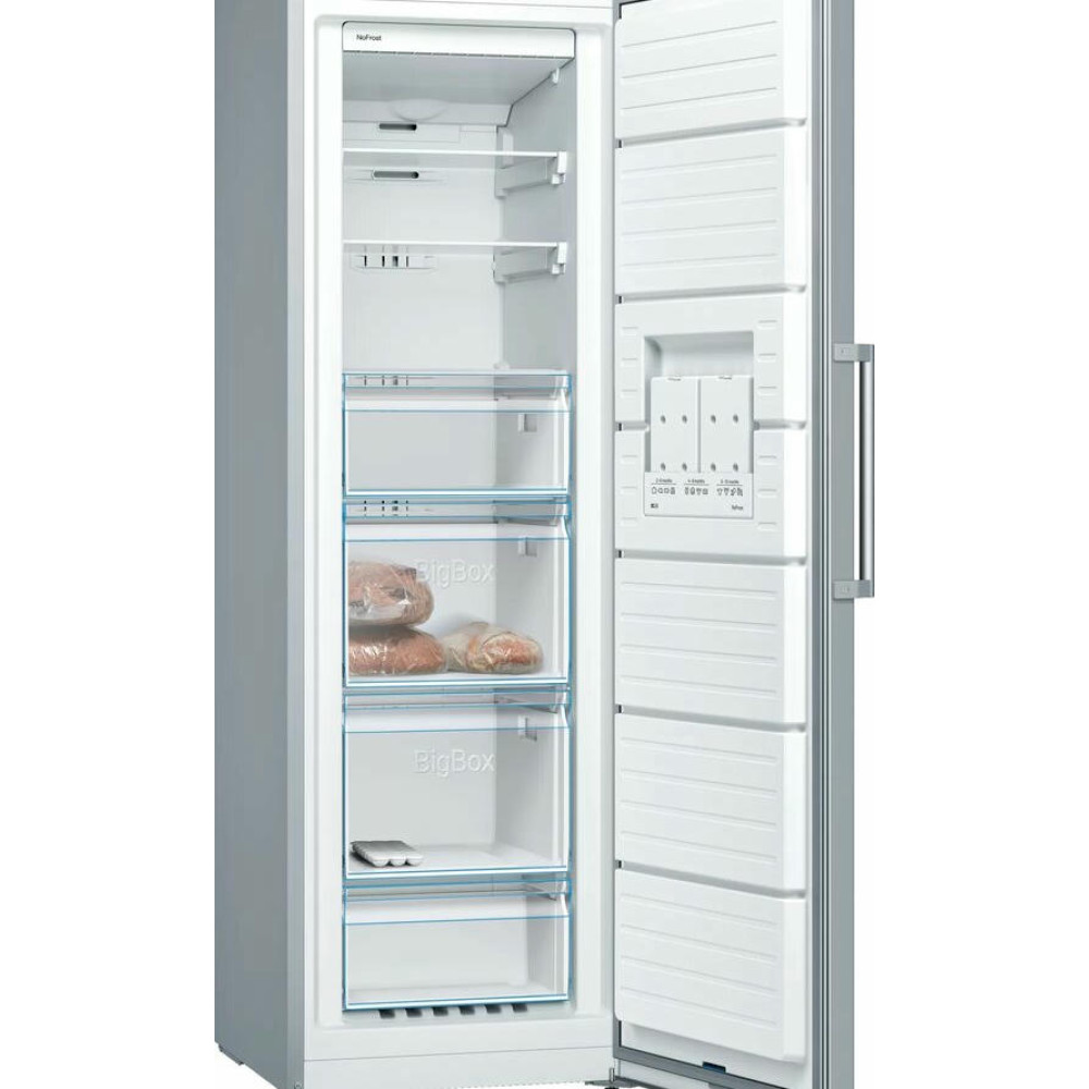 Отдельностоящий морозильник Bosch GSN36VL3PG оснащен ящиком BigBox он подходит для размещения крупных продуктов, туда уместится целый торт или пицца. Благодаря технологии FreshSense продукты не замораживаются до состояния льда, например мороженное не будет слишком твердым или слишком мягким. Система NoFrost на стенках внутренней камере устройства не будет образовываться лед.