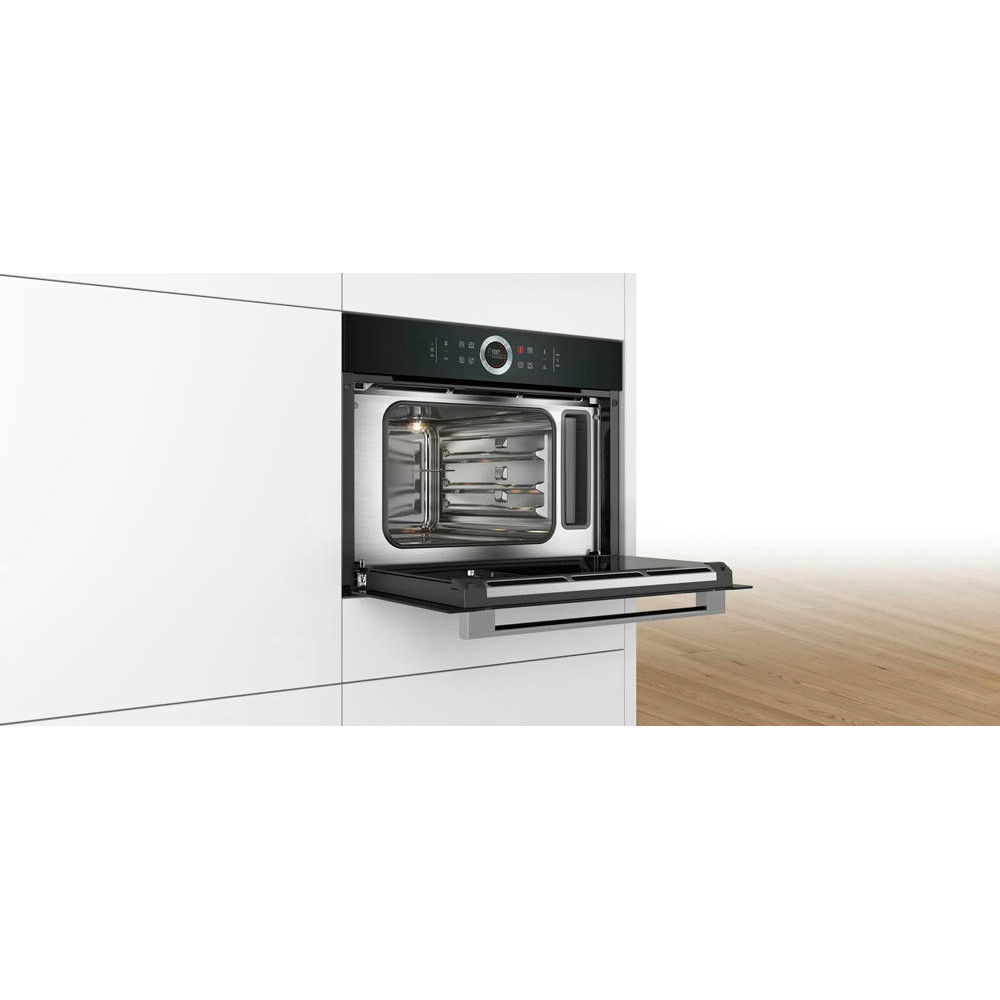 Дверца закрывается плавно и тихо благодаря амортизатору SoftClose. В комплекте идут два паросборника размера L и губка.