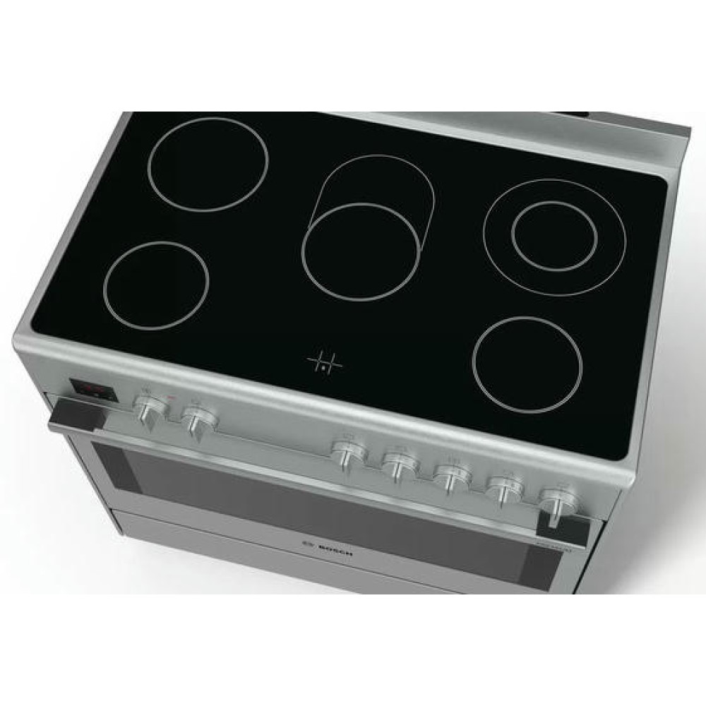 Электрическая плита Bosch HCB738357M оснащена 5 конфорками среди них имеется овальная для разных форм посуды. Удобное съемное стекло позволяет отслеживать процесс приготовления, а также его удобно чистить. Имеется дисплей на котором отображаются часы.