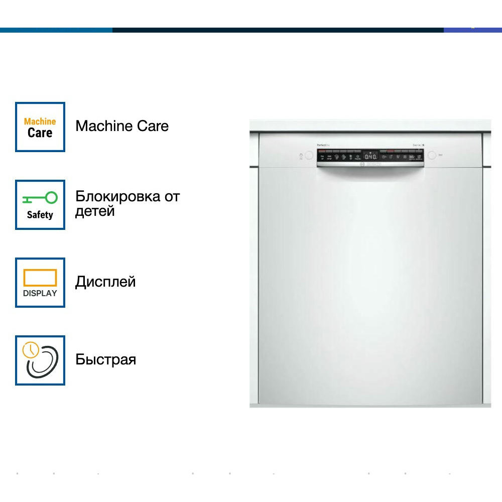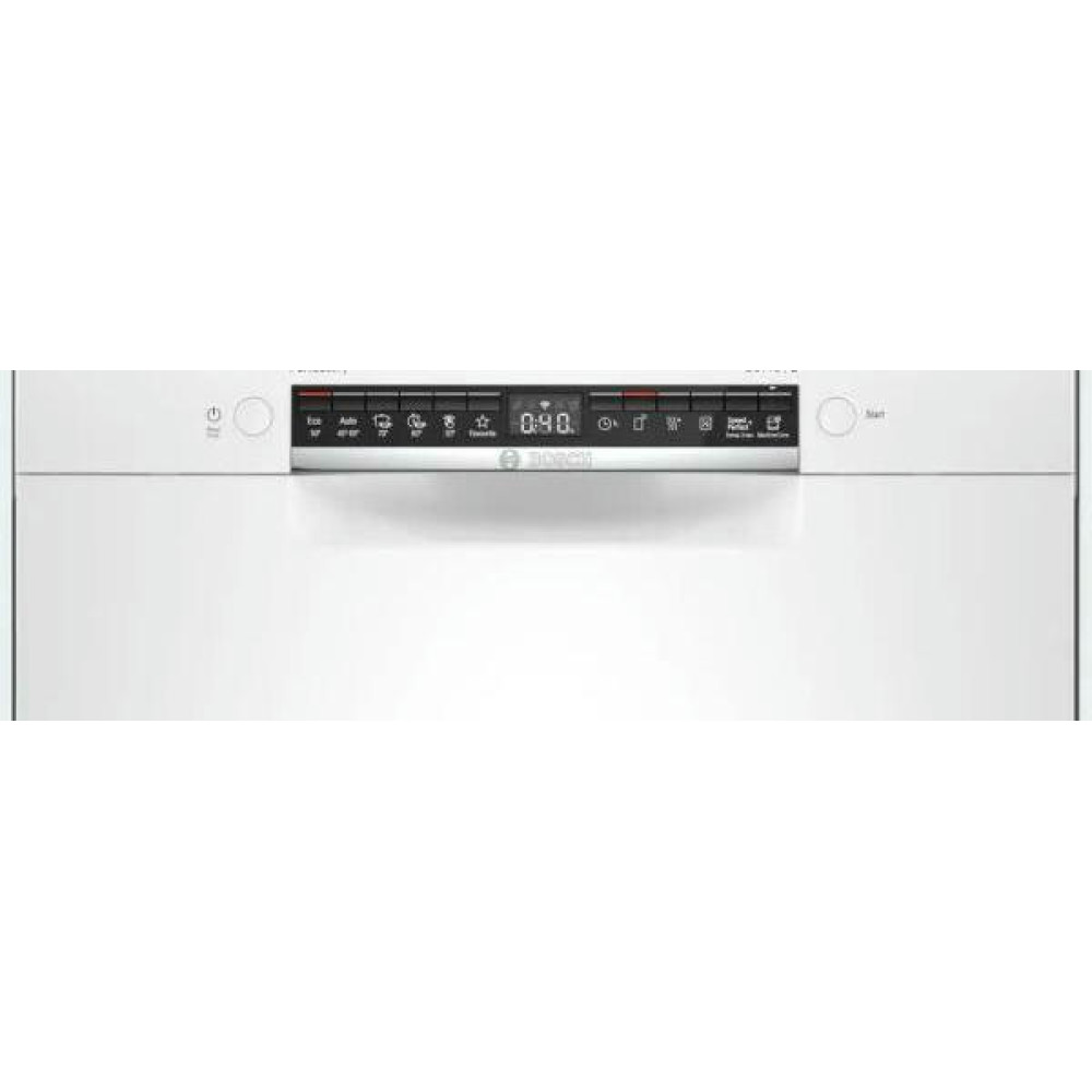 Частично встраиваемая посудомоечная машина Bosch SMU6ZCW00S оснащена электронной панелью управления в черном цвете с небольшим дисплеем, на котором можно узнать сколько осталось до конца программы. HomeConnect позволит управлять устройством даже, если вы далеко от дома. Выбирайте и устанавливайте различные функции через приложение на телефоне. Режим Machine Care предназначен для очистки самого прибора без посуды. Эта функция омывает внутреннюю часть камеры при повышенной температуре так, чтобы убрать загрязнения.