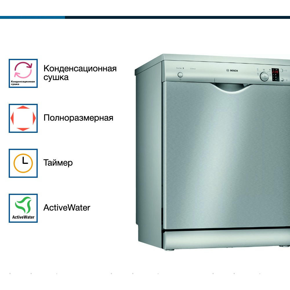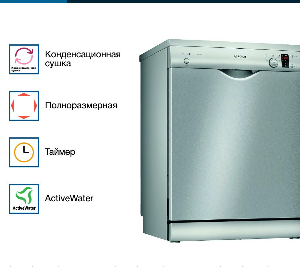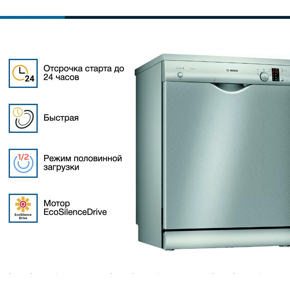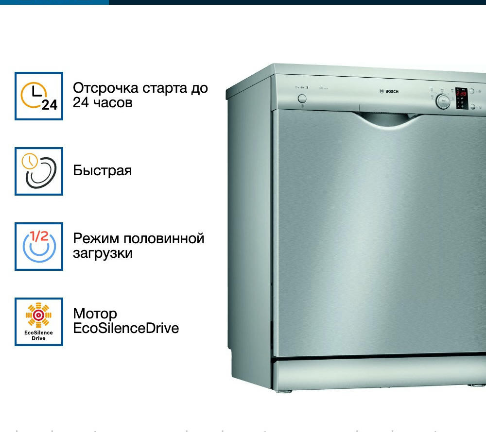 Посудомоечная машина Bosch SMS25AI01R — отдельностоящая модель с 5 программами мытья. Прибор работает тихо благодаря инверторному двигателю EcoSilence Drive. Датчик загрузки обеспечивает экономичный расход воды.