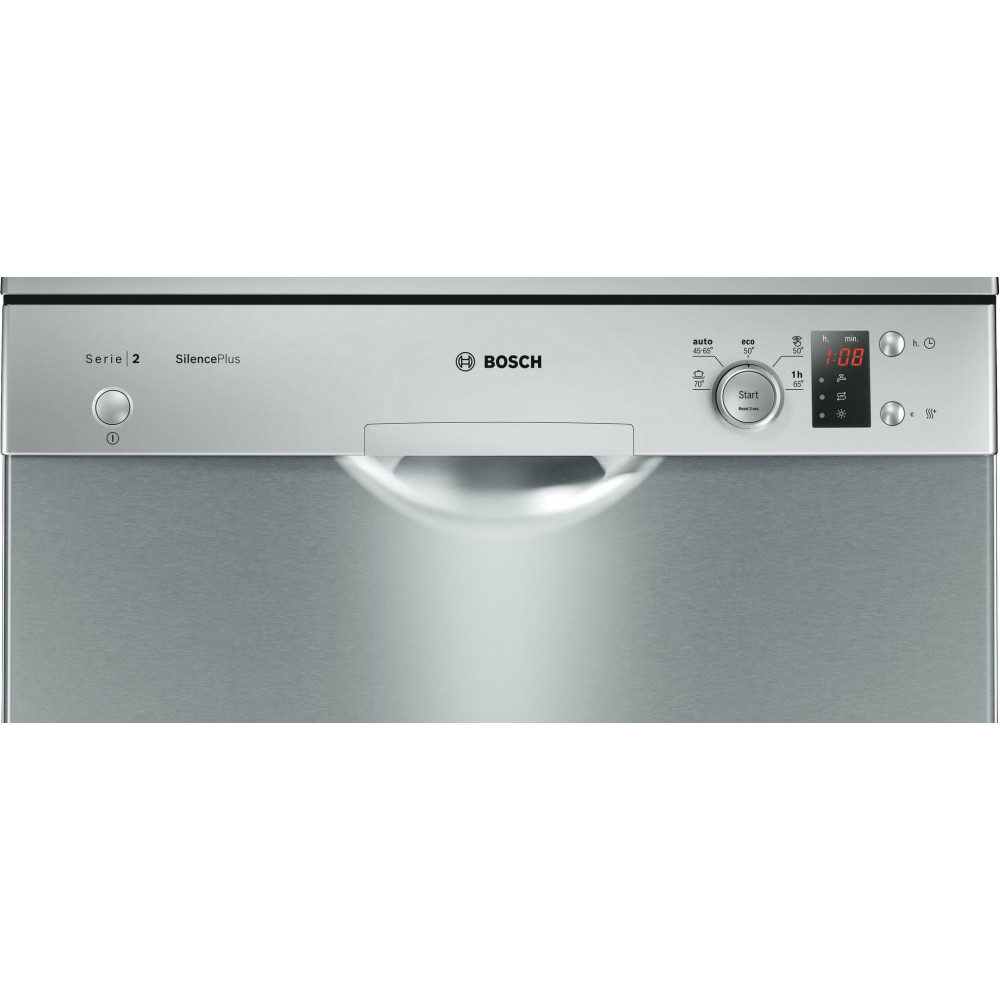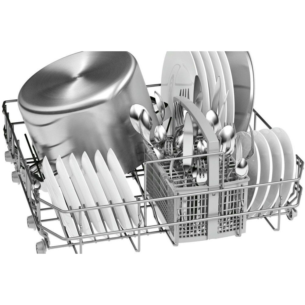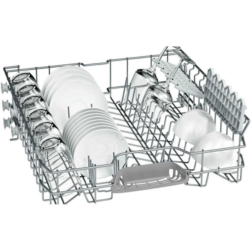 Посудомоечная машина Bosch SMS25AI03E — отдельностоящая модель с 5 программами мытья и функцией Dry Extra, которая обеспечивает сушку класса А. Прибор работает очень тихо, максимальный уровень шума — всего 46 Дб. Регулируемая высота верхней корзины позволяет размещать внизу противни и большие блюда.