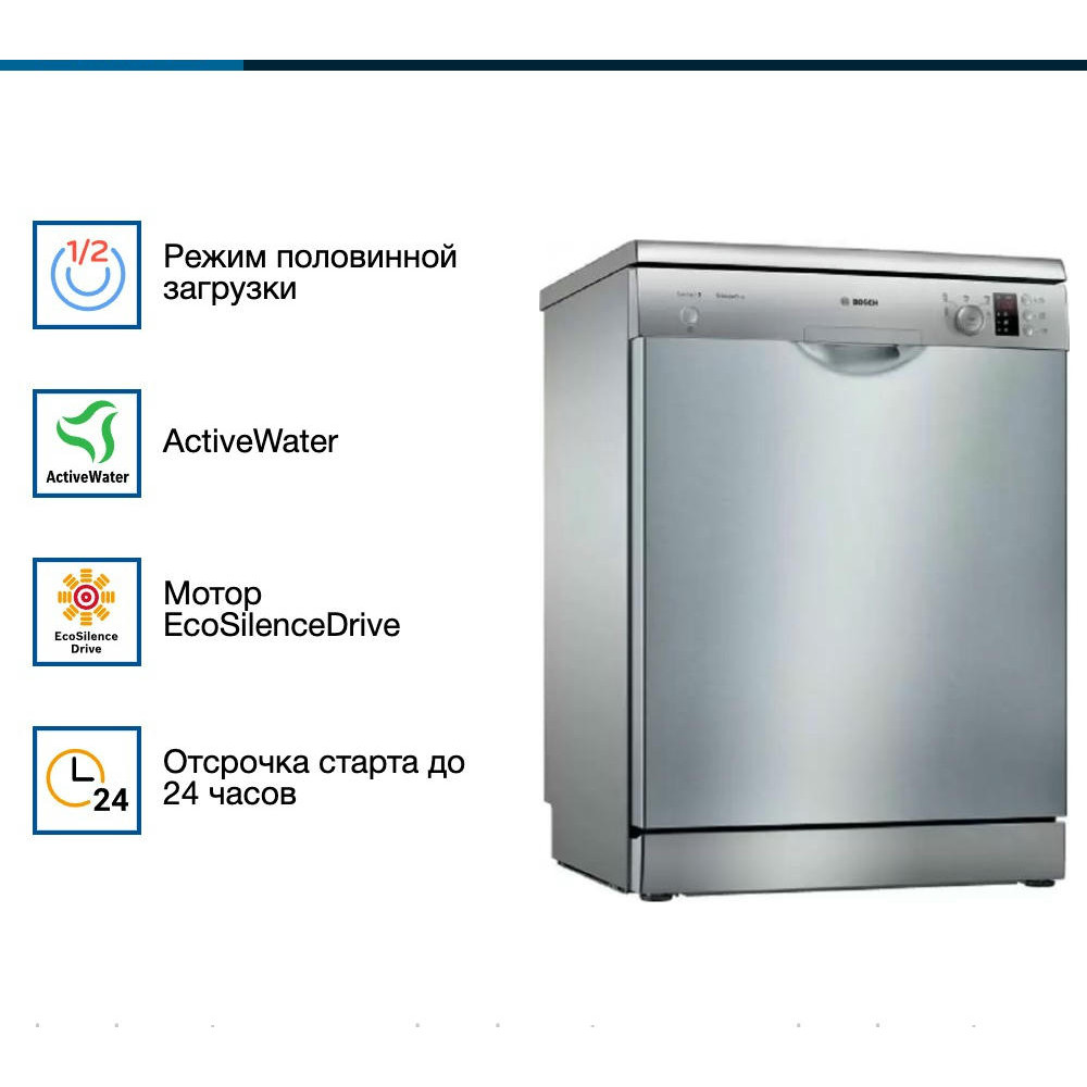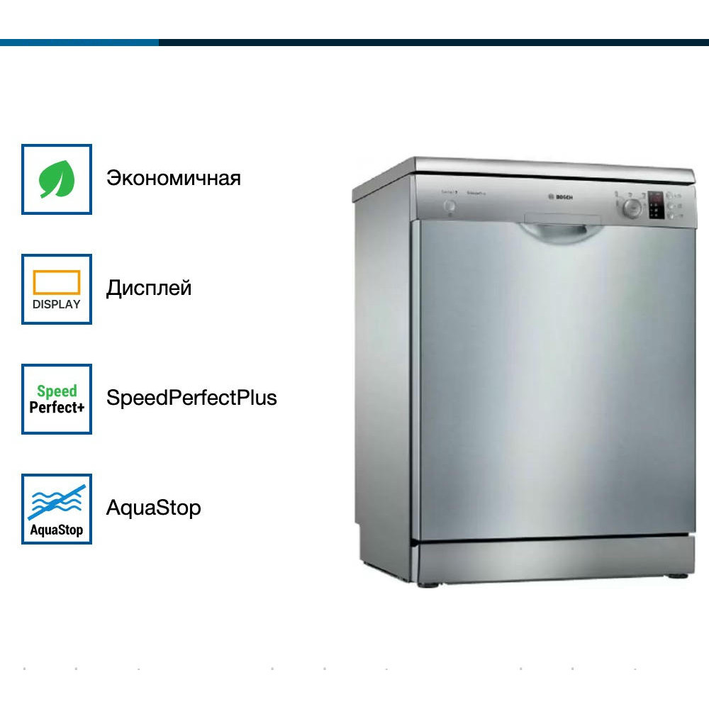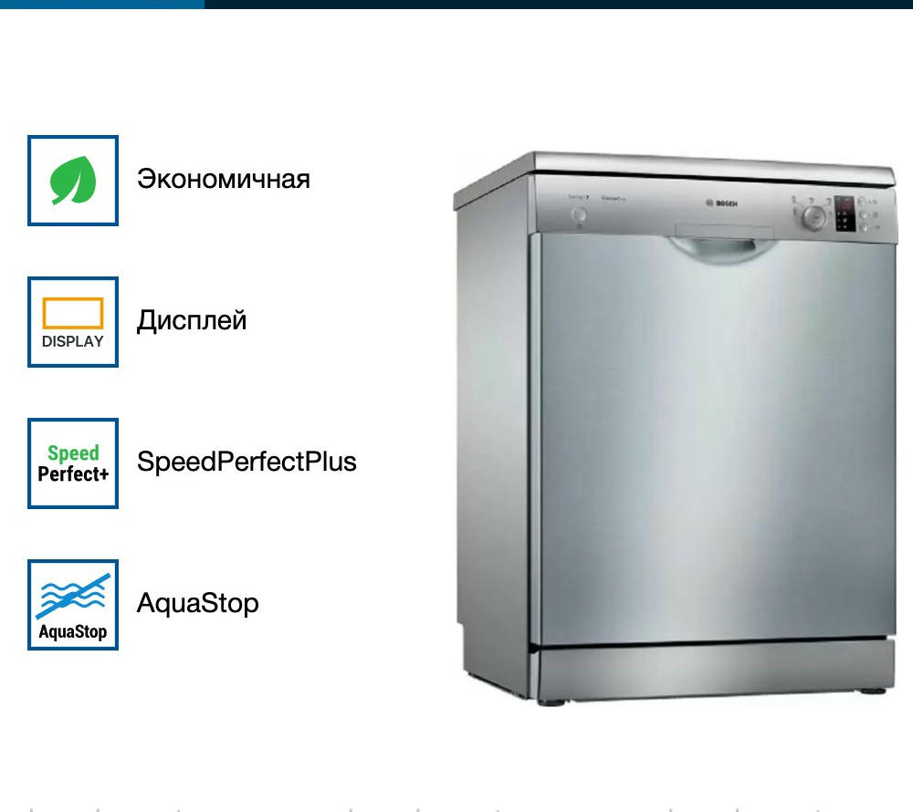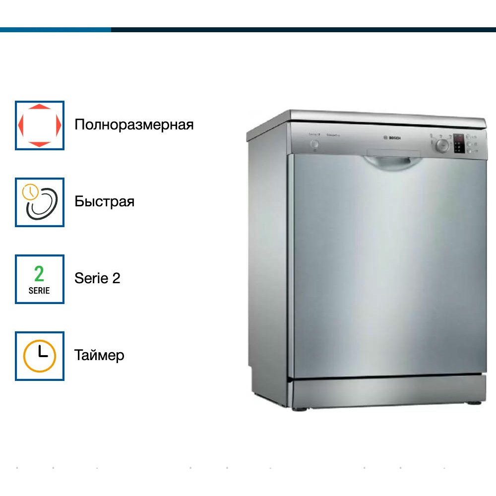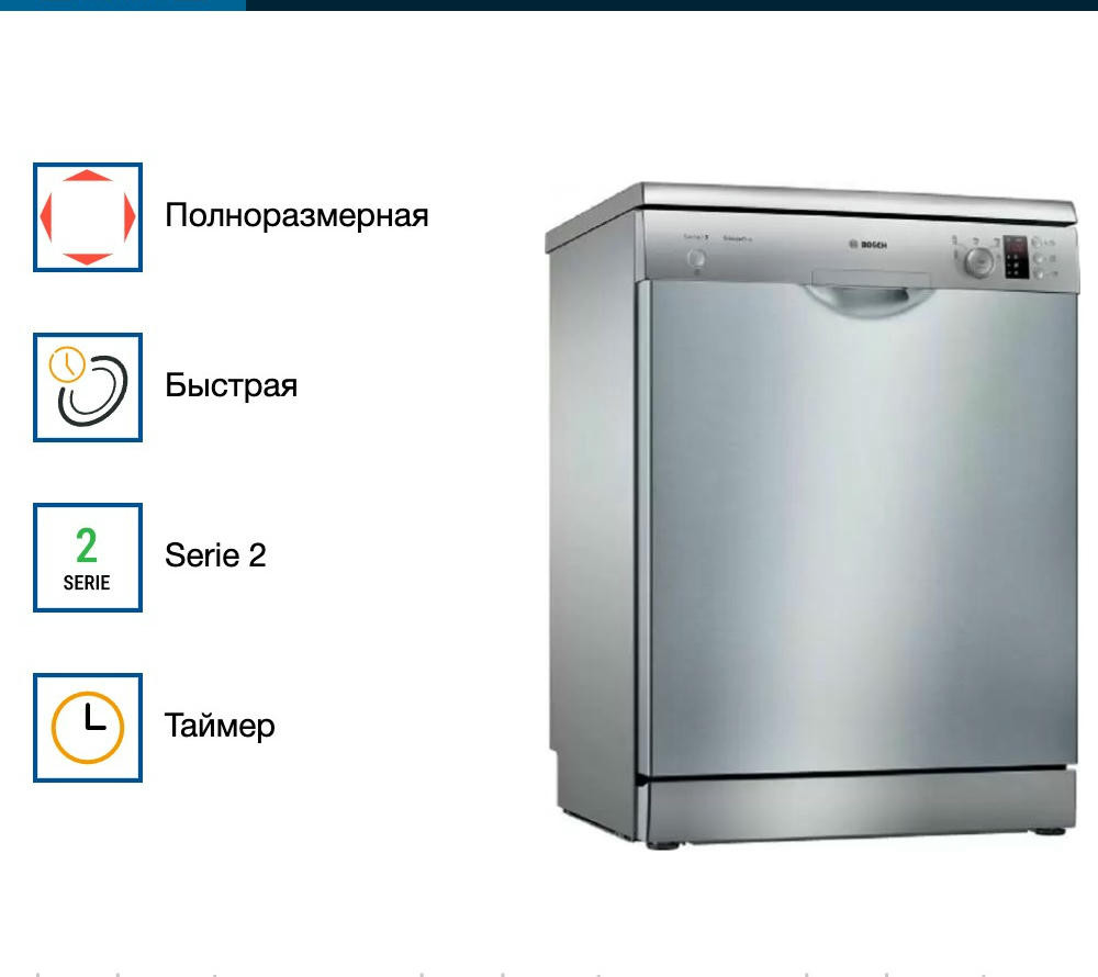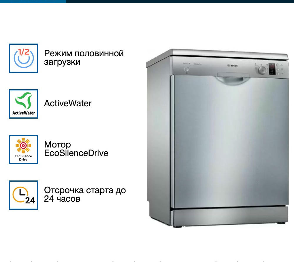Посудомоечная машина Bosch Series | 2 SMS25AI05E проста в подключении и надежна. Модель предназначена для ухода за столовыми приборами, чашками, кастрюлями, сковородками и тарелками разного размера. Устройство позволяет очищать до 12 комплектов посуды одновременно. В конструкции модели есть мощный инверторный двигатель, который характеризуется энергоэффективностью и пониженным уровнем шума. Посудомойка имеет пять программ и три температурных режима. Прибор можно использовать с моющими средствами, состоящими из соли, ополаскивателя и чистящего порошка.