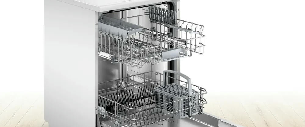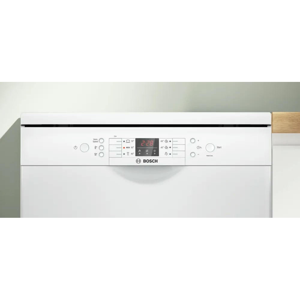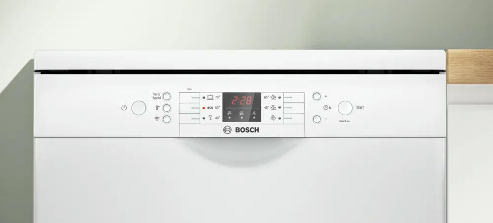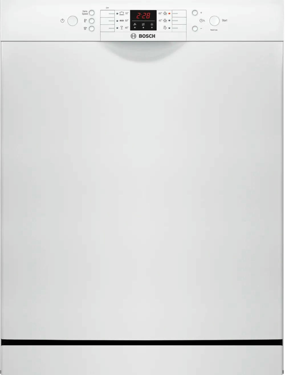 Посудомоечная машина Bosch SMS26DW00T представляет собой полноразмерное, отдельностоящее устройство белого цвета. Модель оснащена инновационным инверторным двигателем EcoSilence Drive, который обеспечивает тихую и эффективную работу. Способность уместить до 13 комплектов посуды делает эту модель идеальной для больших семей или вечеринок. Машина предлагает шесть стандартных программ и пять температурных режимов, включая два вида быстрой мойки при 45 и 65 градусах, экономичную, интенсивную, стекло при 40 градусах и предварительное ополаскивание.