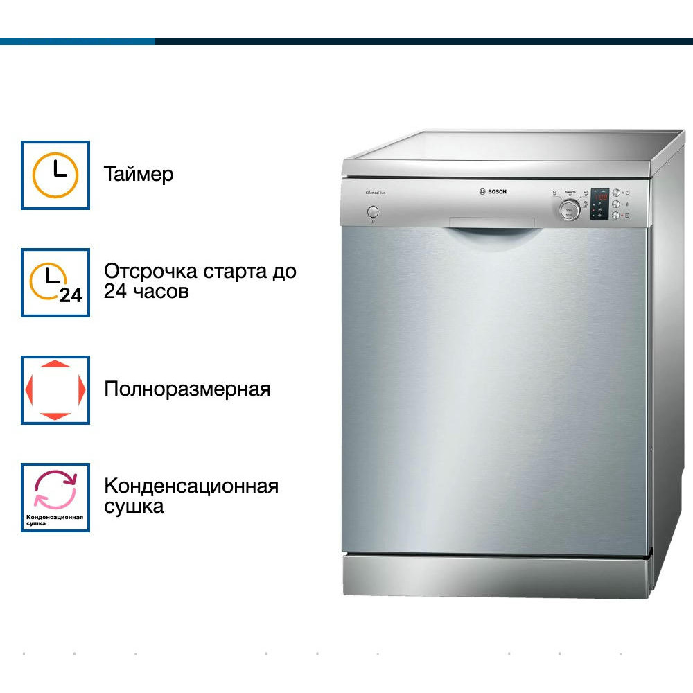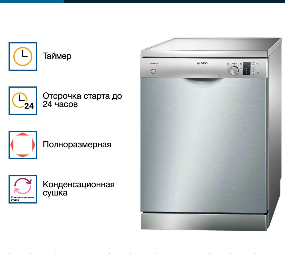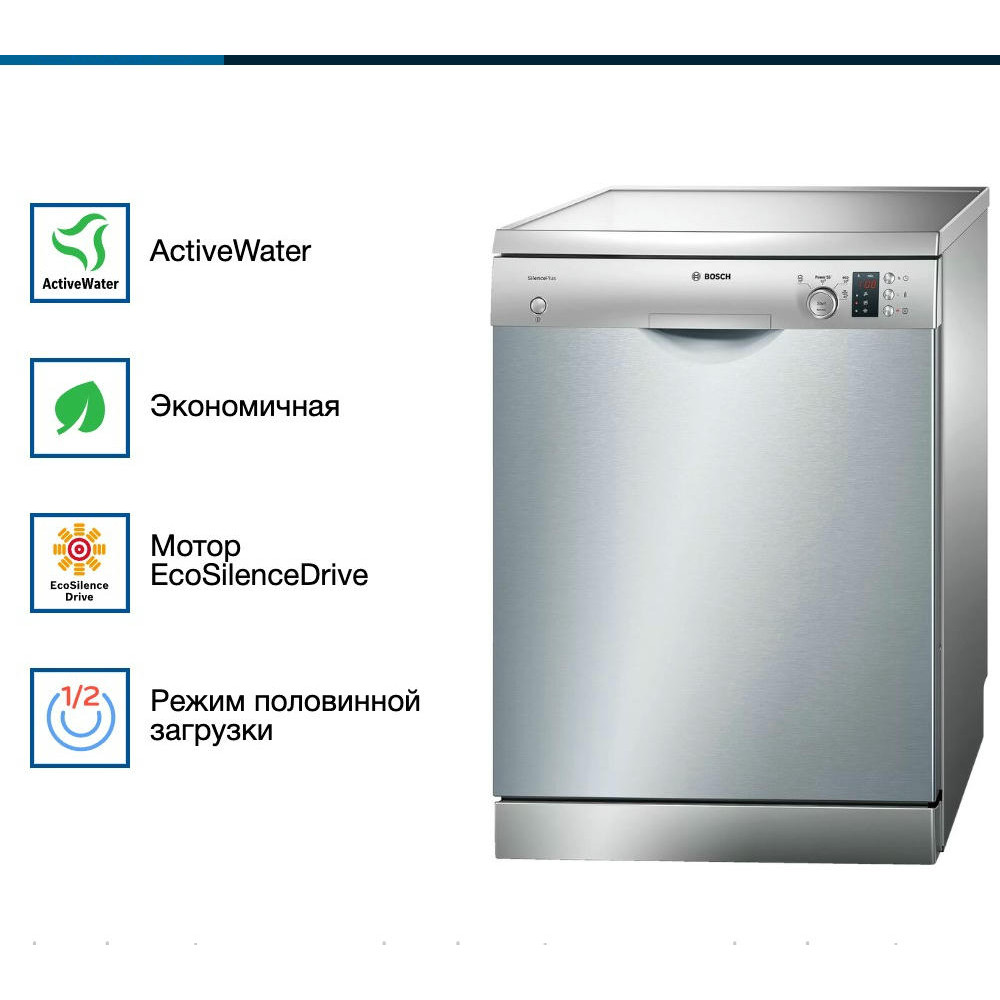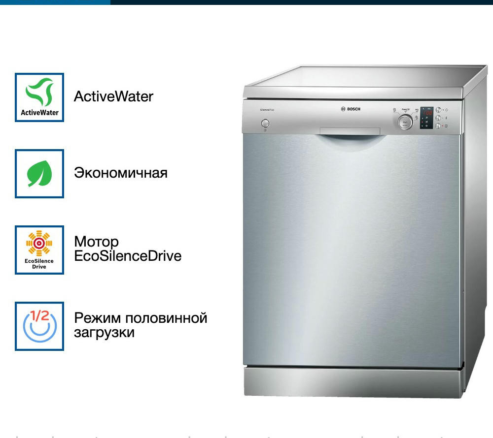 Посудомоечная машина Bosch SMS43D08ME оснащена полной защитой от любых протечек AquaStop. Имеется половинный режим загрузки при таком варианте сокращается потребление воды на 25% и электроэнергии на 15%. Система разбрызгивания воды ActiveWater проникает даже в самый удаленные уголки моечной камеры.