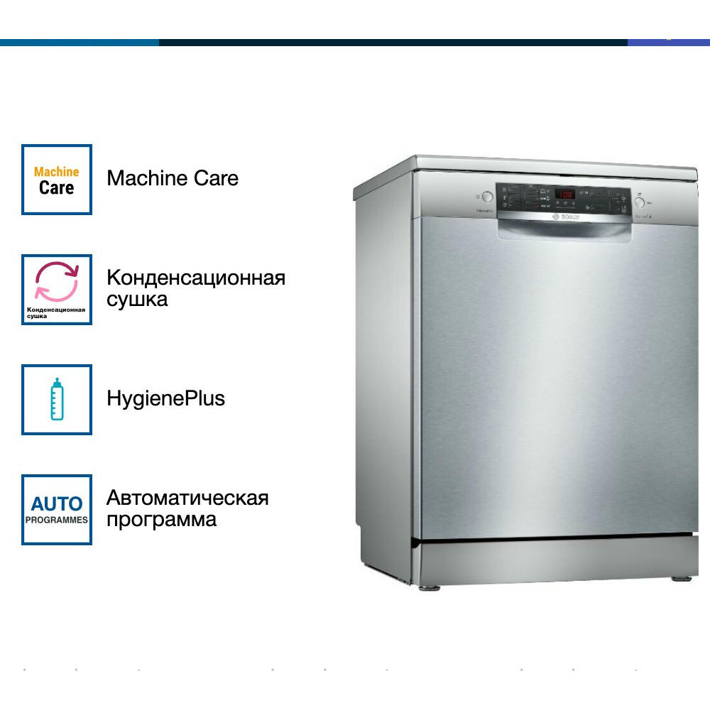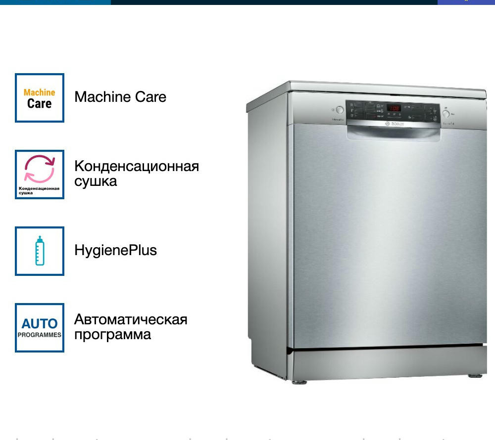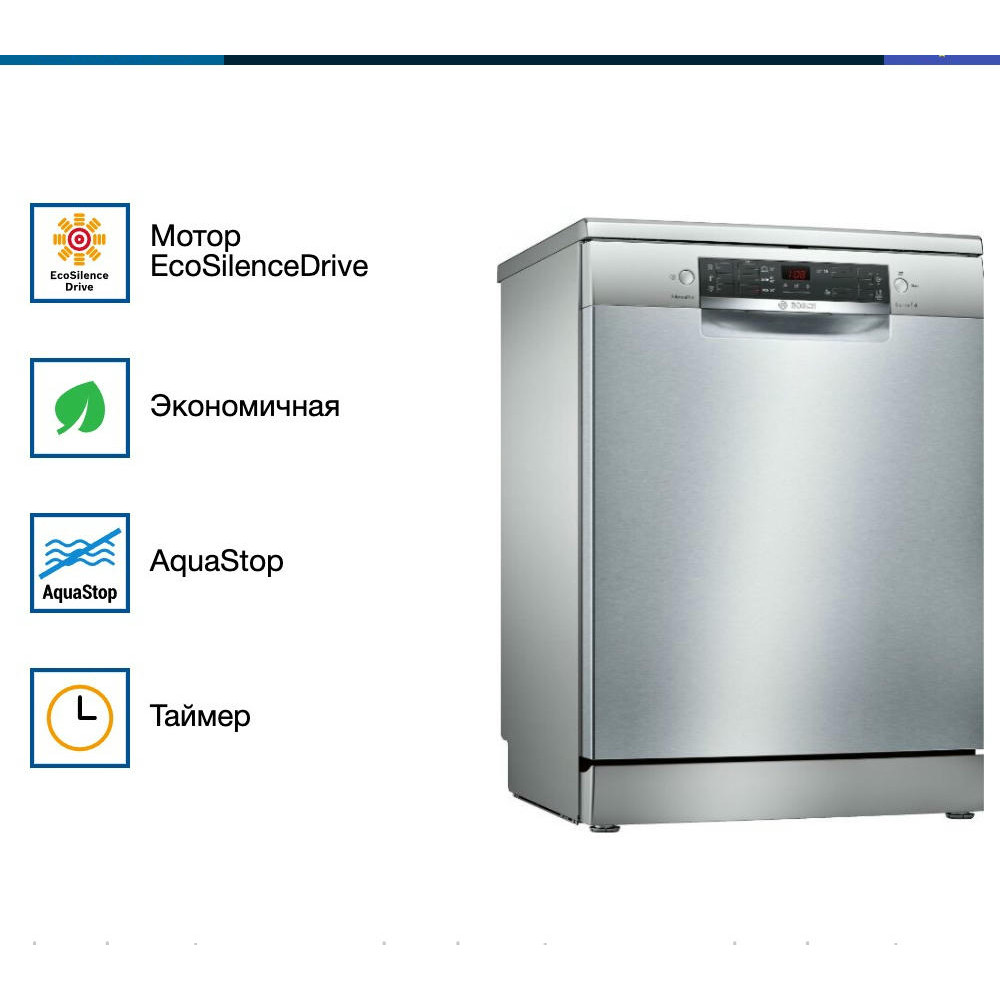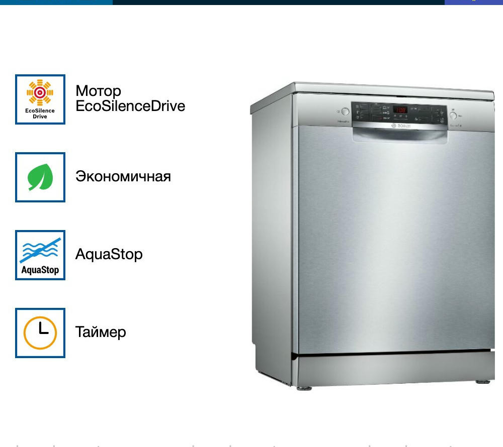Посудомоечная машина Bosch SMS45DI10Q оснащена мотором EcoSilence Drive он долговечен, также он очень тихий в работе. Функция MachineCare удаляет грязь и накипь , рекомендуется использовать через каждые 30 циклов стирки. Система AquaStop полностью защитит от любых протечек.