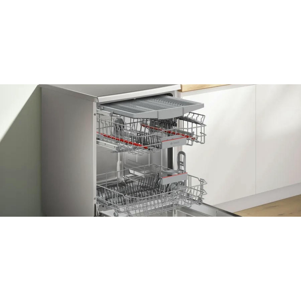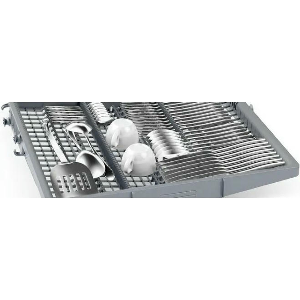 Модель имеет таймер отсрочки запуска, который позволяет программировать начало мойки на удобное для вас время. В конце каждой программы звучит сигнал, информирующий о завершении процесса. Машина имеет три корзины, включая верхнюю, которую можно переставлять по высоте с помощью системы Rackmatic-3. Это позволяет максимально эффективно использовать пространство внутри машины. Посудомоечная машина Bosch SMS4HMB62T обладает классом энергопотребления D, классом мытья A и классом сушки A. Это гарантирует высокую эффективность мойки и сушки при низком энергопотреблении. Уровень шума составляет всего 44 дБ, что делает ее одной из самых тихих моделей на рынке.