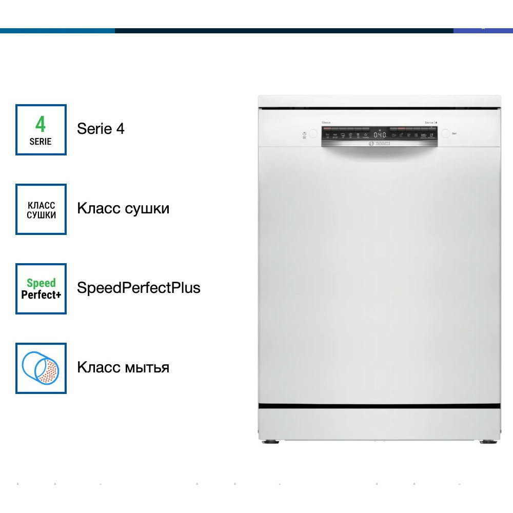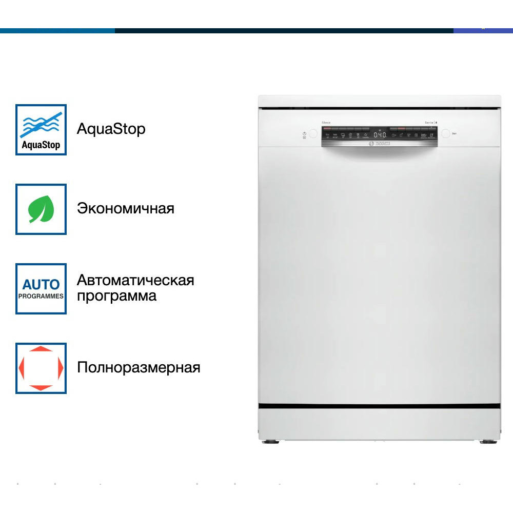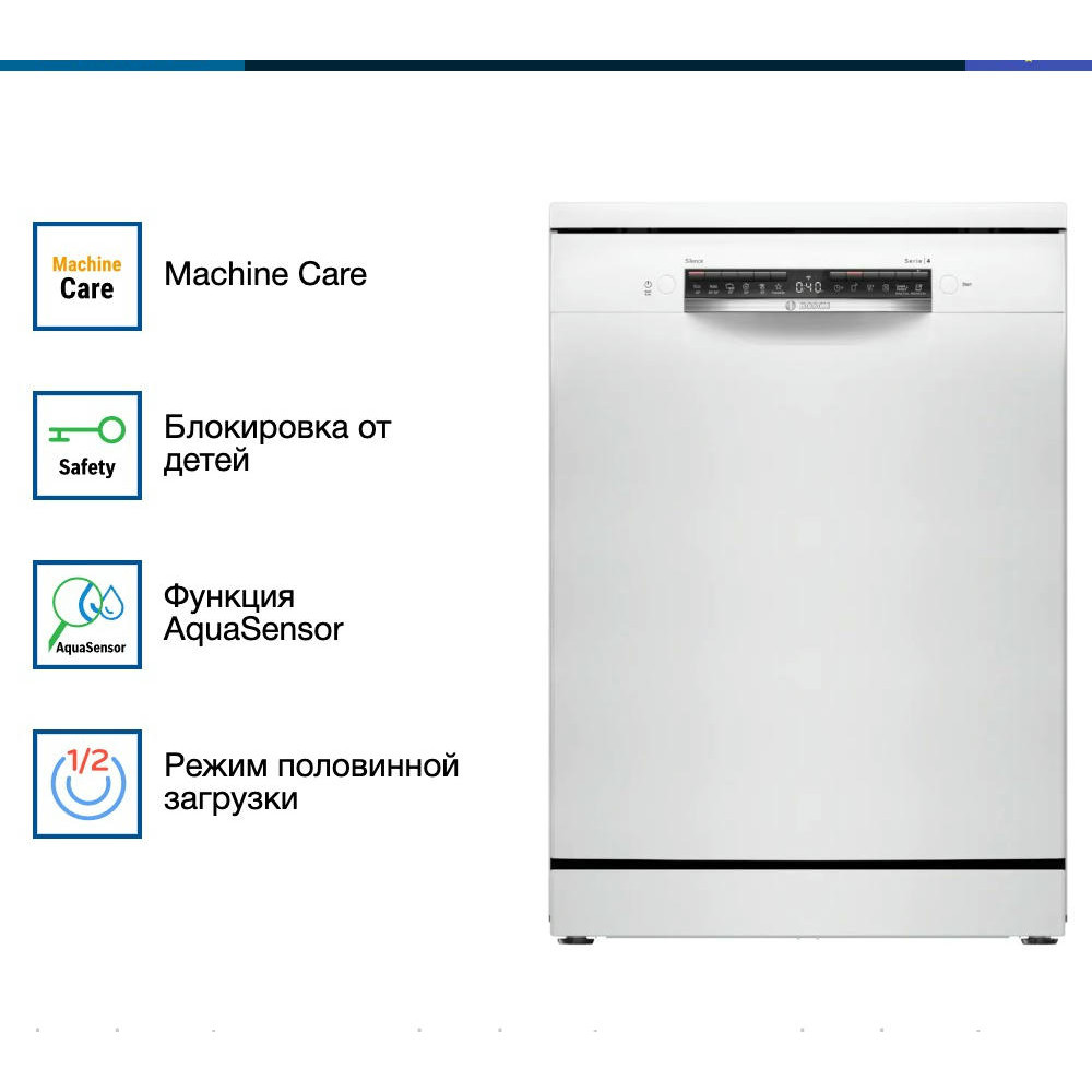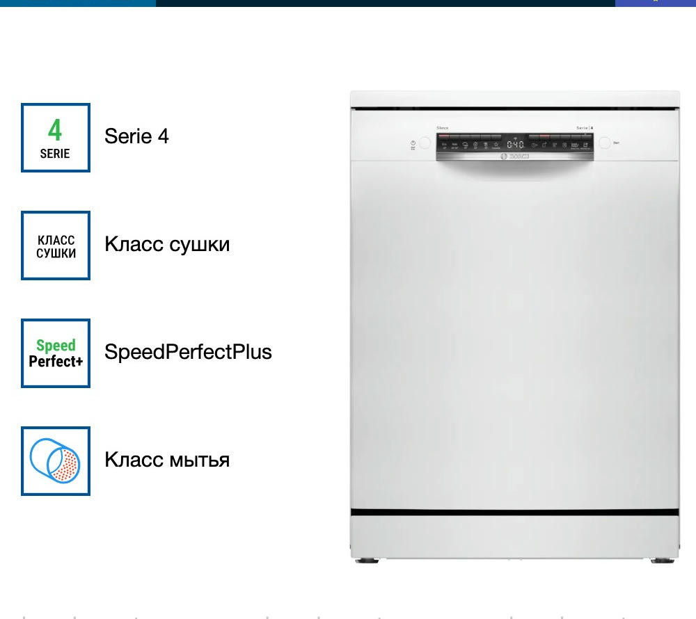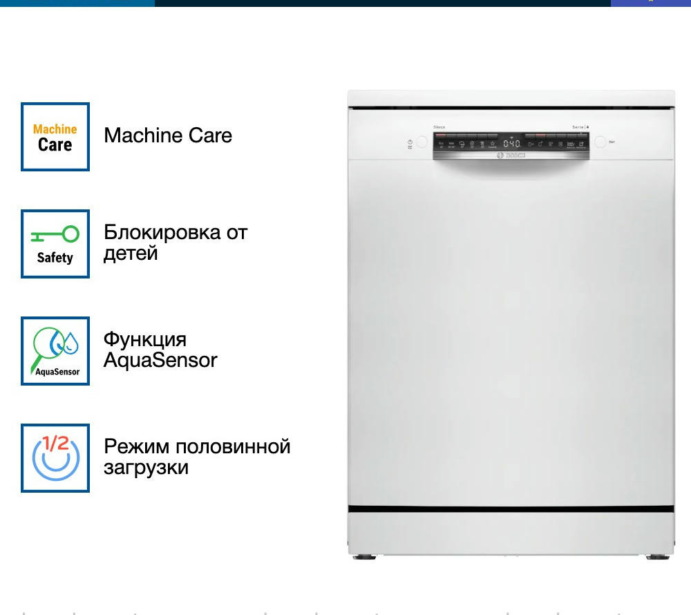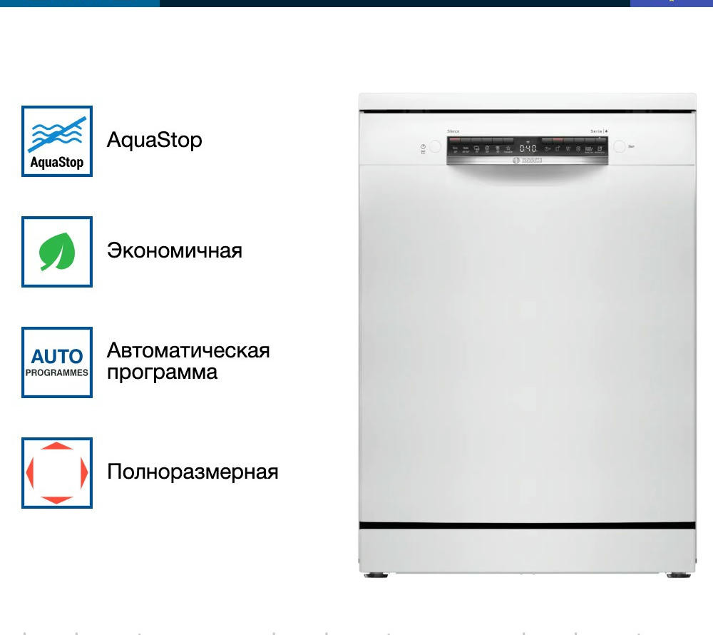 Посудомоечная машина Bosch SMS4HVW00E отличается своим стильным дизайном и функциональностью. Это отдельностоящая полноразмерная модель с конденсационной сушкой, выполненная в классическом белом цвете, что позволяет ей гармонично вписываться в любой интерьер. Серия Serie | 4, к которой принадлежит данная модель, зарекомендовала себя как надёжная и функциональная техника. Машина оснащена стандартным двигателем, способным обеспечить долгий срок службы прибора. Модель обладает широким набором программ стирки: в наличии шесть стандартных программ и четыре температурных режима. Такой выбор позволяет подобрать наиболее подходящий режим для различного типа посуды.