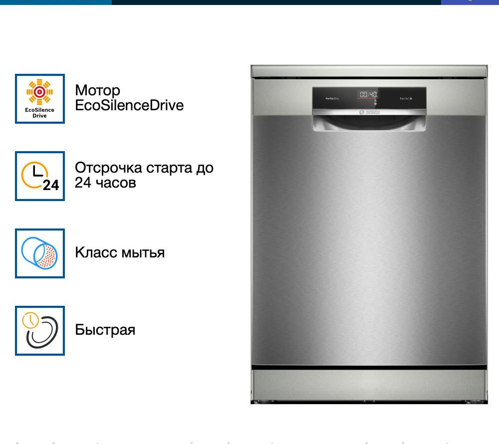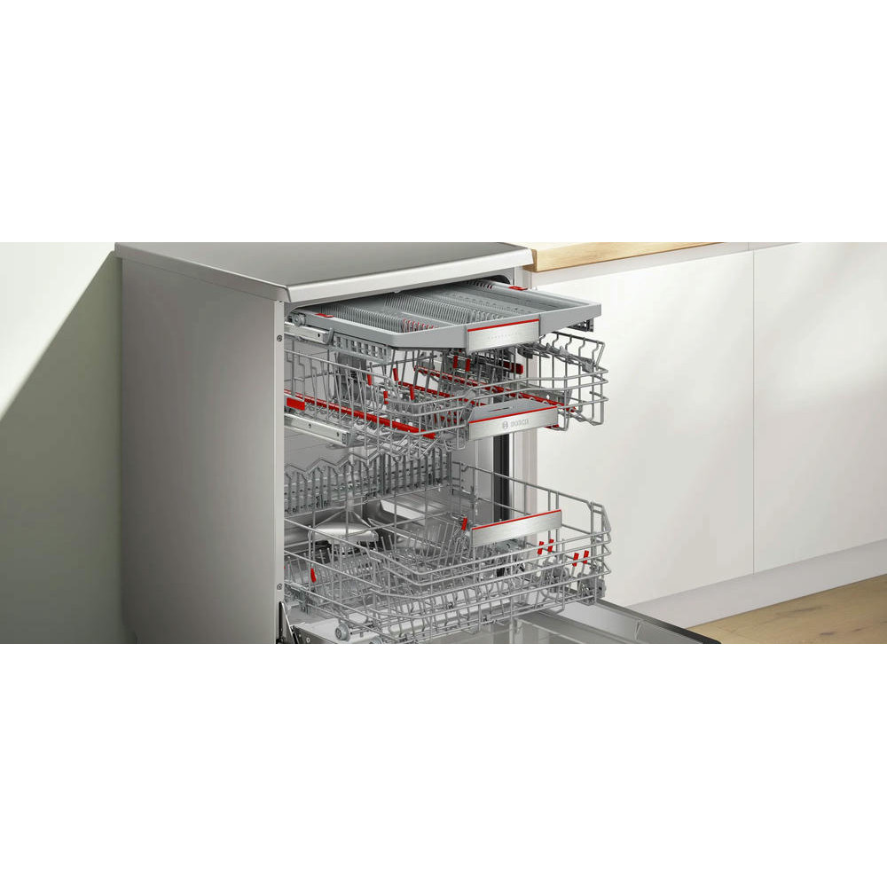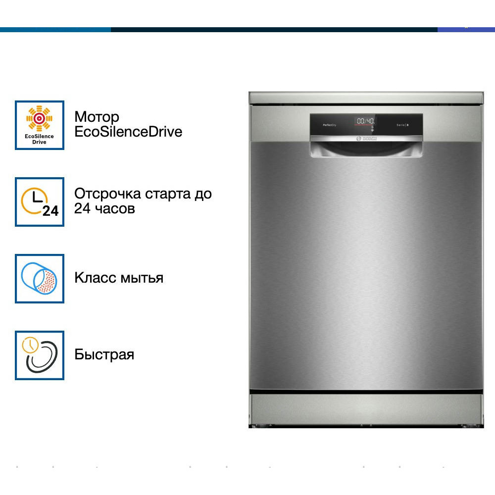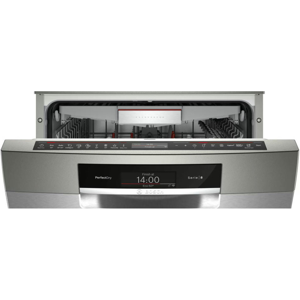 Посудомоечная машина Bosch SMS8YCI03E - это отдельностоящая, полноразмерная модель, выполненная в стильном дизайне из нержавеющей стали. Она принадлежит к серии Serie | 8 и оснащена инверторным двигателем EcoSilence Drive, который обеспечивает тихую и эффективную работу. Эта модель способна разместить до 14 комплектов посуды, что делает ее идеальным выбором для больших семей или активно приглашающих гостей хозяев. Машина оборудована восемью стандартными программами и пятью температурными режимами, включая быструю, экономичную, интенсивную, ночную и специальную программу для стекла при 40 градусах. Это позволяет подобрать наиболее подходящий режим для любого типа посуды. Система HygienePlus гарантирует высокий уровень гигиены, уничтожая до 99,9% бактерий и микробов. Особенностью данной модели является функция VarioSpeedPlus, которая позволяет сократить время мойки в три раза без потери качества. Также стоит отметить функцию Extra Dry, обеспечивающую идеальную сушку даже для трудносушимой посуды, такой как пластиковые изделия. Технология защиты стекла печет о сохранении блеска стеклянной посуды и предотвращения ее повреждения.