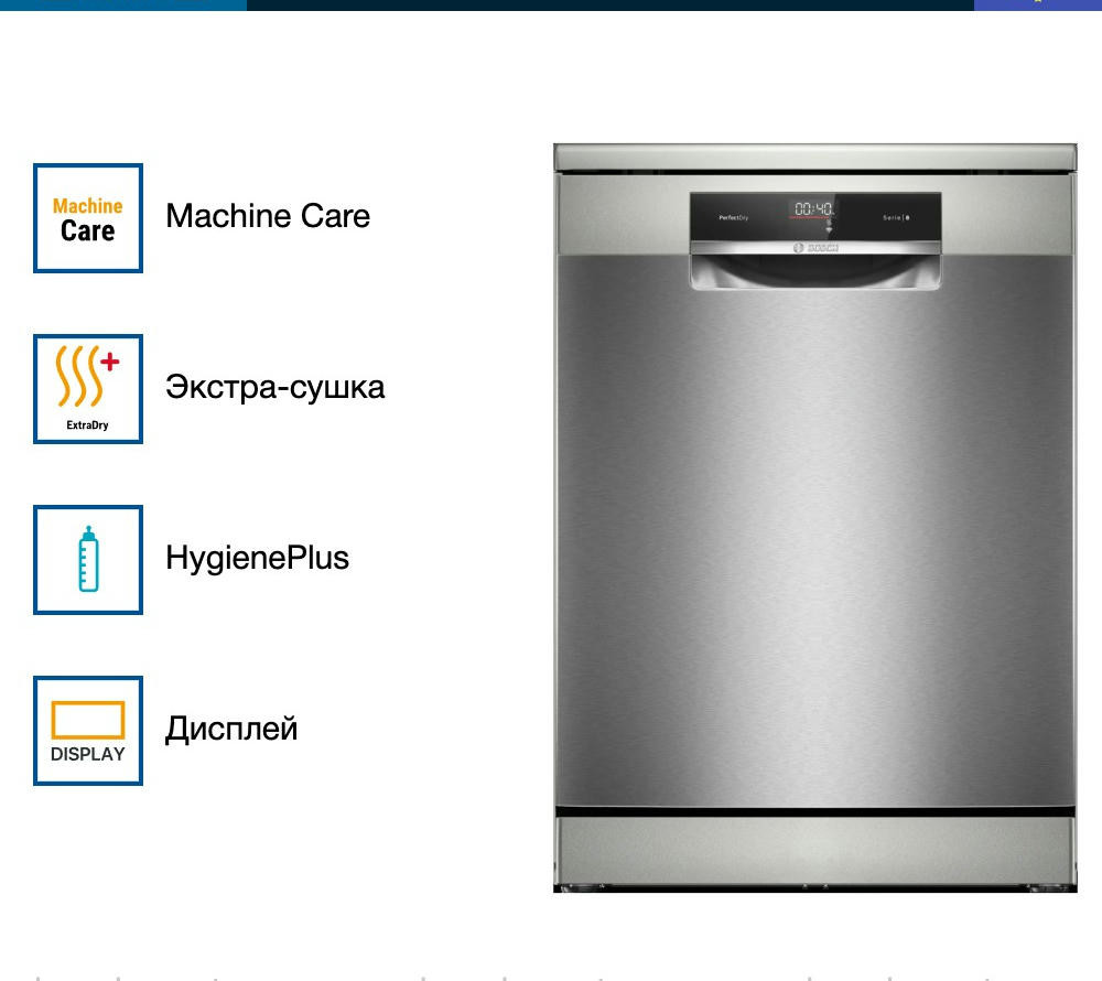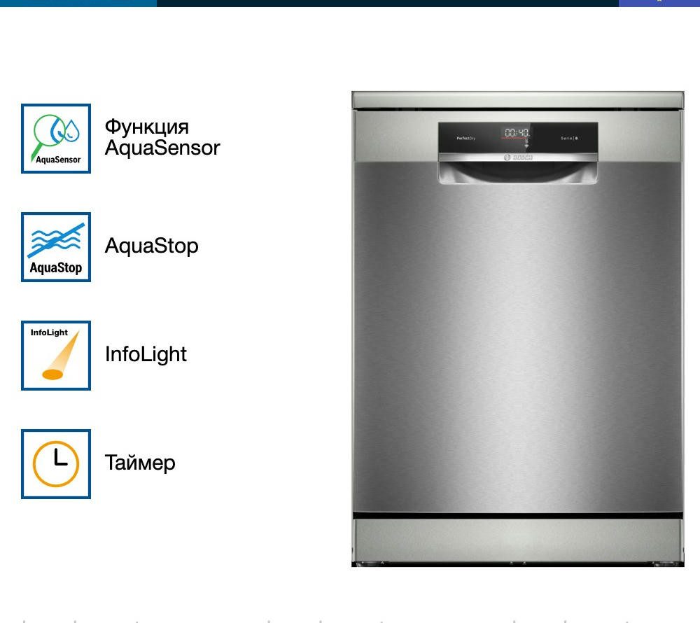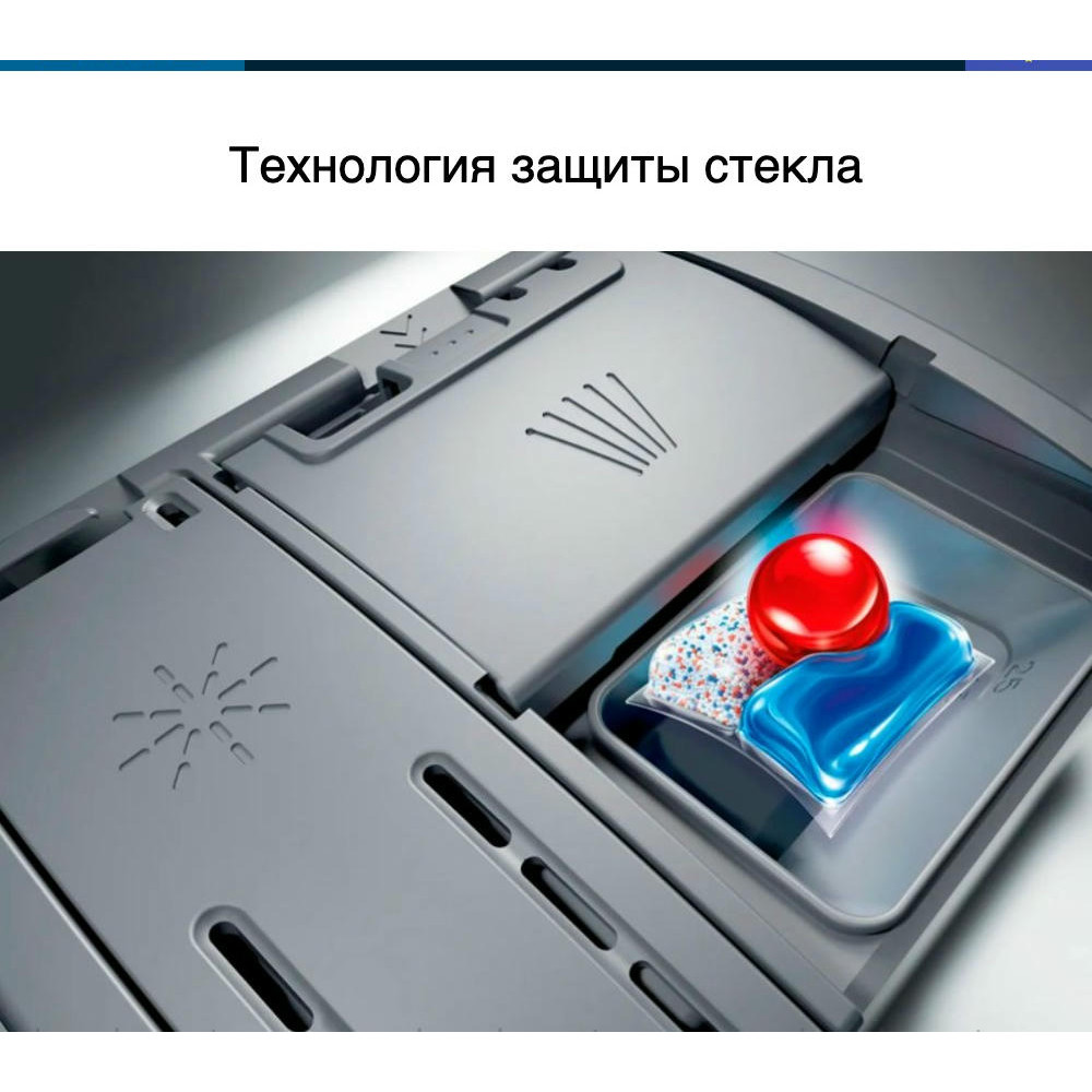 Машина оснащена открытой панелью управления с дисплеем и кнопками. С помощью приложения Home Connect вы можете управлять машиной дистанционно с вашего смартфона. Индикаторы наличия ополаскивателя и соли помогают контролировать их уровень. Также на полу проецируется индикатор InfoLight, который сигнализирует о том, что машина работает. Модель оснащена тремя корзинами, верхняя из которых регулируется по высоте. Верхний короб имеет шесть складных направляющих для тарелок и одну полочку для чашек, а нижний - восемь направляющих FLIPTINES для глубокой посуды и две полки для чашек. Это позволяет гибко организовать пространство внутри машины. Модель оборудована системой AquaStop, которая обеспечивает полную защиту от протечек. Внутренний резервуар выполнен из нержавеющей стали, что гарантирует его долговечность. Максимальная потребляемая мощность составляет 2400 Вт, а уровень шума - всего 43 дБ, что делает эту модель одной из самых тихих на рынке. Посудомоечная машина Bosch SMS8YCI03E - это надежный и функциональный помощник на вашей кухне, который обеспечит идеальную чистоту и блеск вашей посуды.