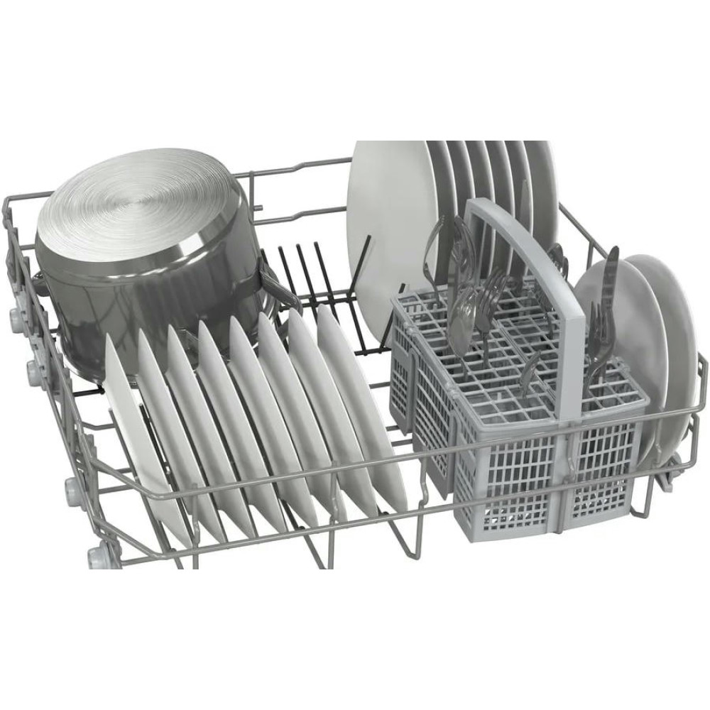Устройство имеет закрытую панель управления с интуитивно понятными кнопками и дисплеем. Индикаторы на панели информируют о наличии ополаскивателя и соли, а также о времени до окончания программы. Функция InfoLight проецирует луч на пол, показывая, что машина в работе. Для удобства пользователей предусмотрен таймер отсрочки запуска от 1 до 24 часов. Внутри машины находятся две корзины, верхняя из которых регулируется по высоте. В нижней корзине есть две складные направляющие для тарелок, а в верхней - две полочки для чашек.
