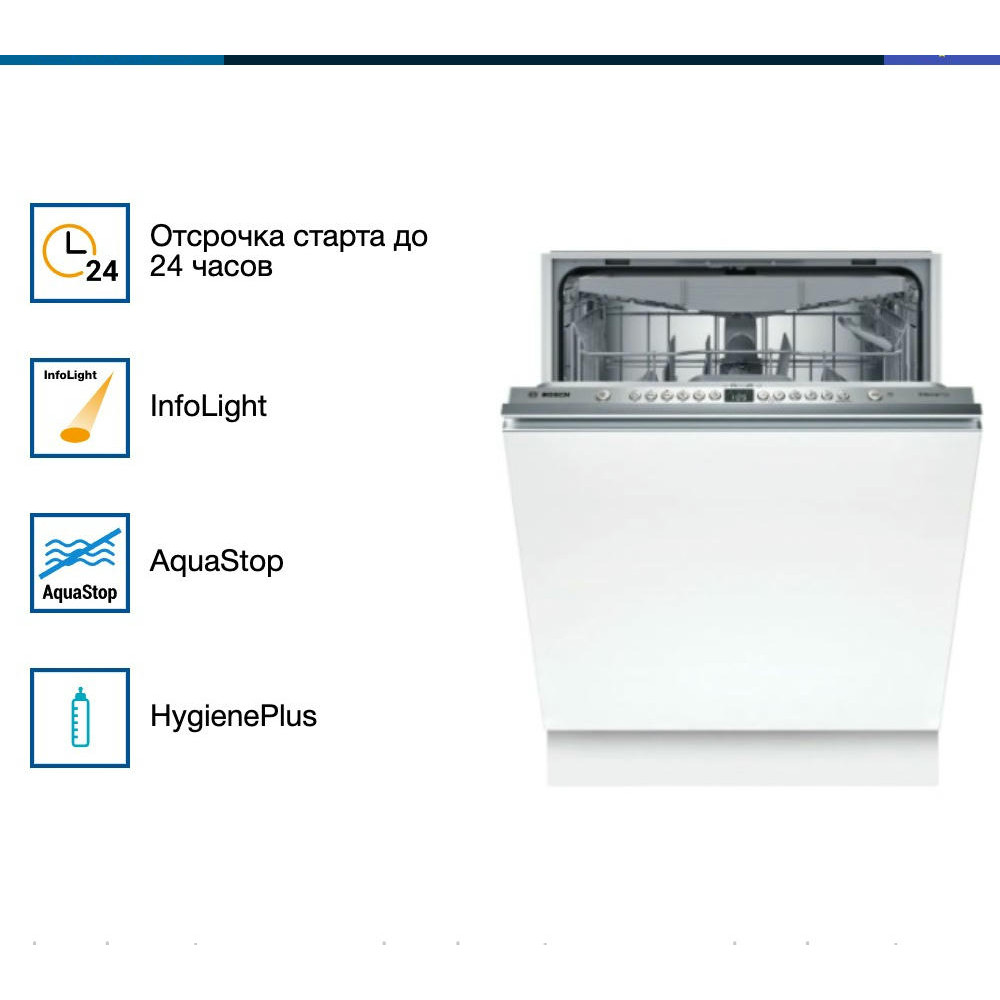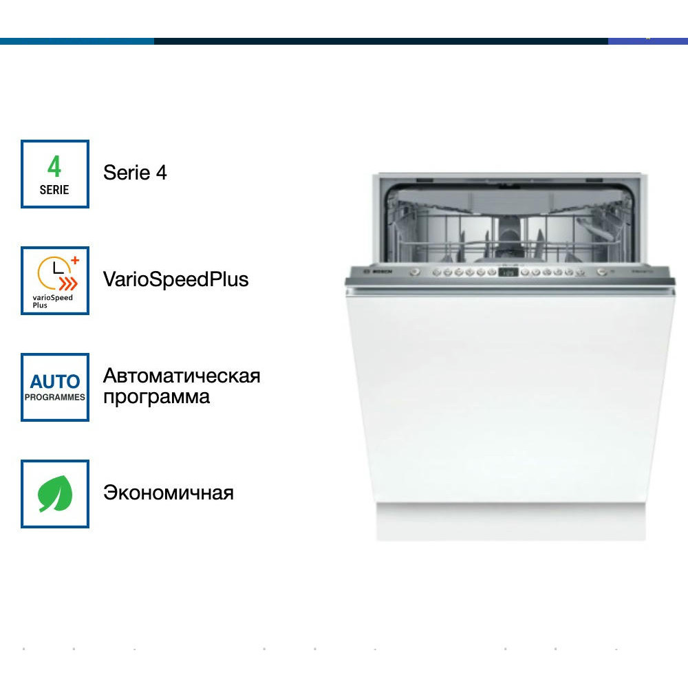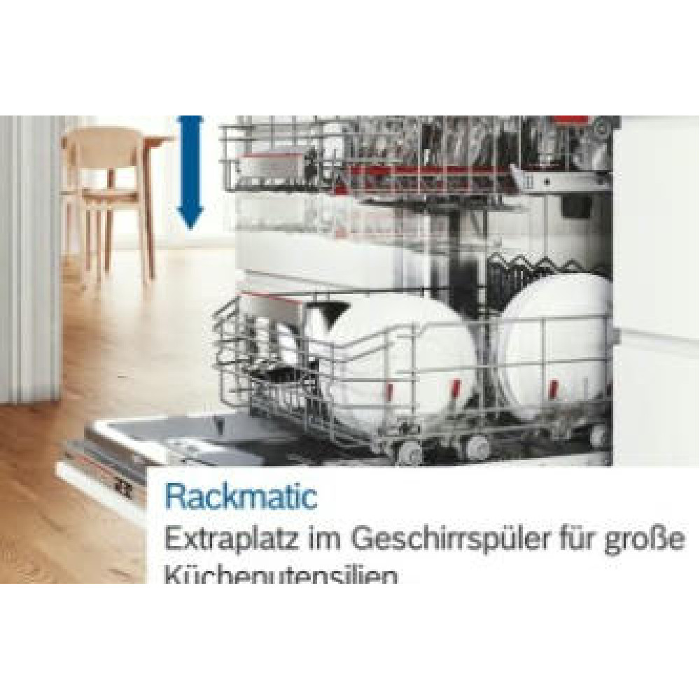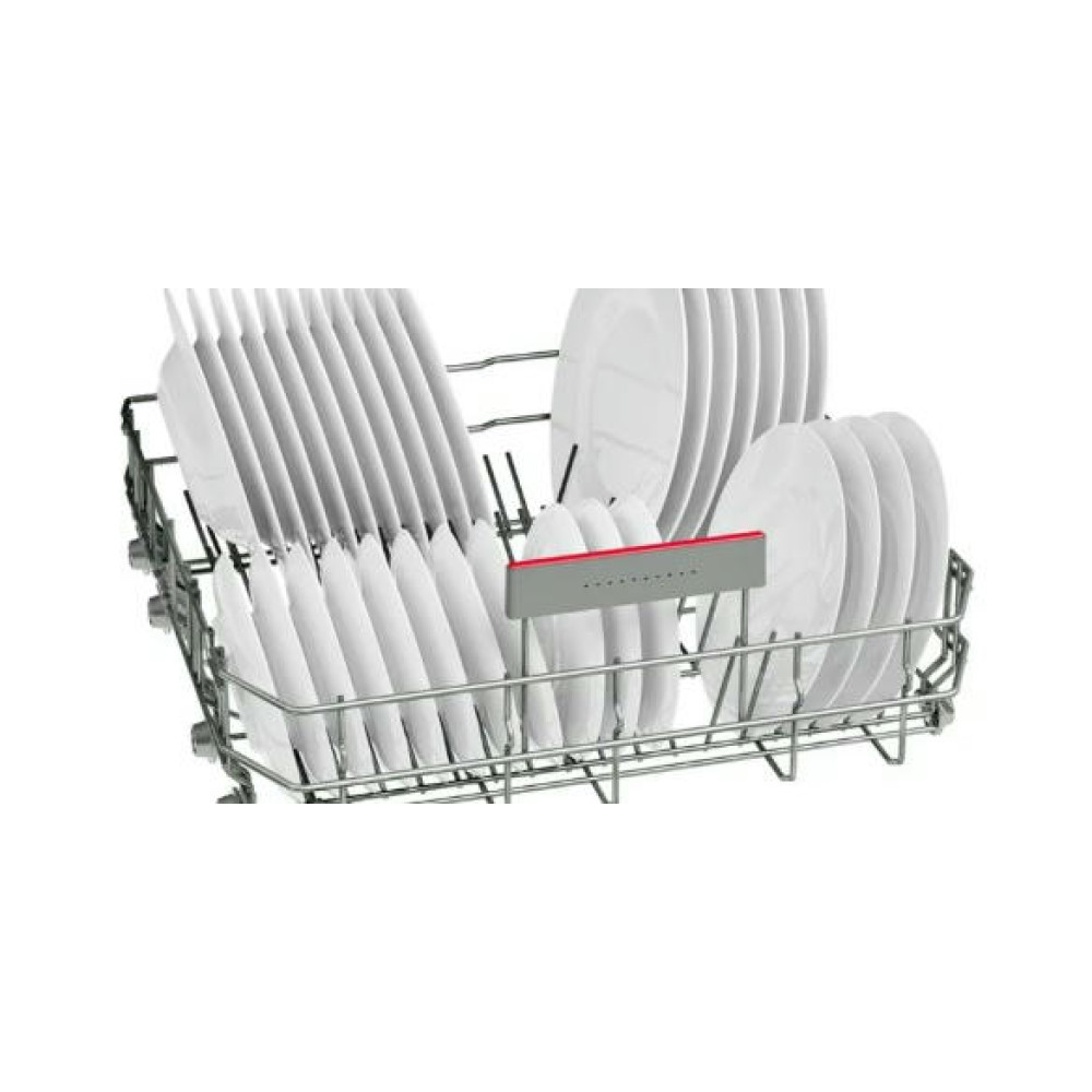 Посудомоечная машина Bosch SMV46KX04E оснащена индикатором InfoLight, он отображается на полу во время работу устройства. Вместимость до 13 комплектов посуды, подойдет для большой семьи. Инверторный двигатель Silence Drive сохранит тишину дома и сэкономит электроэнергию.