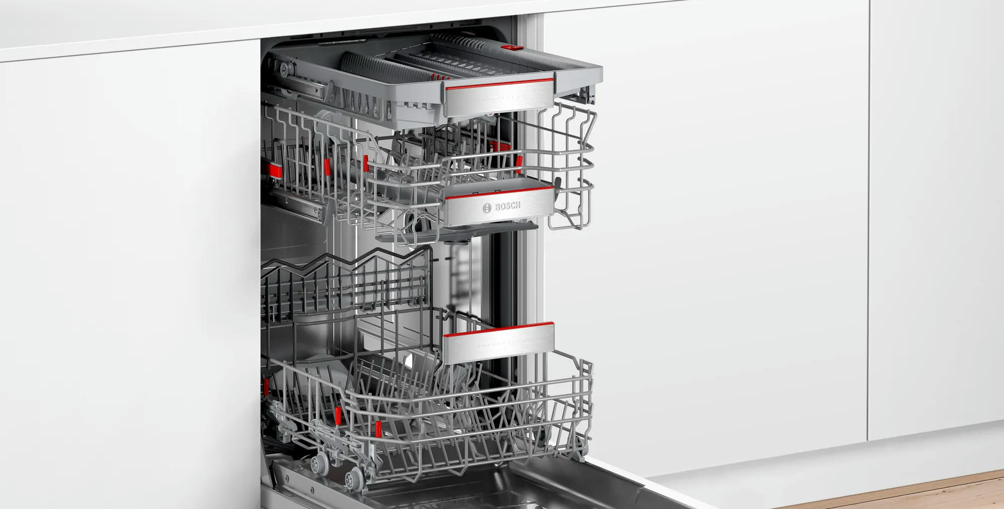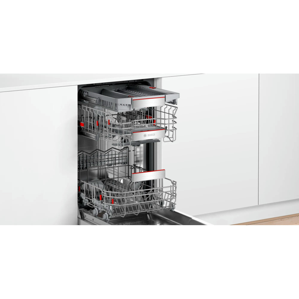 Посудомоечная машина Bosch SPI6ZMS35E имеет корзину для столовых приборов Vario Drawer Pro. С помощию Triple Rackmatik вы можете регулировать высоту посуды при полной загруженной верхней корзине. Функция «любимая программа» вы можете настроить свои любимые программы и включать их через приложение Home connect.