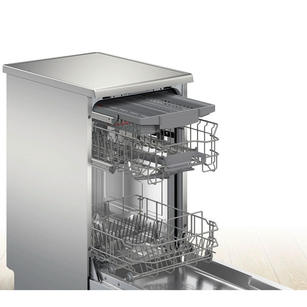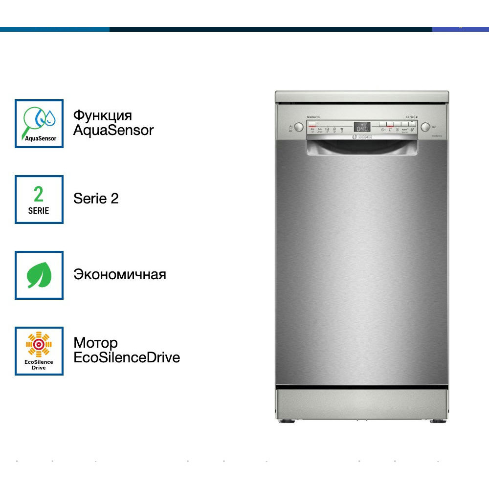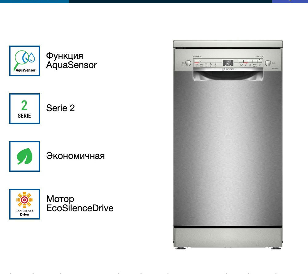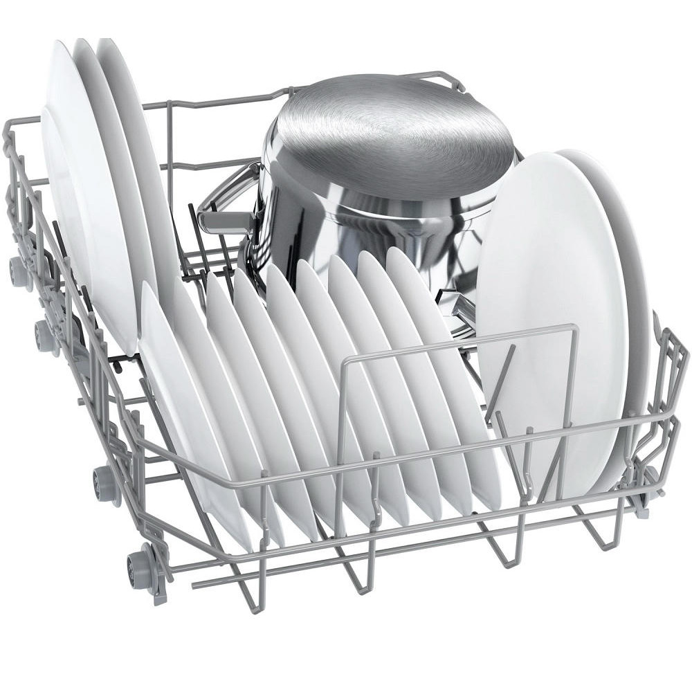 Посудомоечная машина Bosch SPS2HMI54Q — это современное решение для бытовых нужд. Она отличается элегантным белым цветом, который легко впишется в любой интерьер. Эта модель относится к серии Serie | 2 и оснащена открытой белой панелью управления с дисплеем и кнопками. Машина обладает широким выбором программ мытья — их всего 5, каждая из которых предназначена для определенного типа посуды и степени загрязнения. Среди них есть автоматическая, быстрая, экономичная, интенсивная и ночная. При этом, благодаря функции половинной загрузки, можно экономить воду и электроэнергию, если машина заполнена не полностью.