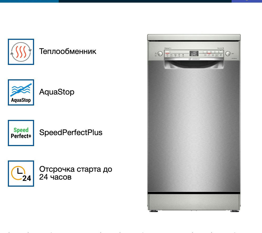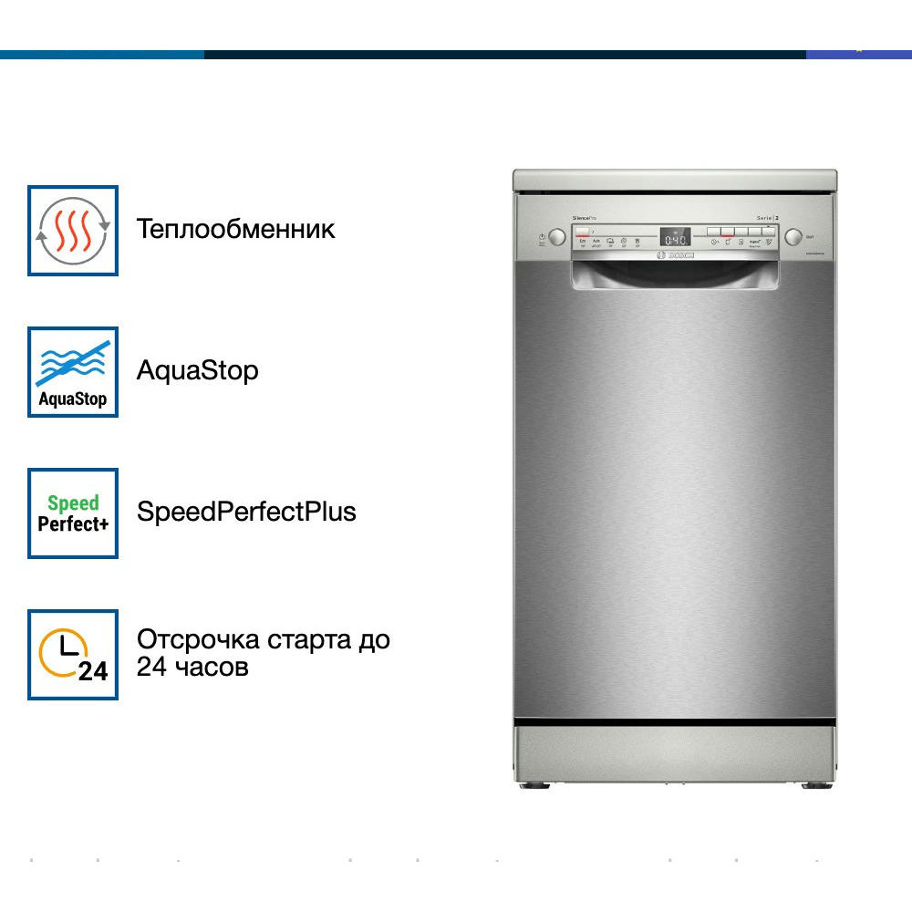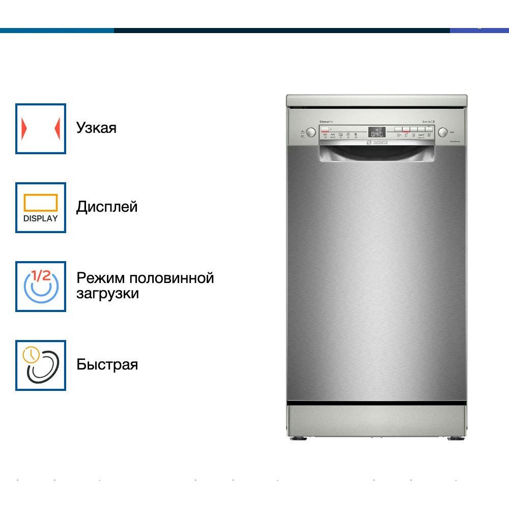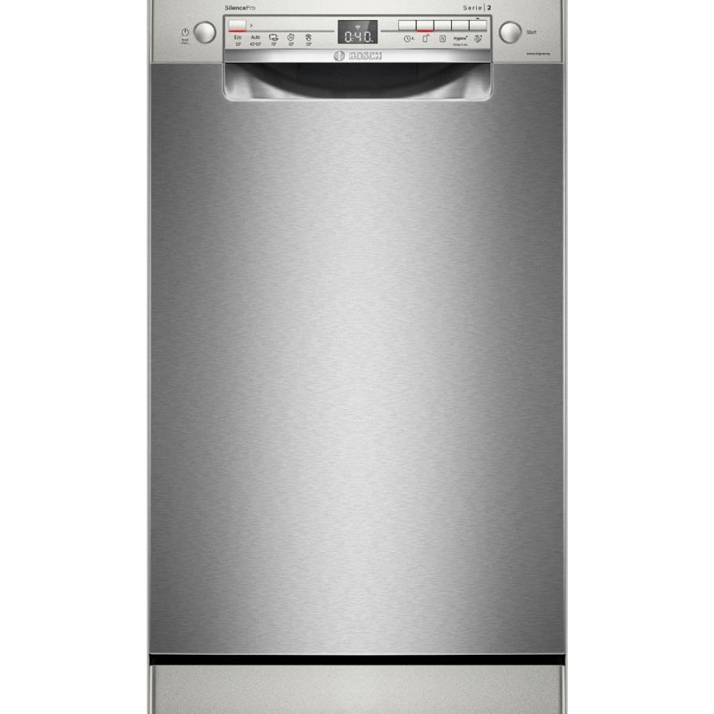 Посудомоечная машина Bosch SPS2HMI54Q — это современное решение для бытовых нужд. Она отличается элегантным белым цветом, который легко впишется в любой интерьер. Эта модель относится к серии Serie | 2 и оснащена открытой белой панелью управления с дисплеем и кнопками. Машина обладает широким выбором программ мытья — их всего 5, каждая из которых предназначена для определенного типа посуды и степени загрязнения. Среди них есть автоматическая, быстрая, экономичная, интенсивная и ночная. При этом, благодаря функции половинной загрузки, можно экономить воду и электроэнергию, если машина заполнена не полностью.