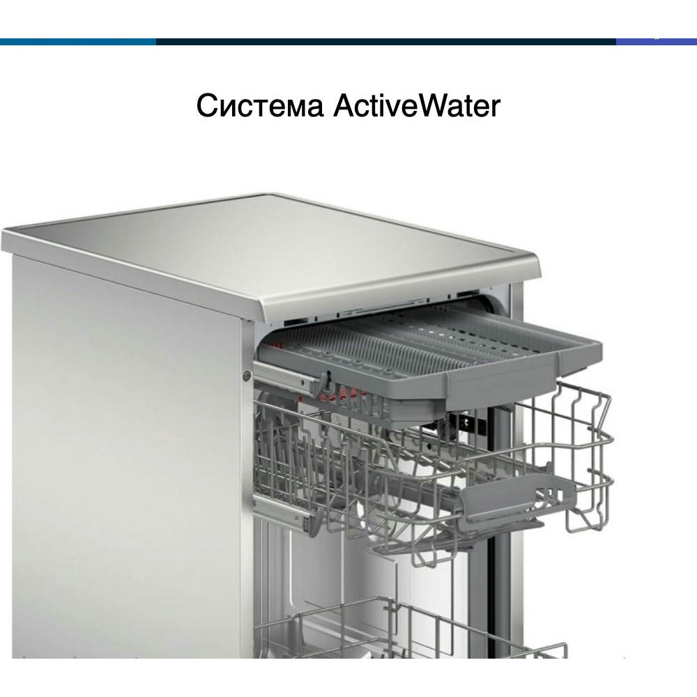 Благодаря инверторному двигателю EcoSilence Drive, машина работает очень тихо, создавая уровень шума всего 43 дБ. Также машина оснащена системой ActiveWater, которая оптимизирует расход воды, делая его минимальным — всего 9.5 литров на цикл. Модель оснащена тремя корзинами для посуды, верхняя из которых регулируется по высоте. Интерьер машины выполнен из нержавеющей стали, что обеспечивает долговечность и надежность. Также функцией HygienePlus, которая обеспечивает высокий уровень гигиены благодаря дополнительному ополаскиванию горячей водой. А технология SpeedPerfectPlus значительно сокращает время мытья посуды, не ущемляя при этом качества очистки.