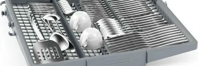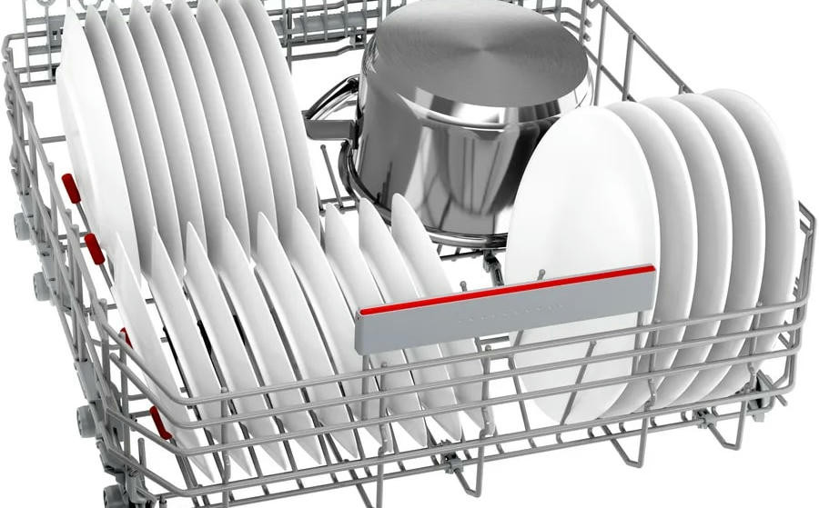 Продуманная организация внутреннего пространства включает три корзины с системой Rackmatic-3 для регулировки верхнего уровня, складные направляющие для тарелок (2 и 6 складных элементов в коробах) и дополнительные полочки для чашек как в верхнем, так и в нижнем отделениях, что делает размещение столовой посуды гибким и экономным.