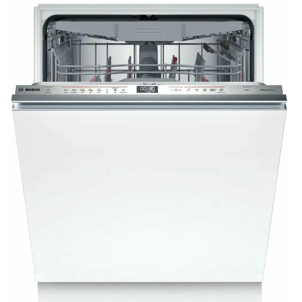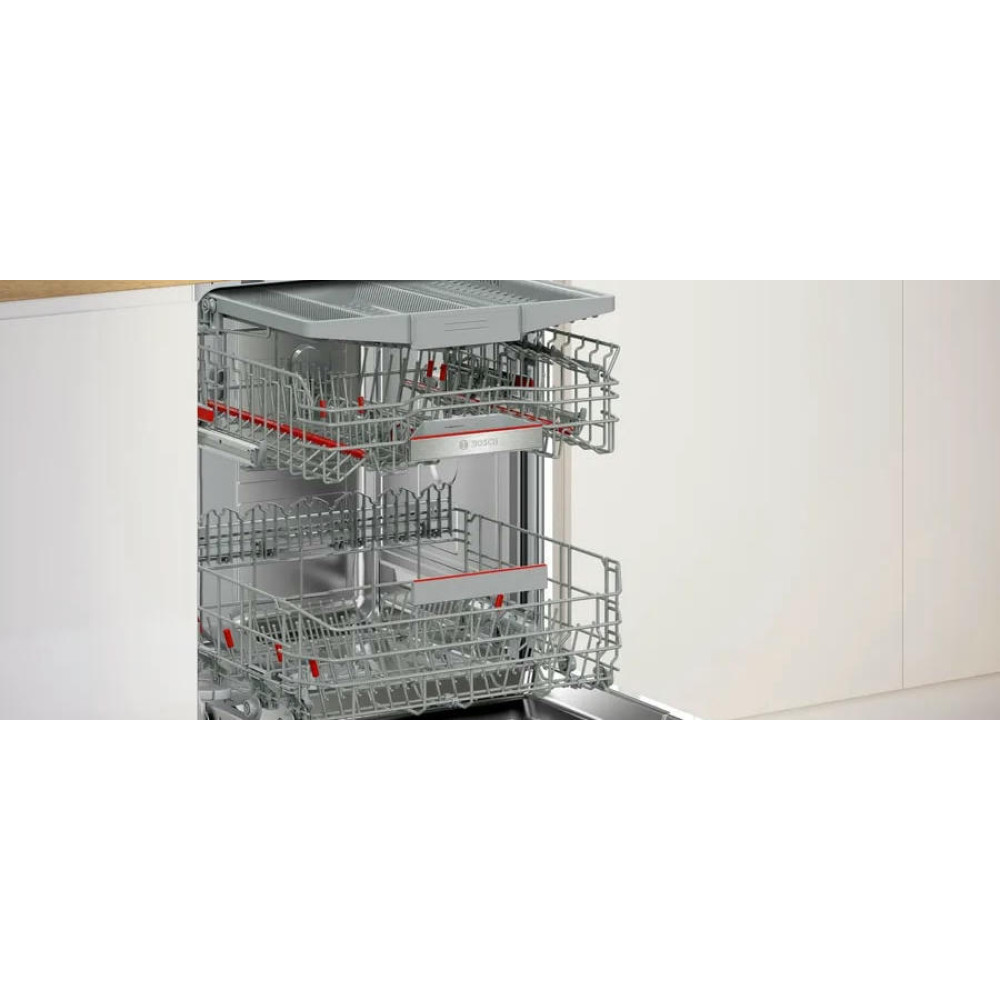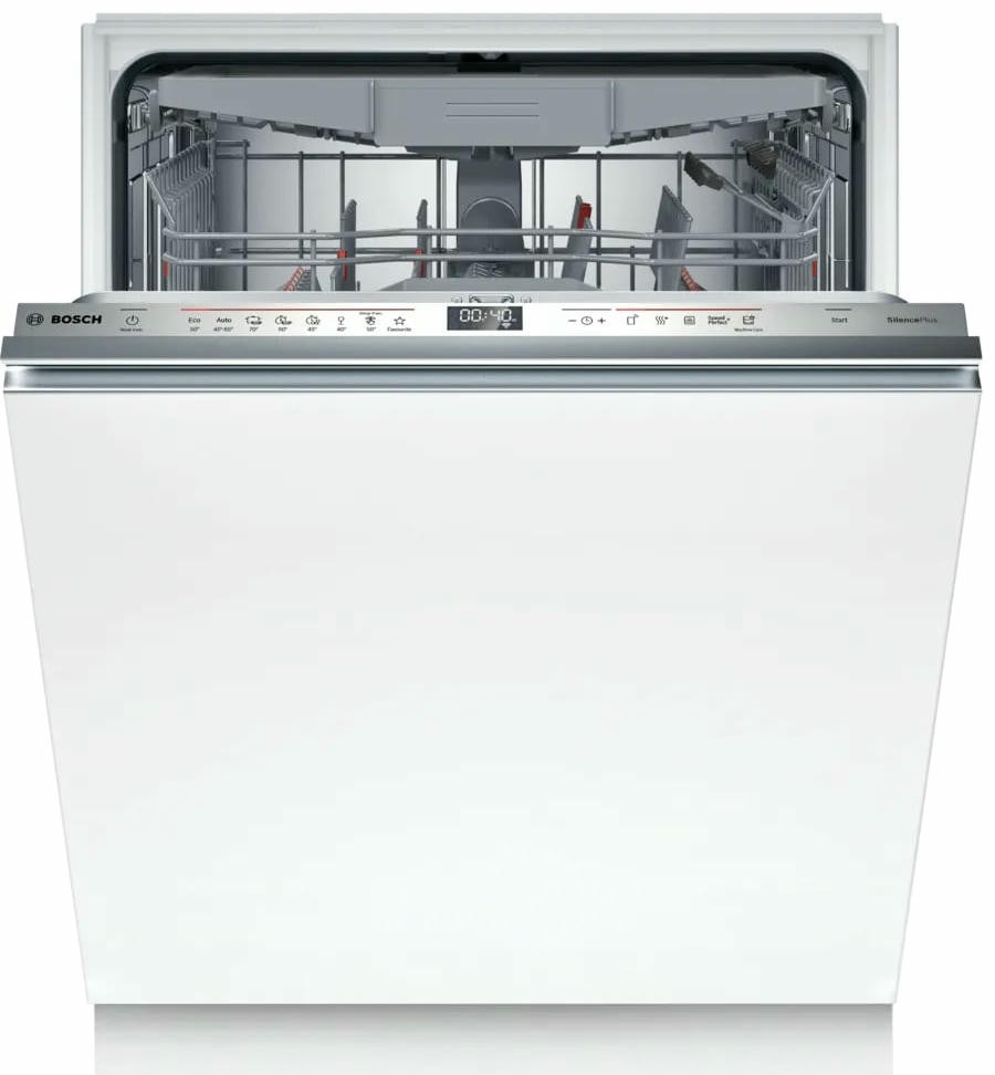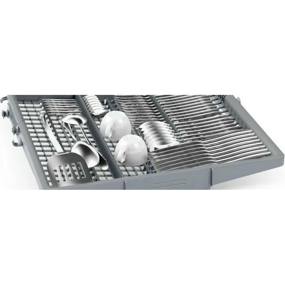 Встраиваемая посудомоечная машина Bosch SBD6ECX12E имеет инверторный мотор EcoSilence Drive он обеспечивает тихую работу на уровне 42 дБ и длительную службу без лишних вибраций; тепловой обменник обеспечивает мягкую и эффективную сушку, а проточный нагревательный элемент быстро готовит воду к оптимальной температуре. Набор программ охватывает основной спектр задач — экономичный, ночной, быстрый, интенсивный, специализированный режим для хрупкой посуды Glass 40°C, опция половинной загрузки и персонализированная MyProgram для сохранения выбранных настроек. Для особо тщательной обработки предусмотрен режим HygienePlus, отдельная IntensiveZone усиливает напор в нижней корзине, а функция SpeedPerfectPlus сокращает длительность цикла без значительных потерь в качестве мытья.