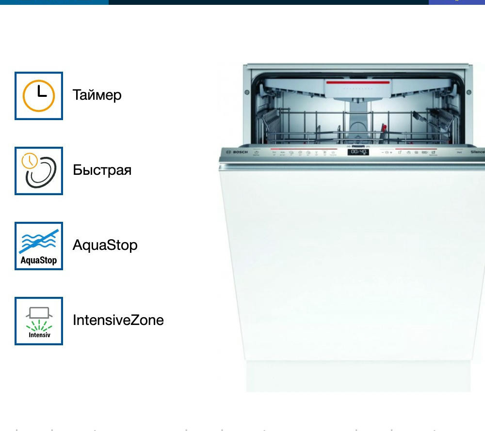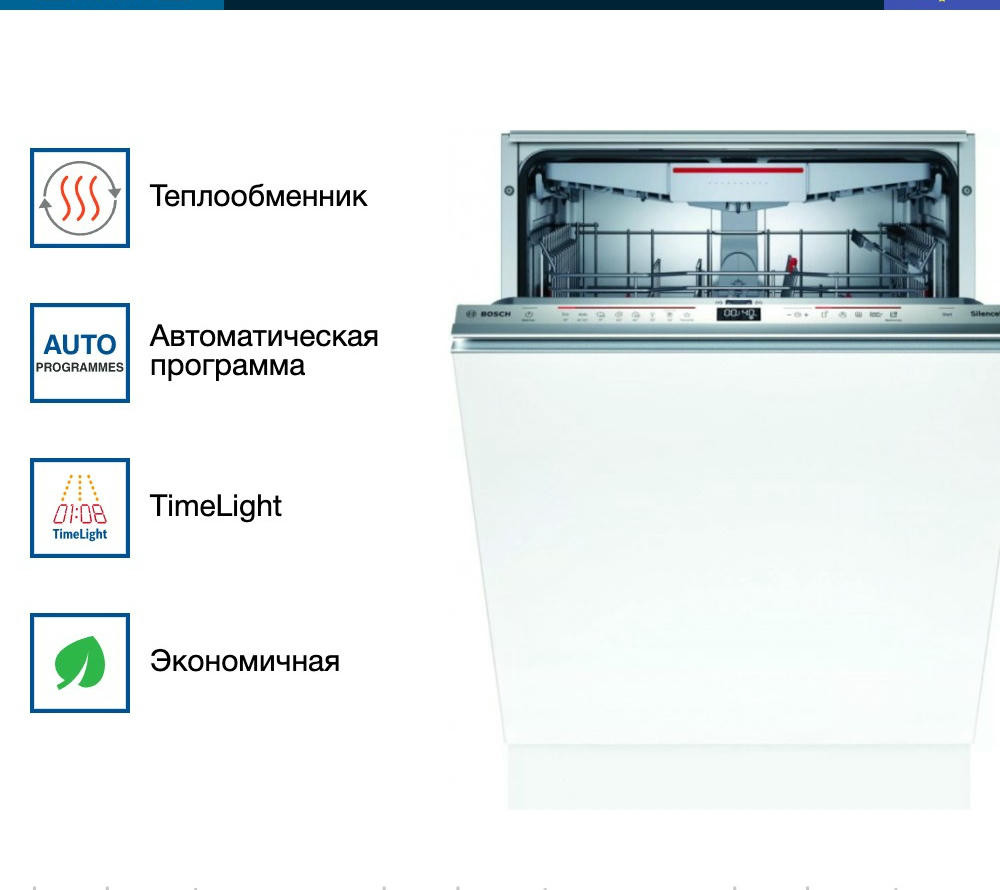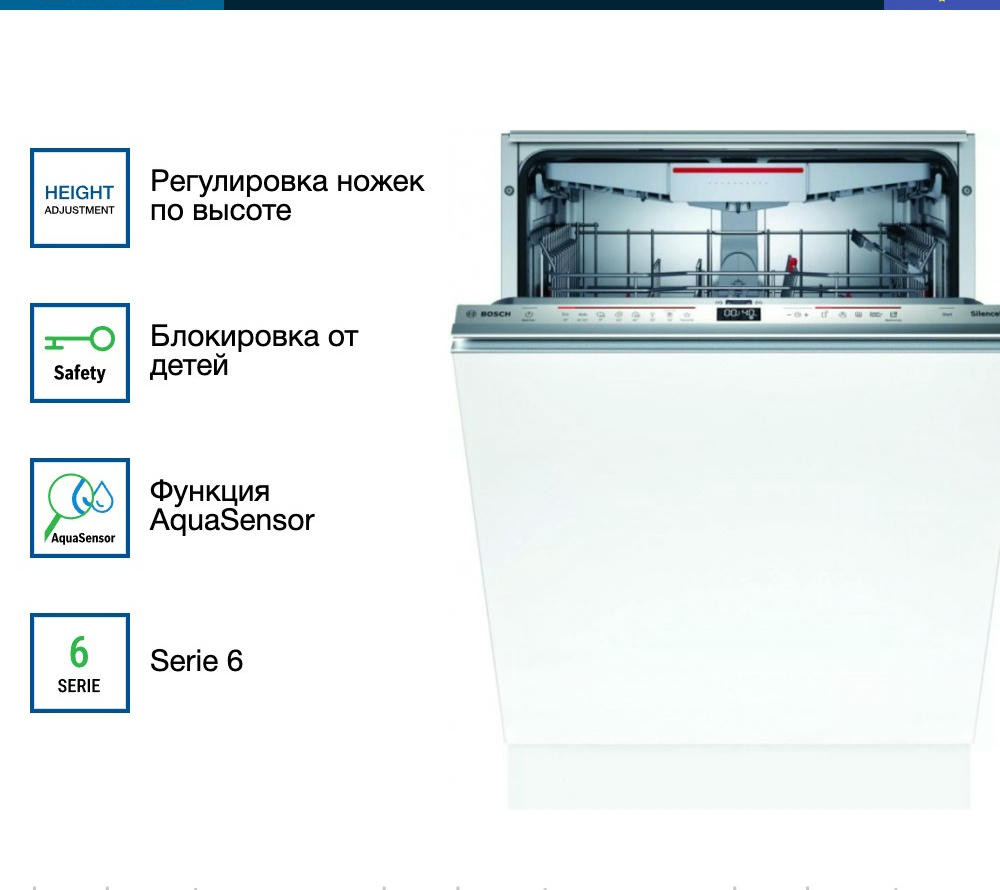 Встраиваемая посудомоечная машина Bosch SBD6ECX57E оснащена полной защитой от протечек, в случае утечки произойдет полное перекрытие воды. Имеется луч на полу InfoLight, он означает что устройство работает. Функция Home connect позволяет дистанционно отслеживать состояние вашего прибора и задавать настройки.
