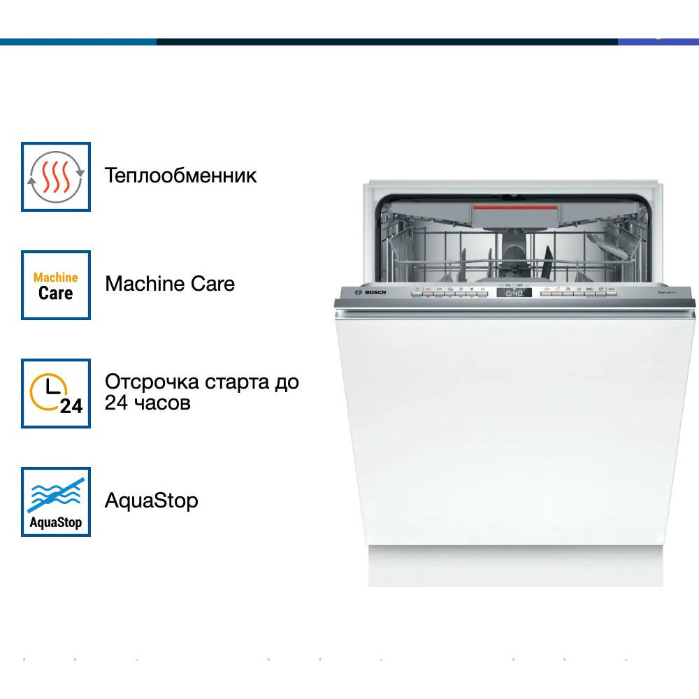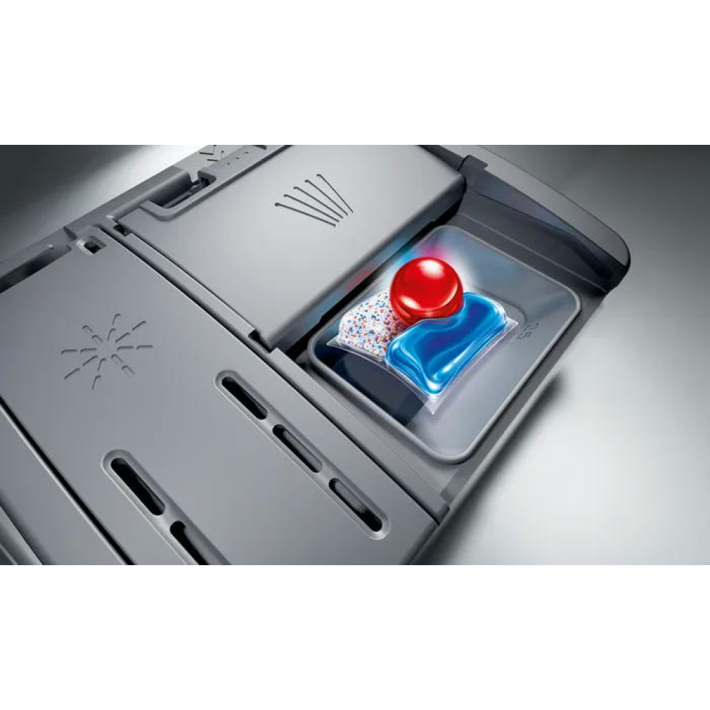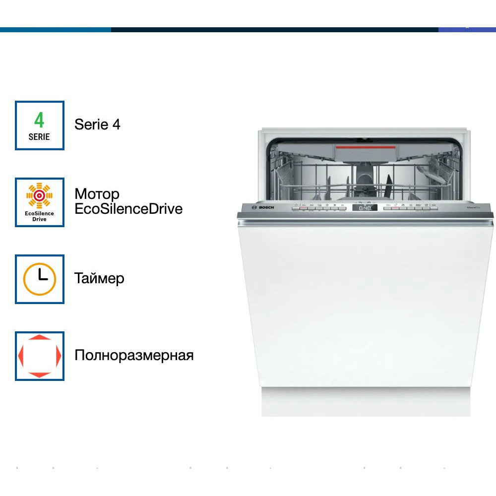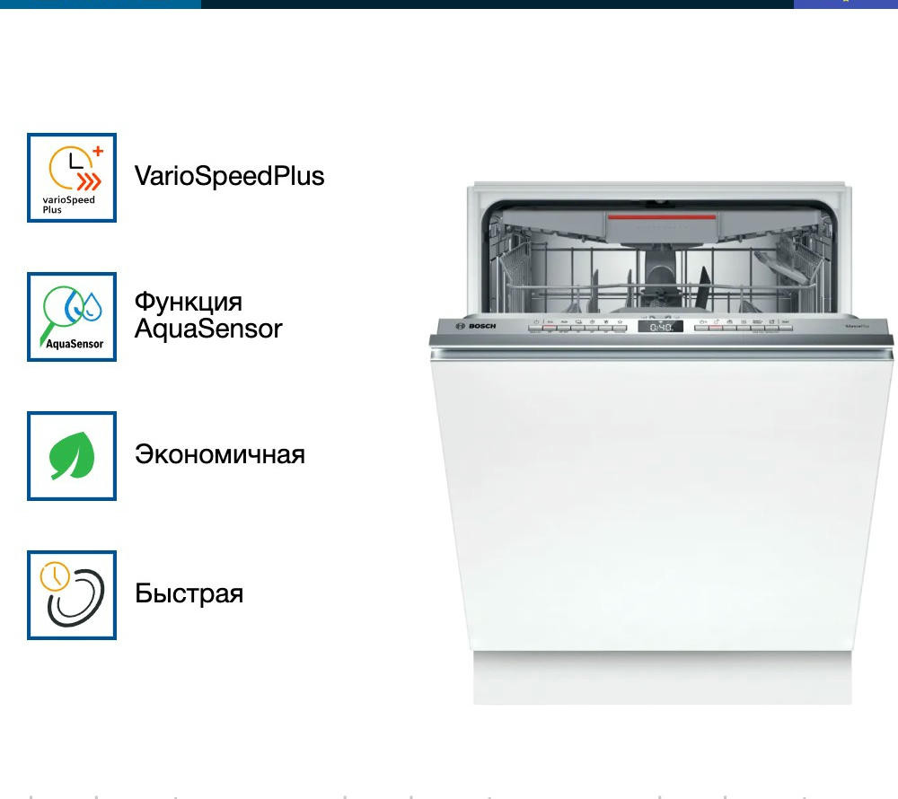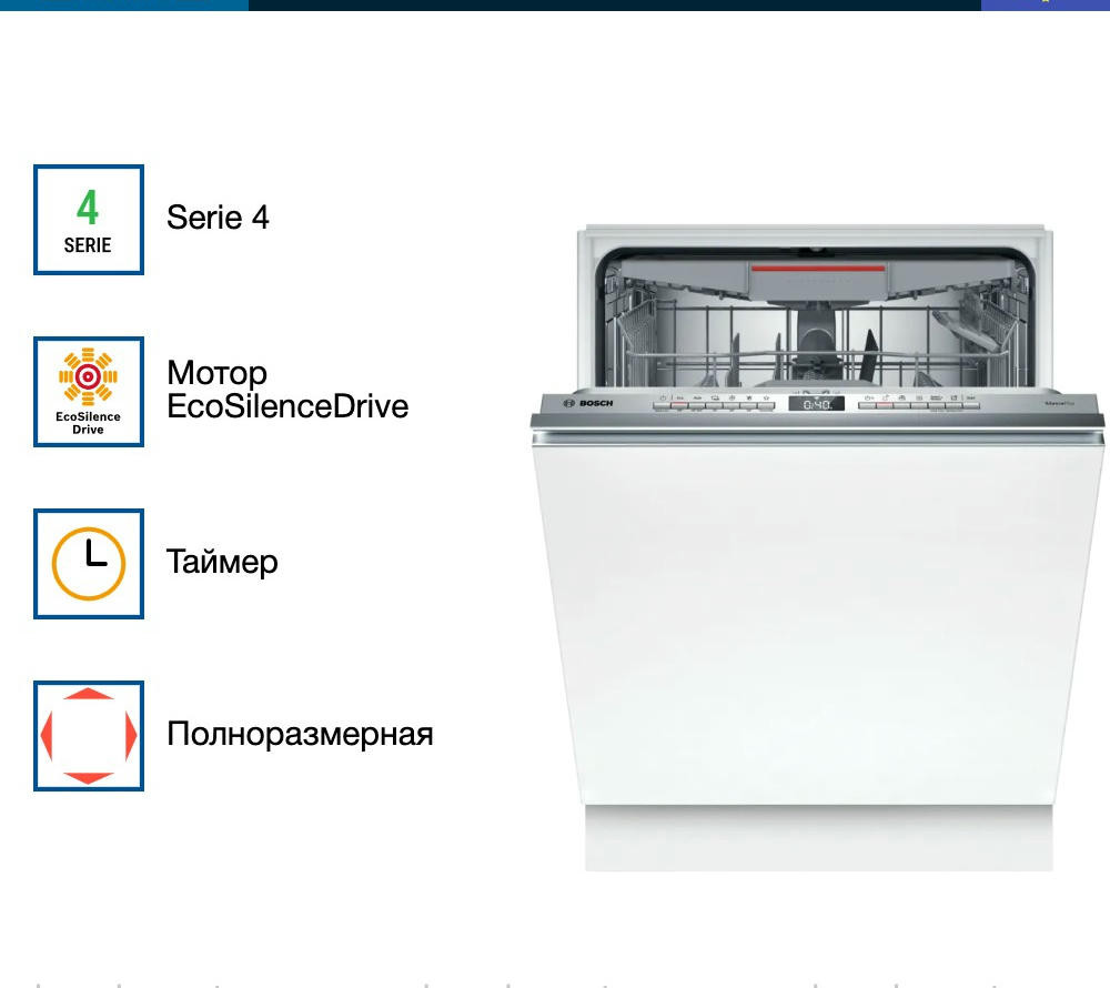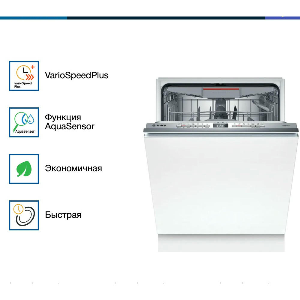 Встраиваемая посудомоечная машина Bosch SBH4ECX10E — это высококачественный и многофункциональный помощник на кухне. Произведенная в Евросоюзе, она отличается превосходным качеством сборки и использованием современных технологий. Дизайн машины выполнен в классическом стиле, что позволяет ей гармонично вписаться в интерьер любой кухни. Панель управления, выполненная из нержавеющей стали, не только придает модели элегантный вид, но и обеспечивает ее долговечность. Машина оснащена инверторным двигателем EcoSilence Drive, который обеспечивает тихую и эффективную работу. Благодаря этому, уровень шума составляет всего 42 дБ, что позволяет использовать машину даже ночью без беспокойства о том, что она помешает отдыху. Вместительность устройства составляет 14 комплектов посуды, что делает его идеальным выбором для больших семей. Машина предлагает шесть стандартных программ мытья и четыре температурных режима, позволяя выбрать наиболее подходящий режим для различных типов посуды и степени ее загрязнения. Особенностью модели является функция VarioSpeedPlus, которая позволяет ускорить процесс мытья до трех раз, сохраняя при этом отличное качество. Также стоит отметить наличие системы AquaStop, которая обеспечивает полную защиту от протечек. Модель оснащена функцией автооткрывания дверцы после окончания программы, что способствует более эффективной сушке посуды. Система Machine Care помогает поддерживать машину в чистоте и продлевает ее срок службы. Посудомоечная машина Bosch SBH4ECX10E оснащена функцией Home Connect, которая позволяет управлять устройством с помощью смартфона. Это очень удобно, так как позволяет запускать и контролировать процесс мытья даже на расстоянии.
