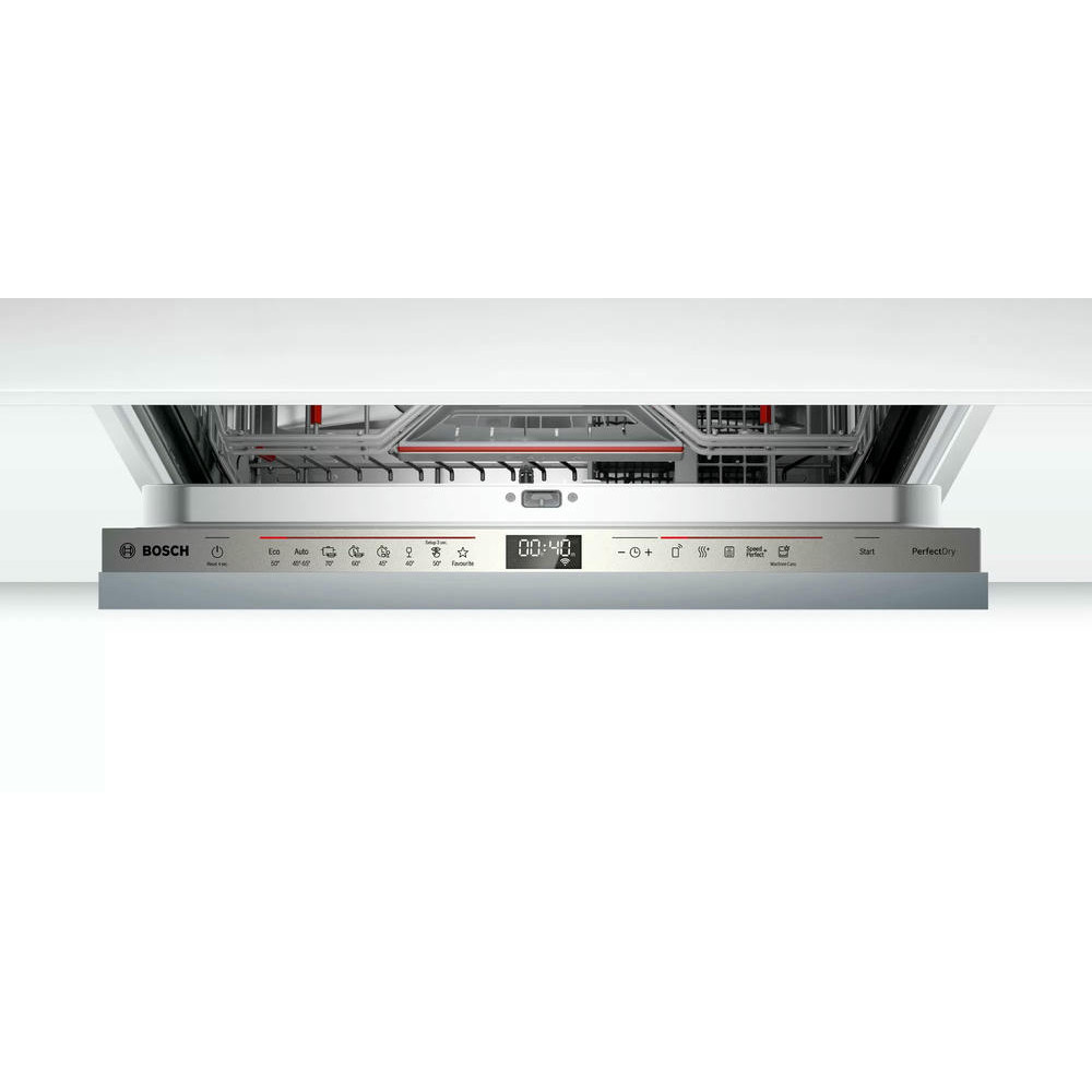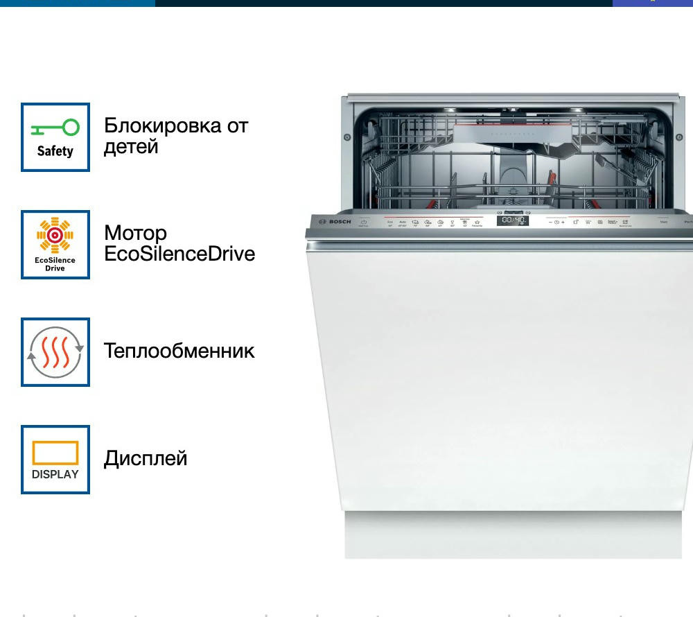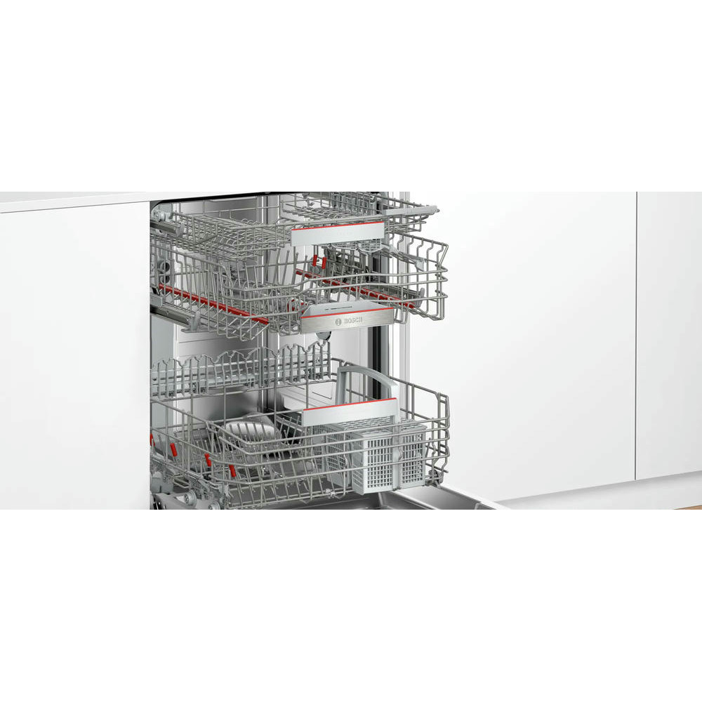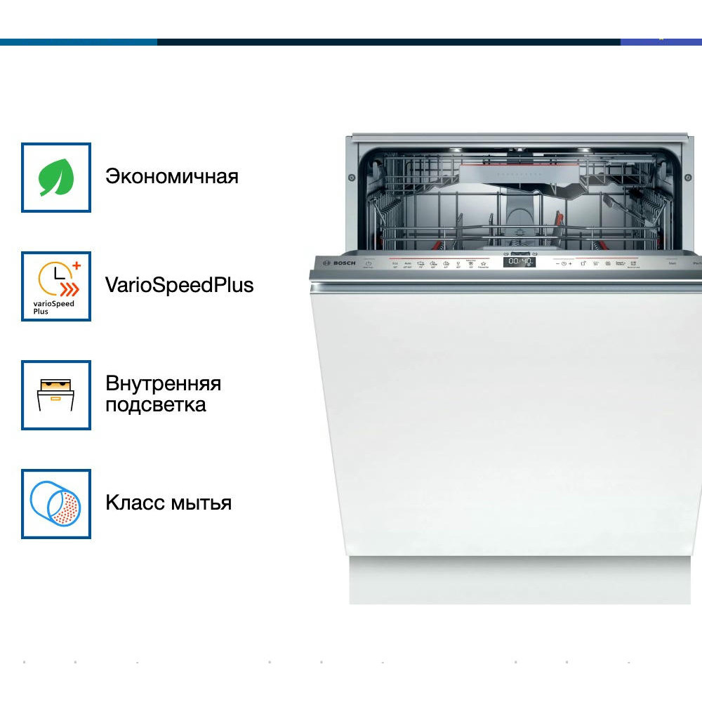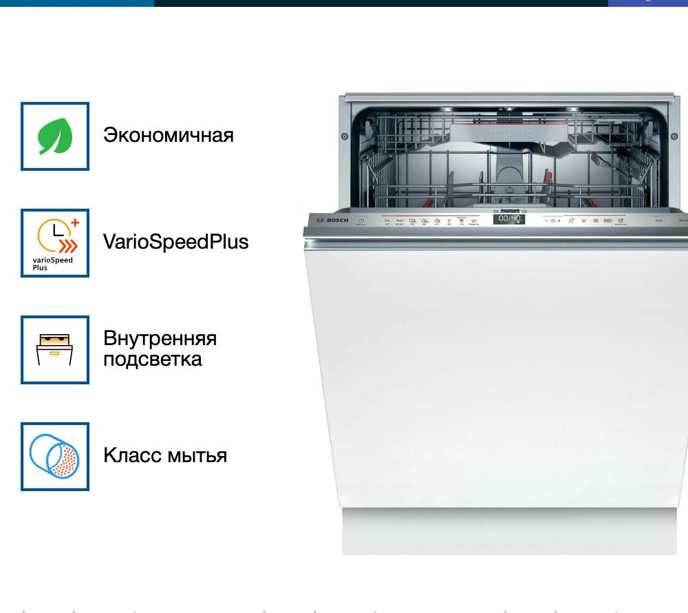 Встраиваемая посудомоечная машина Bosch SMD6ZDX49E оснащена программой Home Connect, теперь вы можете управлять устройством с помощью вашего смартфона. Имеется третья корзина для столовых приборов. Специальный индикатор Time Light отображается на полу во время работы, он показывает время до окончания мытья.